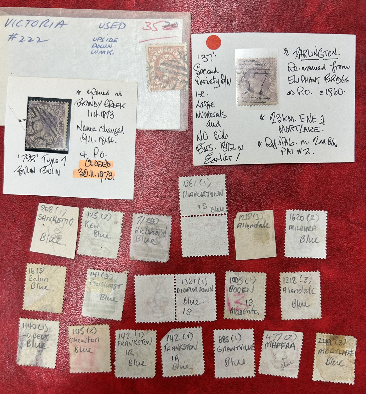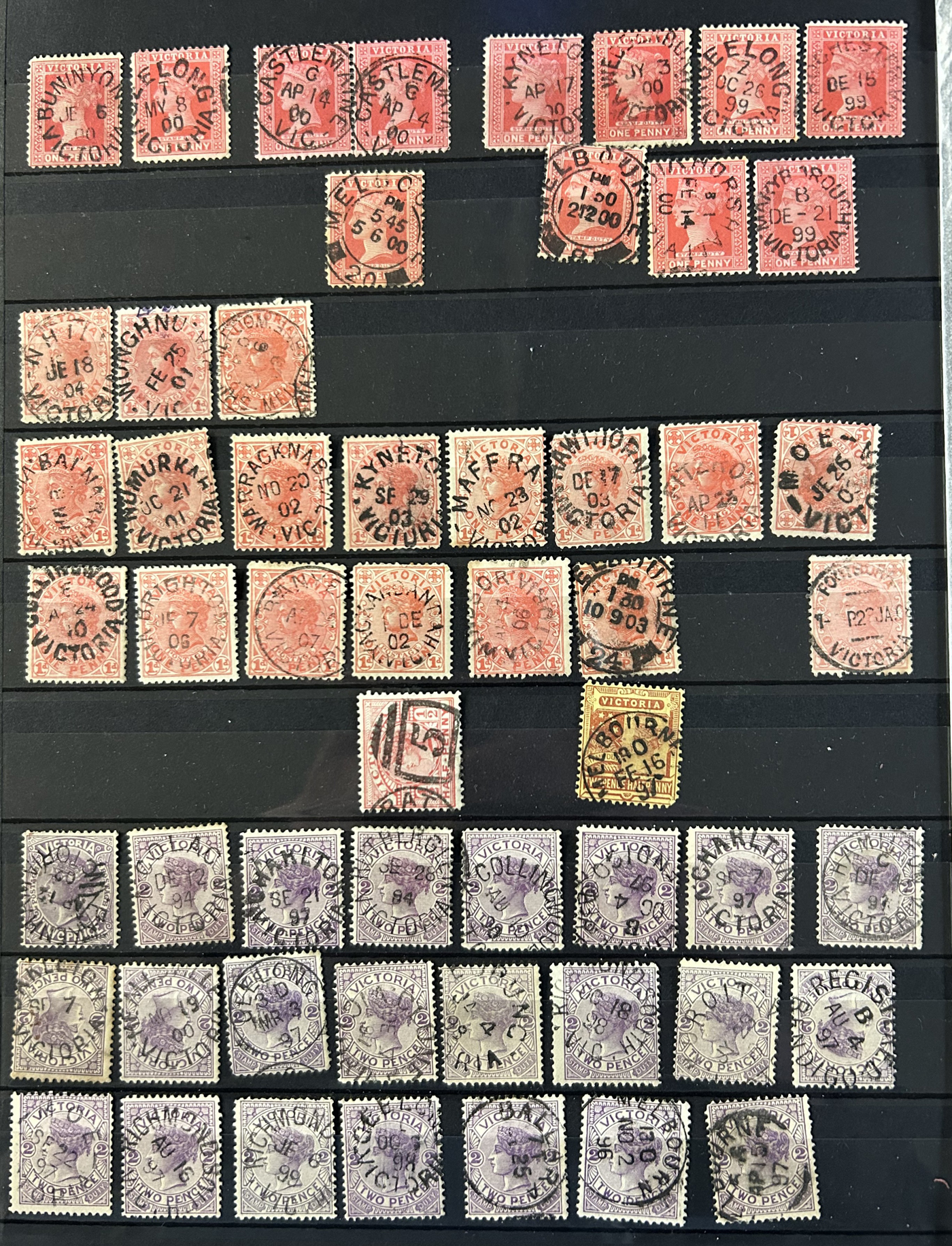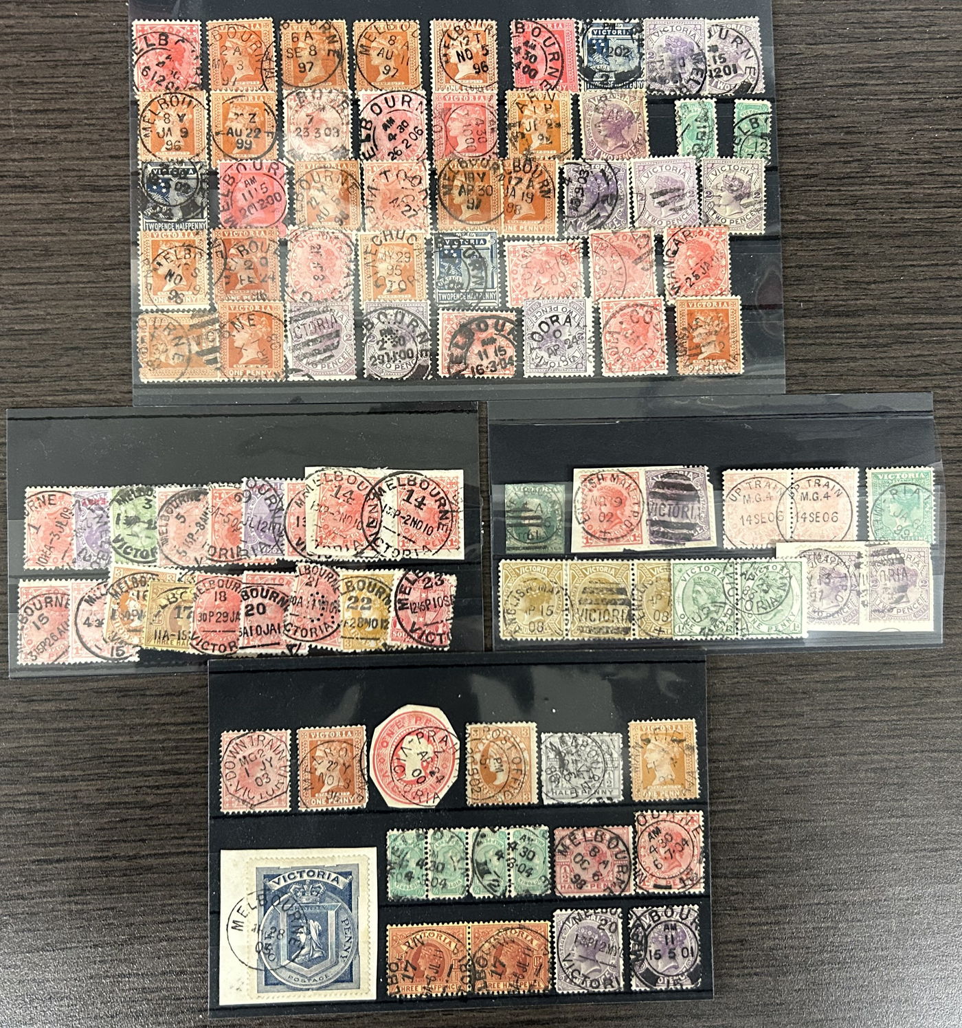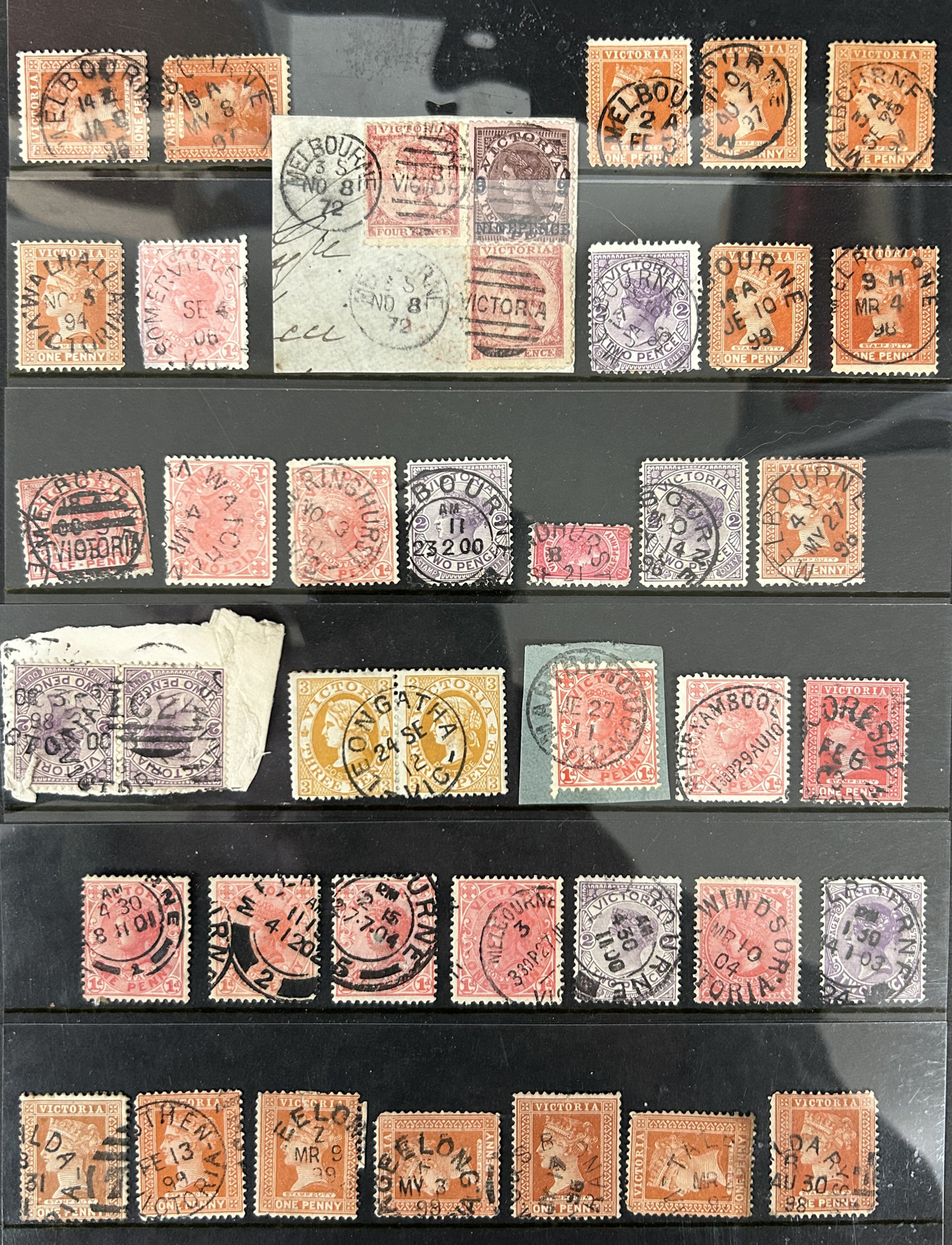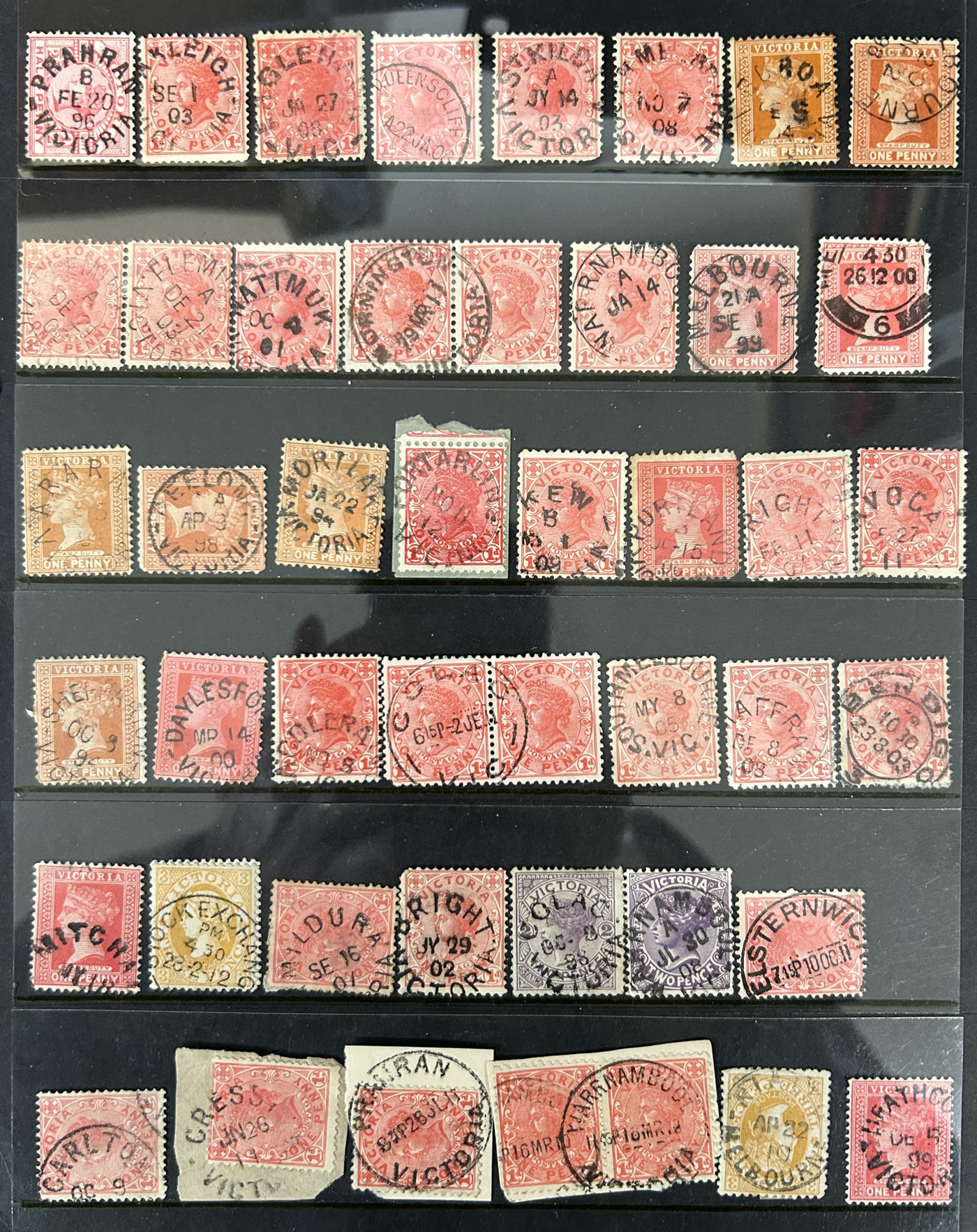 1246 O Victoria imageLarge Collection / Accumulation of Victoria Town Postmarks on Victoria Stamps, filling 6 black stock sheets, 4 small stock cards, 11 stockbook pages, 2 album pages, plus glassines and envelopes full. The lot contains specialized Melbourne c.d.s. studies as well as hundreds of different town postmarks (many small towns) on many different stamp issues, including higher catalogue ones. One glassine contains only Tasmania postmarks on Victoria stamps. Probably a few thousand stamps in all, with a good proportion being socked on the nose strikes. See our pictures for a sampling. (Scan 1) (Scan 2) (Scan 3) (Scan 4) (Scan 5) (Scan 6) (Scan 7) (Scan 8) (Scan 9) (Scan 10) (All Scans)