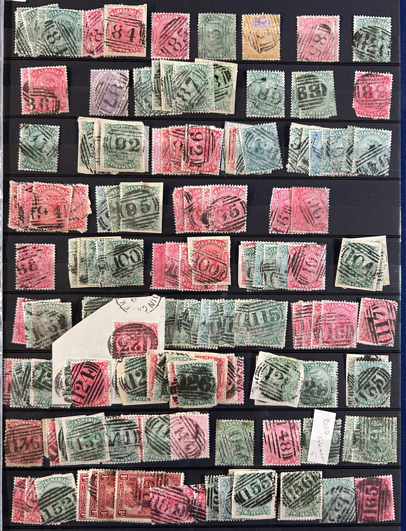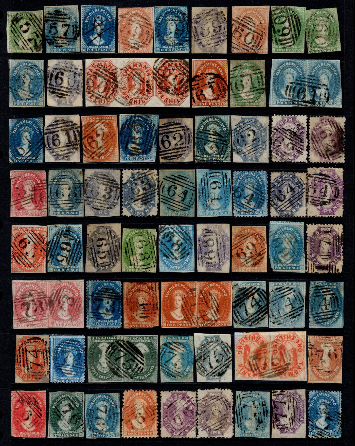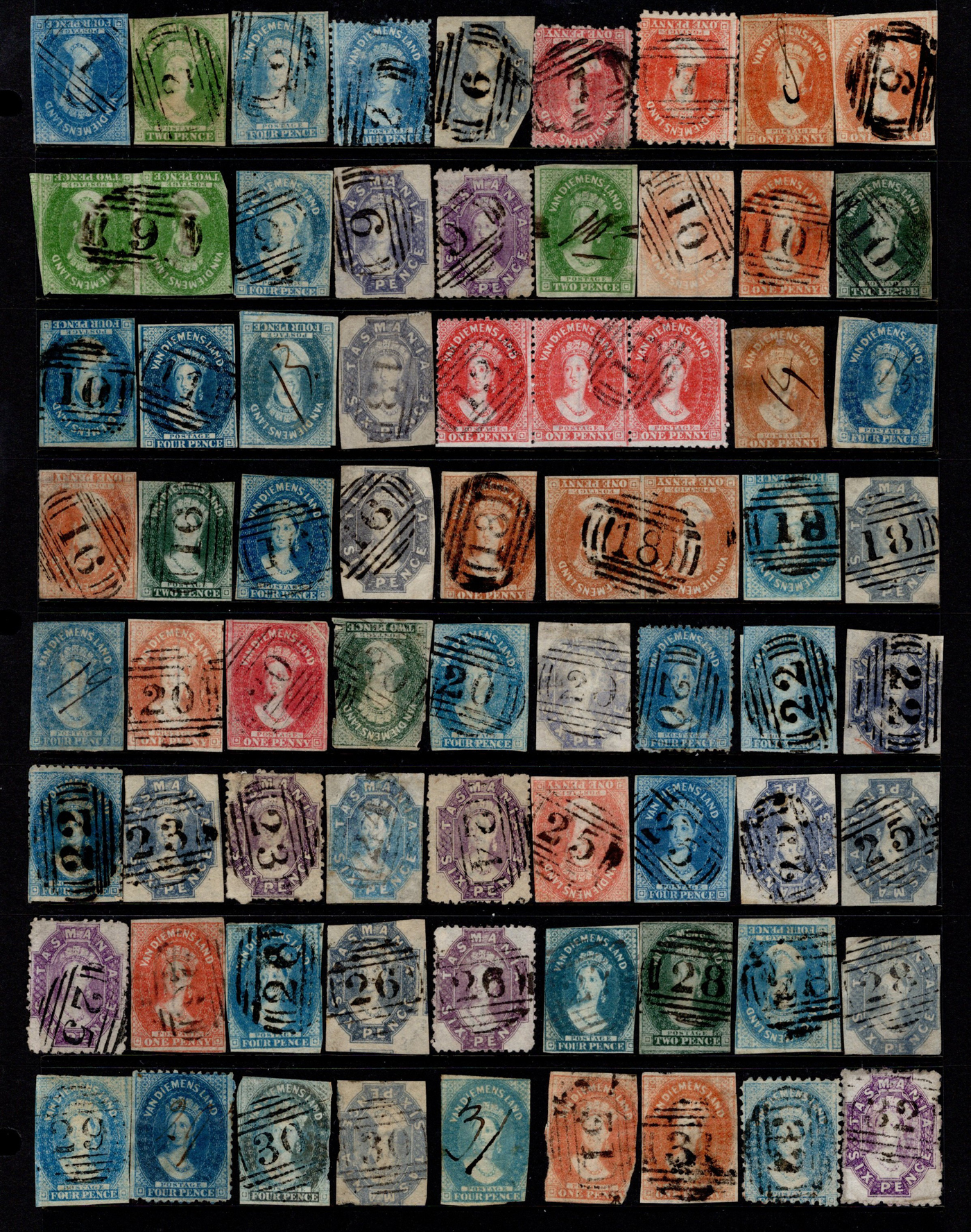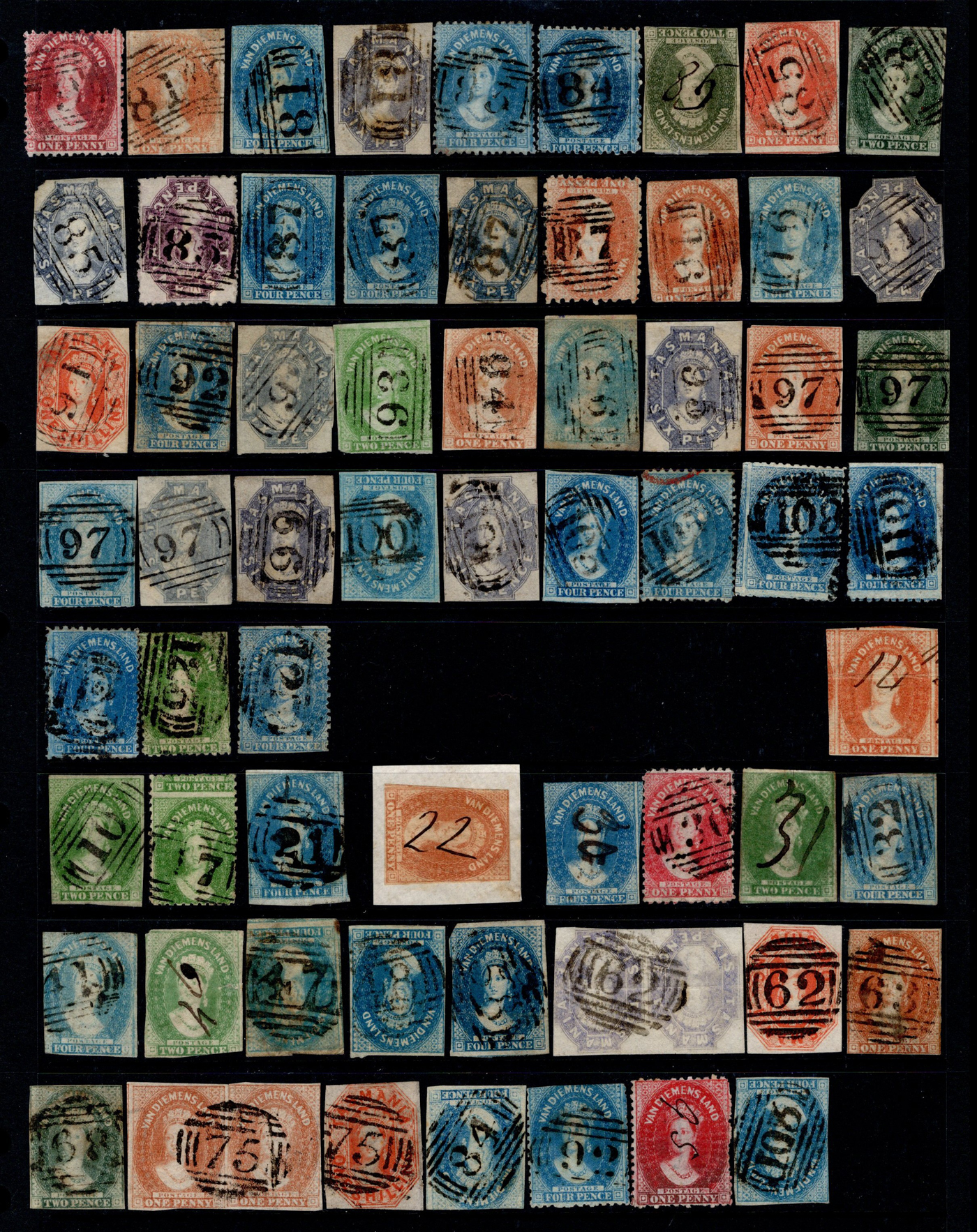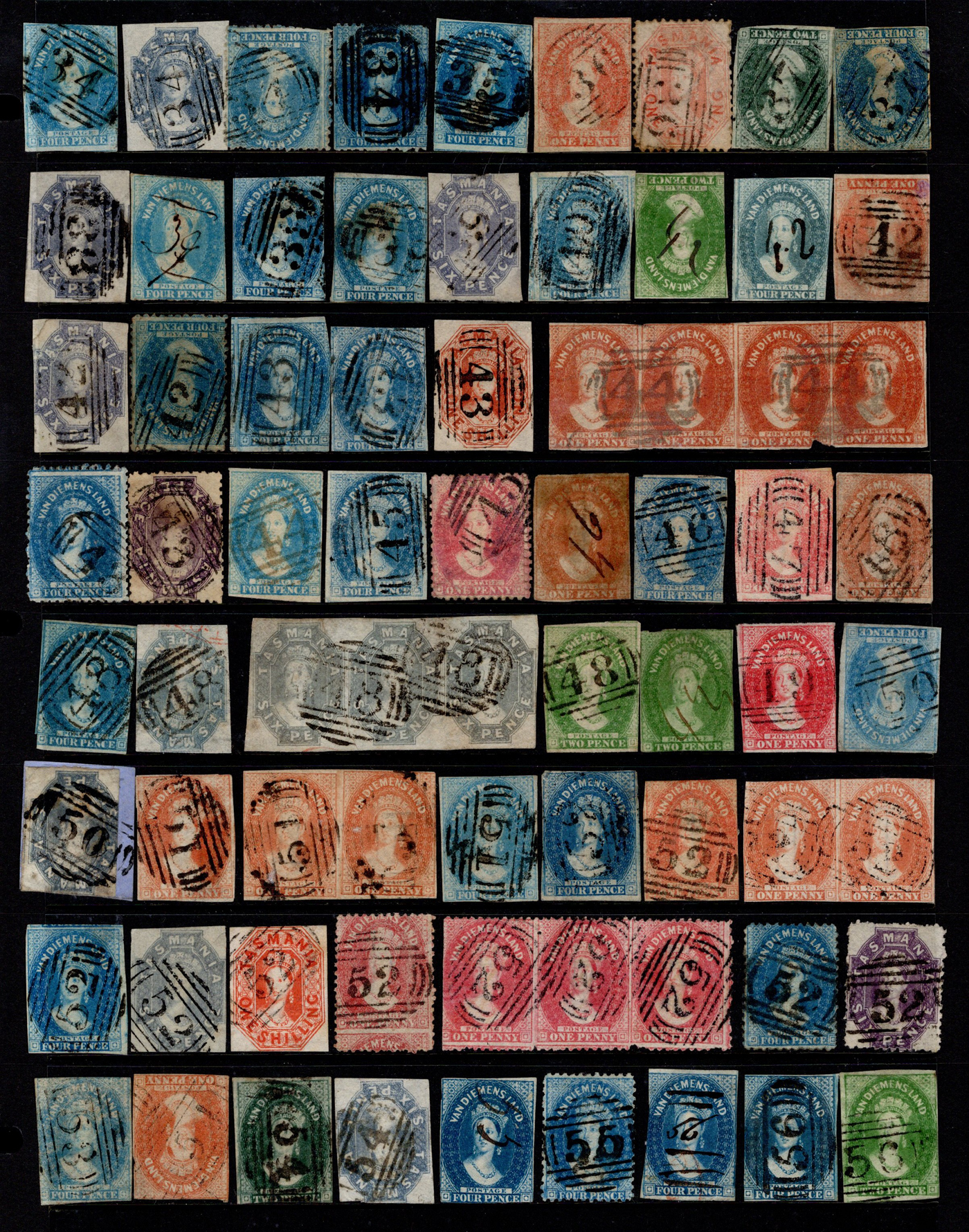1244 O Tasmania imageAdvanced Collection of Tasmania Barred Numeral Cancels on QV Chalon Stamps, #1 to 123, all neatly sorted and displayed in 4 black stock pages. We counted 86 different numbers represented on 282 stamps (singles, pairs and strips of three). When a number is duplicated, it will be on a different stamp, as this was the goal of the collector. In a few cases there is a manuscript number plus a barred numeral. We noted all denominations represented in various quantities, from the 1p to the 1sh, with loads of shades, watermarks, and perforations. A labour of love which would have taken decades to assemble, ideal for collectors or dealers wishing to part out. All four paged scanned online, should easily be worth our estimate of just C$7 per stamp. (Scan 1) (Scan 2) (Scan 3) (Scan 4) (All Scans)