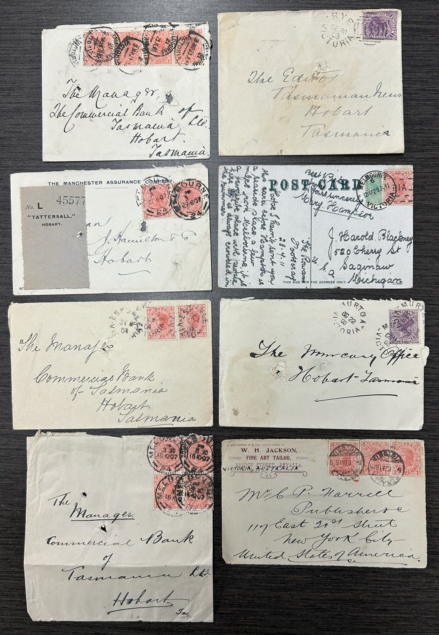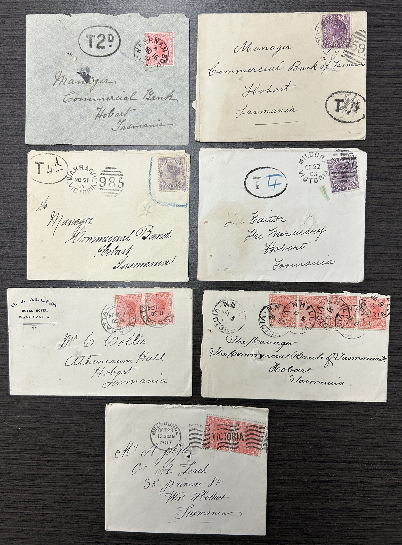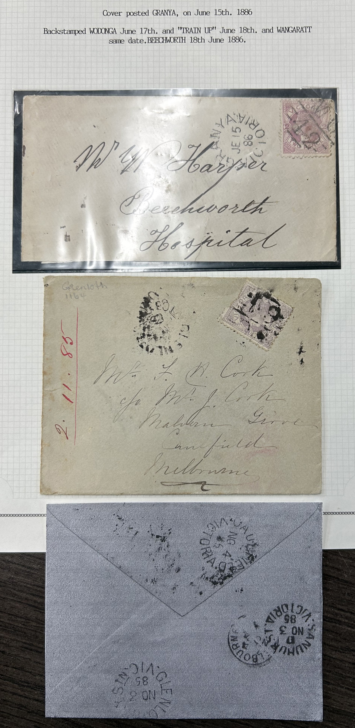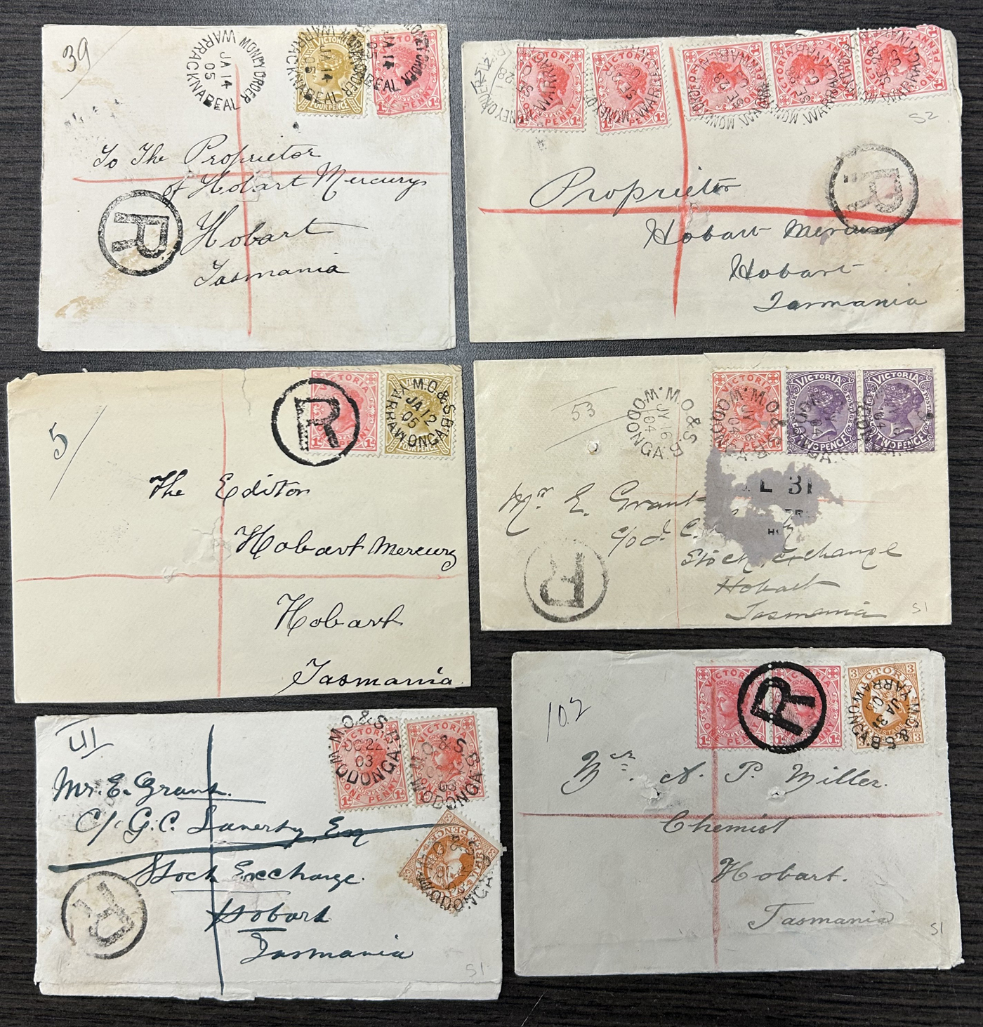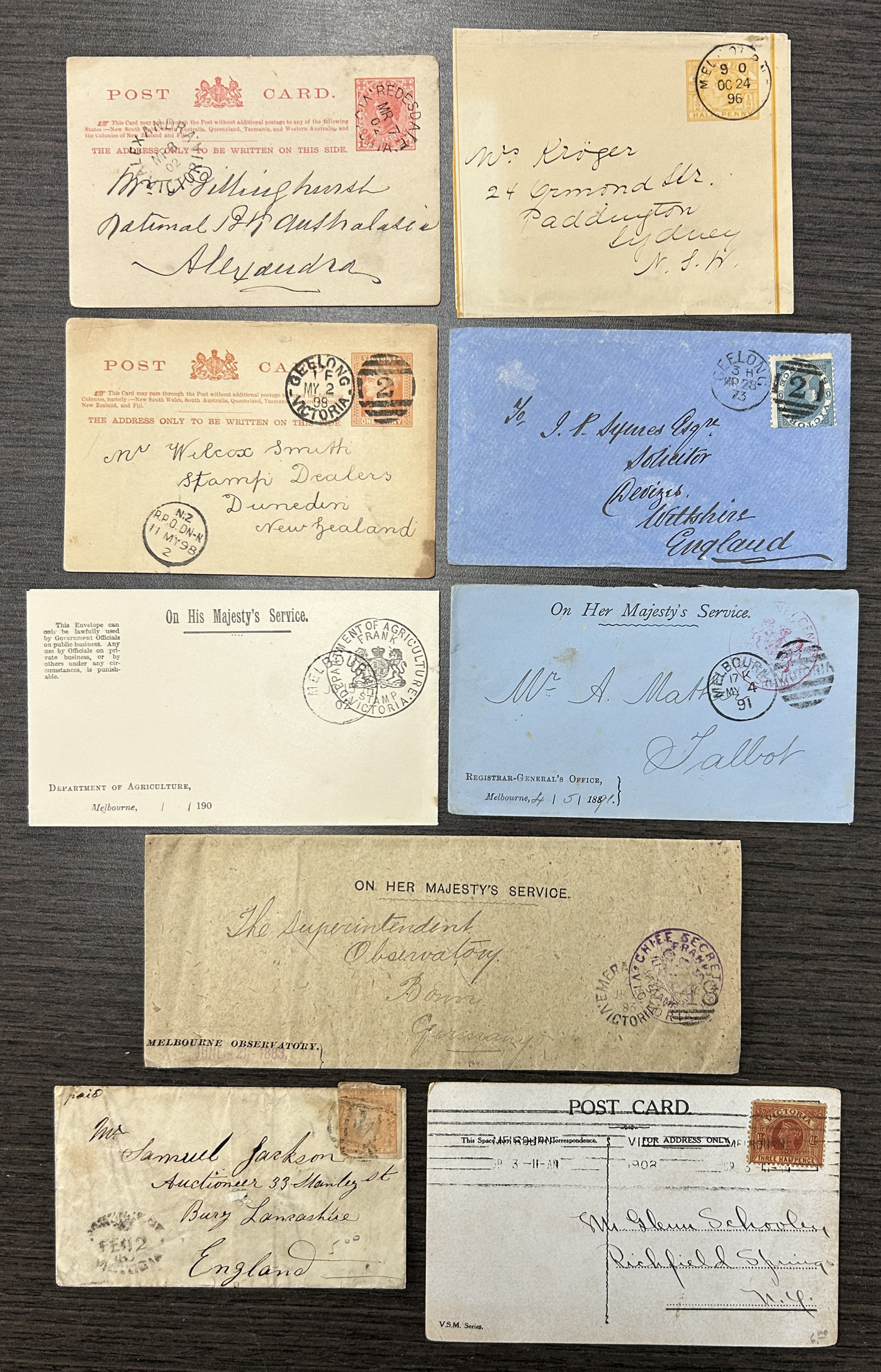 1252 CVR/PC Victoria imageGroup of 32 Victoria, Australia Covers and Cards, 1858 to 1911, from a number of towns such as Melbourne, Redesdale, Geelong (1873 and 1898 #2 duplex), Wangaratta, Nhill, Rye, Mildura, Warragul, Leongatha, Murtoa, Warnambool, as well as two Money Order Warracknabeal postmarks on registered covers to Hobart and some r.p.o. cancels such as M.O. & S.B Yarrawonga, M.O. & S.B Wodonga (x3) all on registered covers, an 1883 O.H.M.S. (Melbourne Observatory) wrapper to Germany. An 1886 cover posted Granya (barred numeral 42) with backstamps reading Wodonga, Train Up, Wagaratt and Beechworth plus an 1886 cover posted Glenloth with backstamps reading Caulfield, Sandhurst, Melbourne and Glenloth TY Stn. Four covers have scarce postage due markings and we note a few hotel covers, etc. One cover is a front, and many of the covers have spike holes or other faults, still a useful group with many very fine or better strikes - see photos. (Scan 1) (Scan 2) (Scan 3) (Scan 4) (Scan 5) (All Scans)