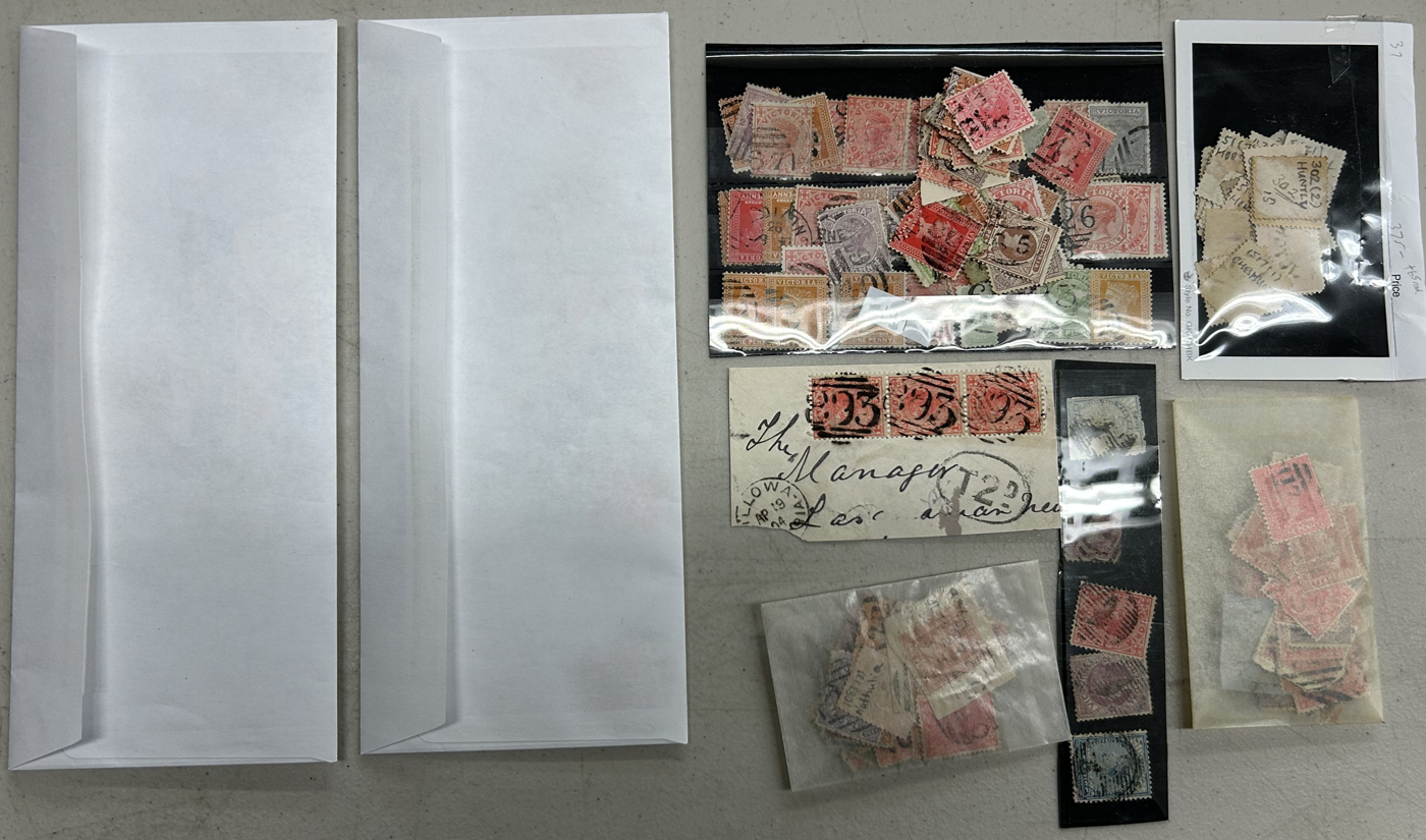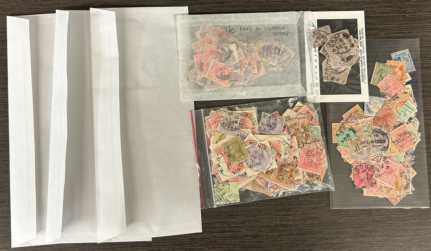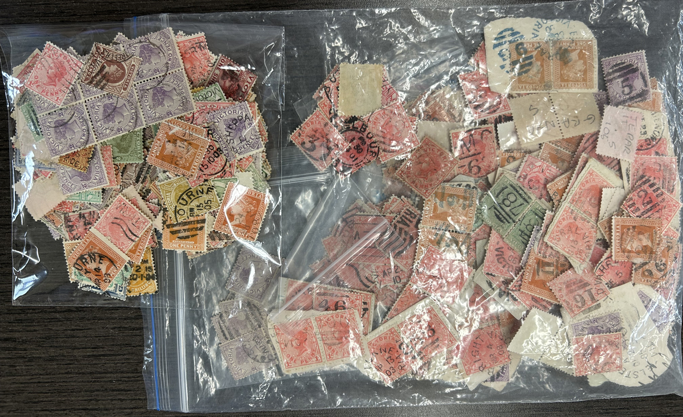 1248 O Victoria imageThousands of Victoria Stamps, Mostly with Postmark Interest, one Zip Lock bag contains about 1,000 stamps with barred numerals, another large bag contains mostly barred numerals but also town cancels, etc. and there are three other bags containing all sorts of postmarks. We note a good variety of stamp issues and quality appears to be generally fine or better. A real treasure trove for the patient postmark collector or dealer. (Scan 1) (Scan 2) (Scan 3) (Scan 4) (All Scans)