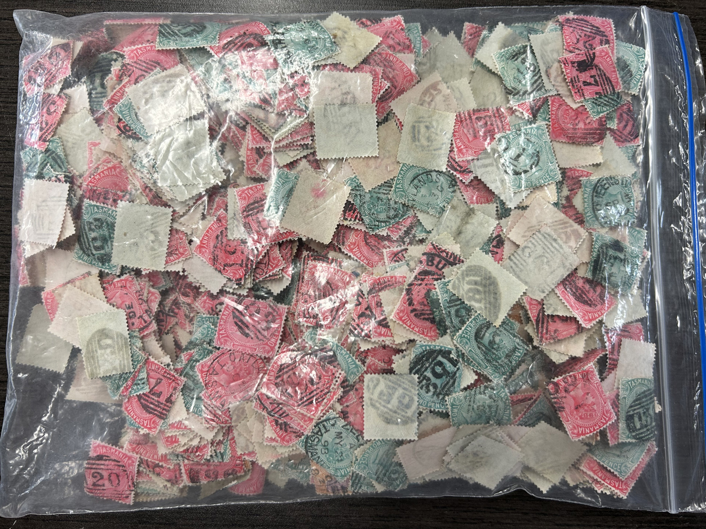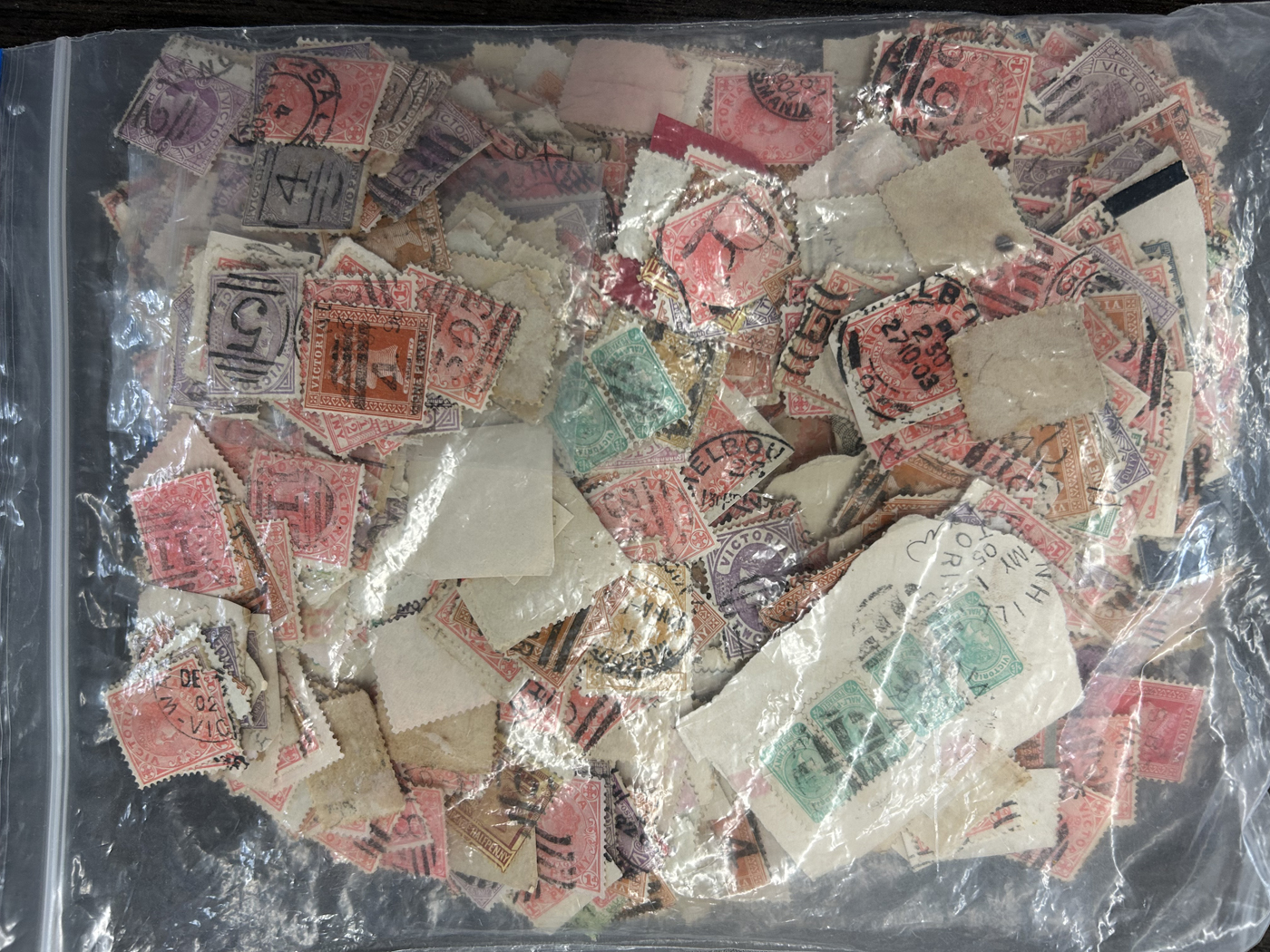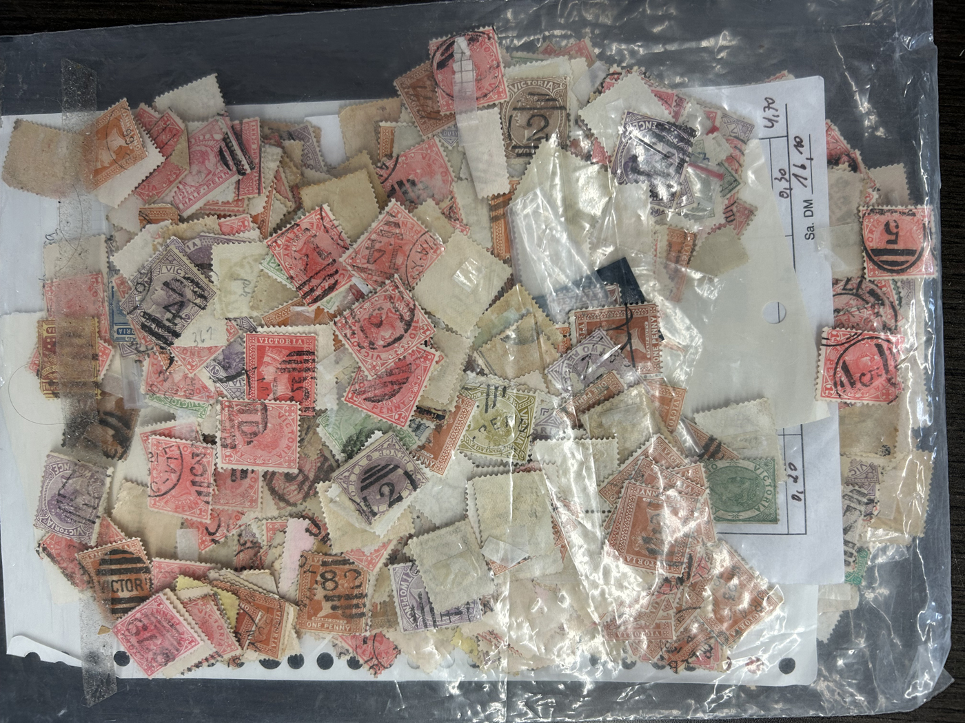 1248 O Victoria imageThousands of Victoria Stamps, Mostly with Postmark Interest, one Zip Lock bag contains about 1,000 stamps with barred numerals, another large bag contains mostly barred numerals but also town cancels, etc. and there are three other bags containing all sorts of postmarks. We note a good variety of stamp issues and quality appears to be generally fine or better. A real treasure trove for the patient postmark collector or dealer. (Scan 1) (Scan 2) (Scan 3) (Scan 4) (All Scans)