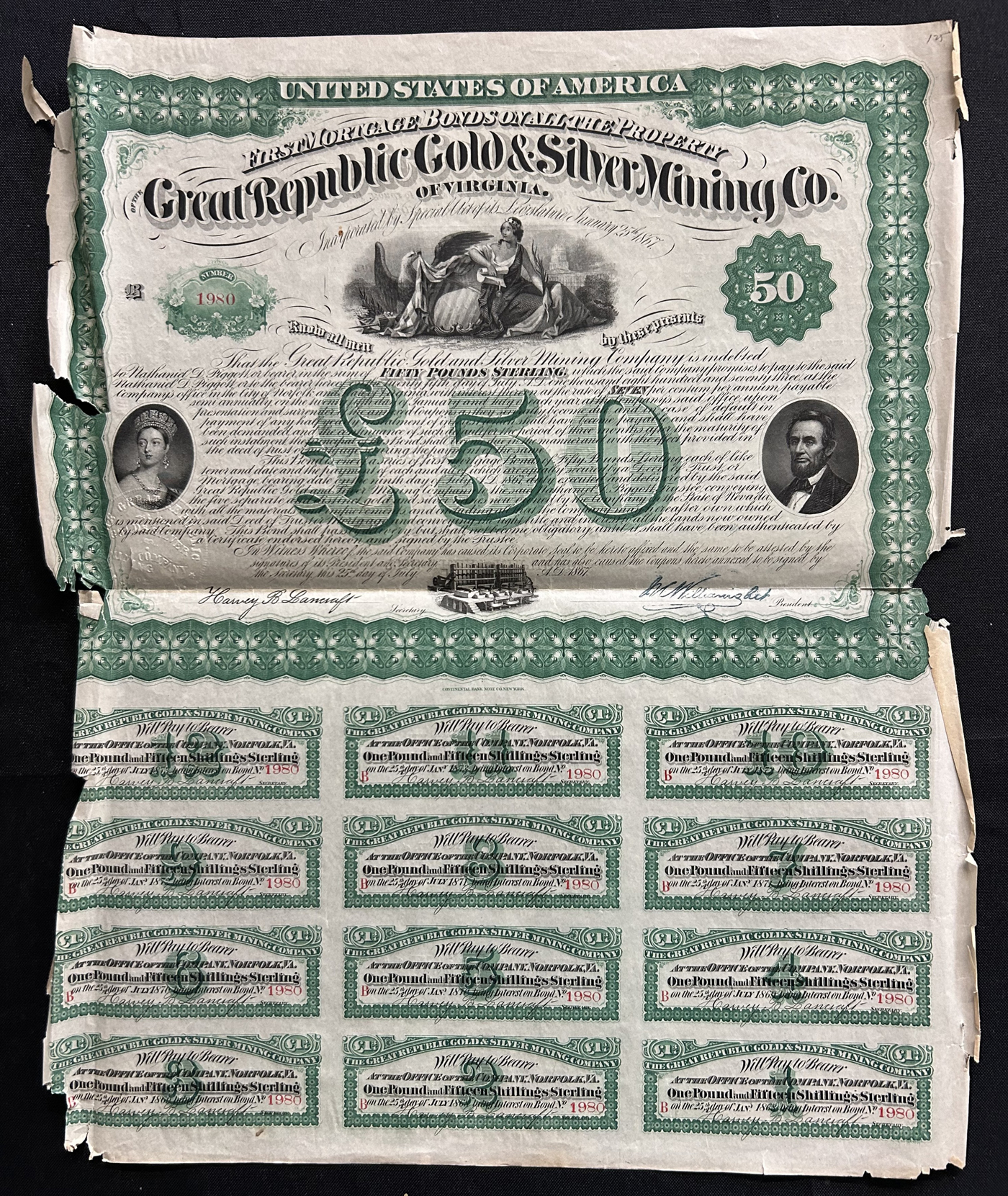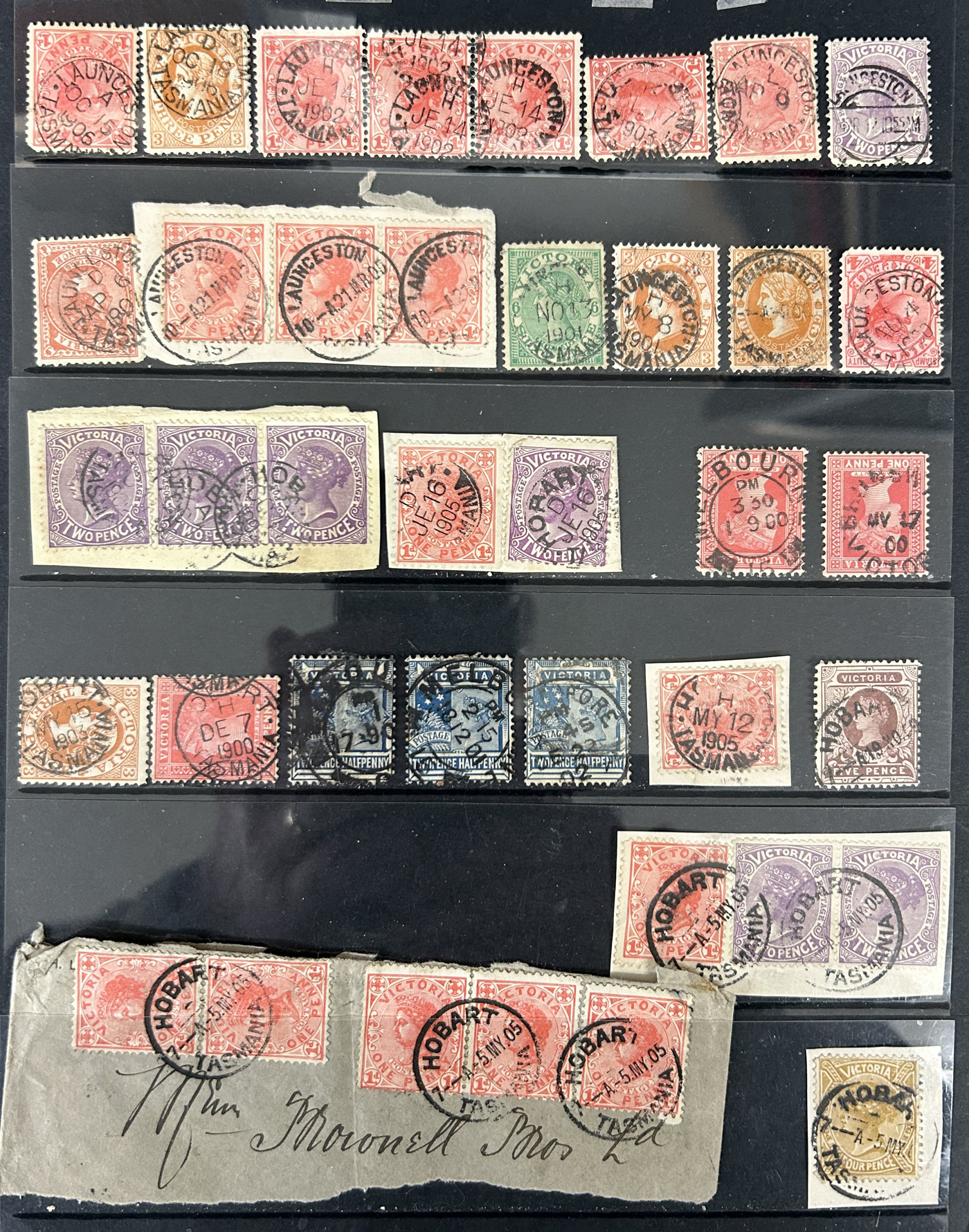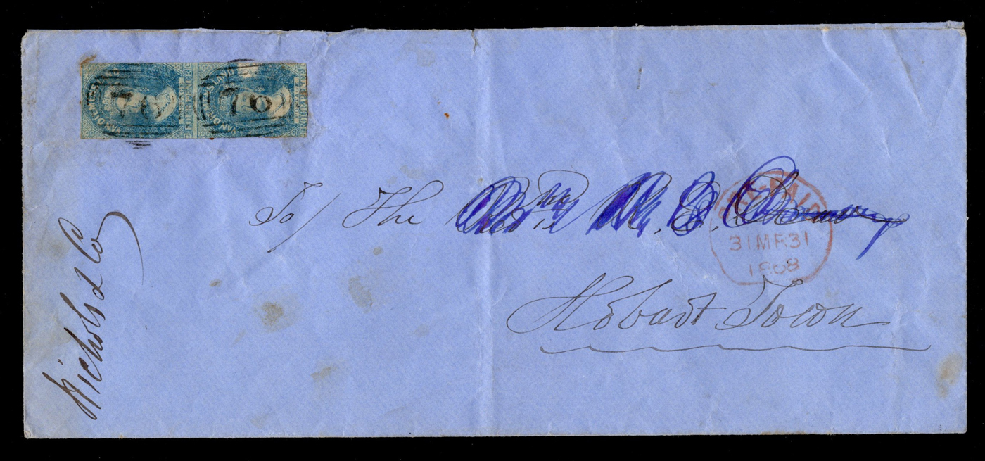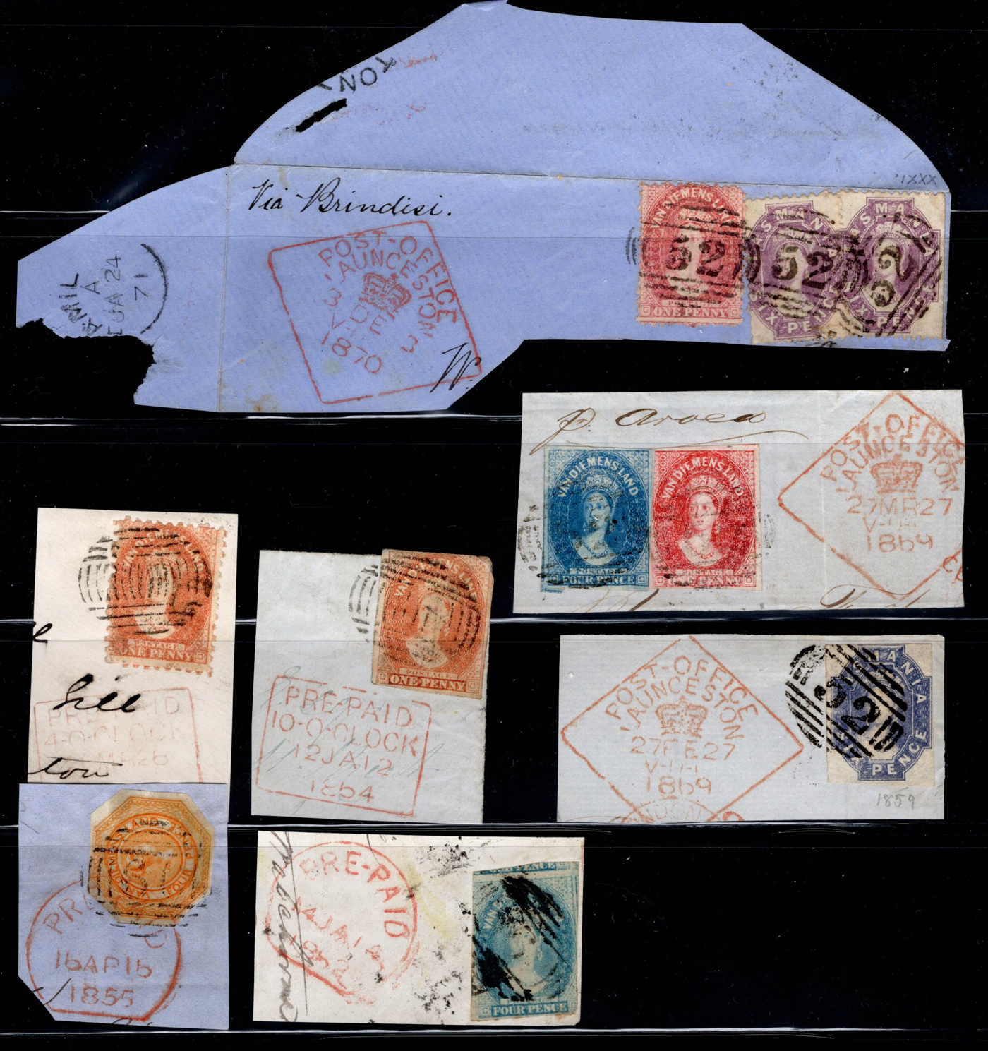 1245 CVR Tasmania imageGroup of Early Stamps on 1 Cover and 7 Pieces, the cover is franked with a pair of 4d blue imperforates tied by #76 (Richmond) cancel to Hobart (faults). The pieces are dated in the range of 1854 to 1870 and either have a "POST-OFFICE / LAUCESTON" crown in lozenge postmark (along with #52 in grid), or a "PRE-PAID" with date in a red semi-circle or box. The pieces combined are franked with a total of 10 imperforate and perforated stamps. Also comes with a large United States Great Republic Gold & Silver Mining Co. of Virginia" stock certificate with a vignette of Queen Victoria Chalon, Abraham Lincoln, etc (many edge faults). (Scan 1) (Scan 2) (Scan 3) (All Scans)