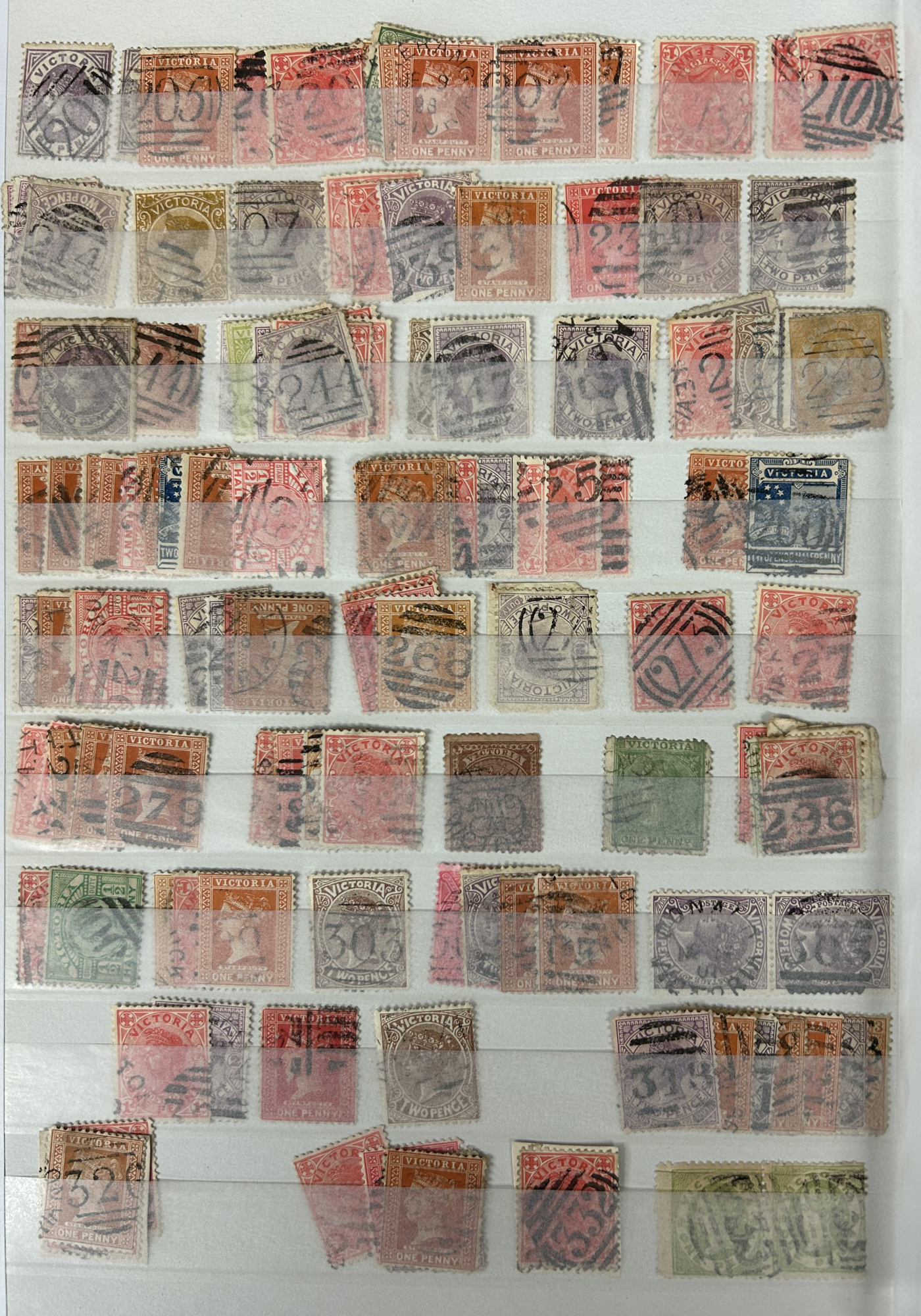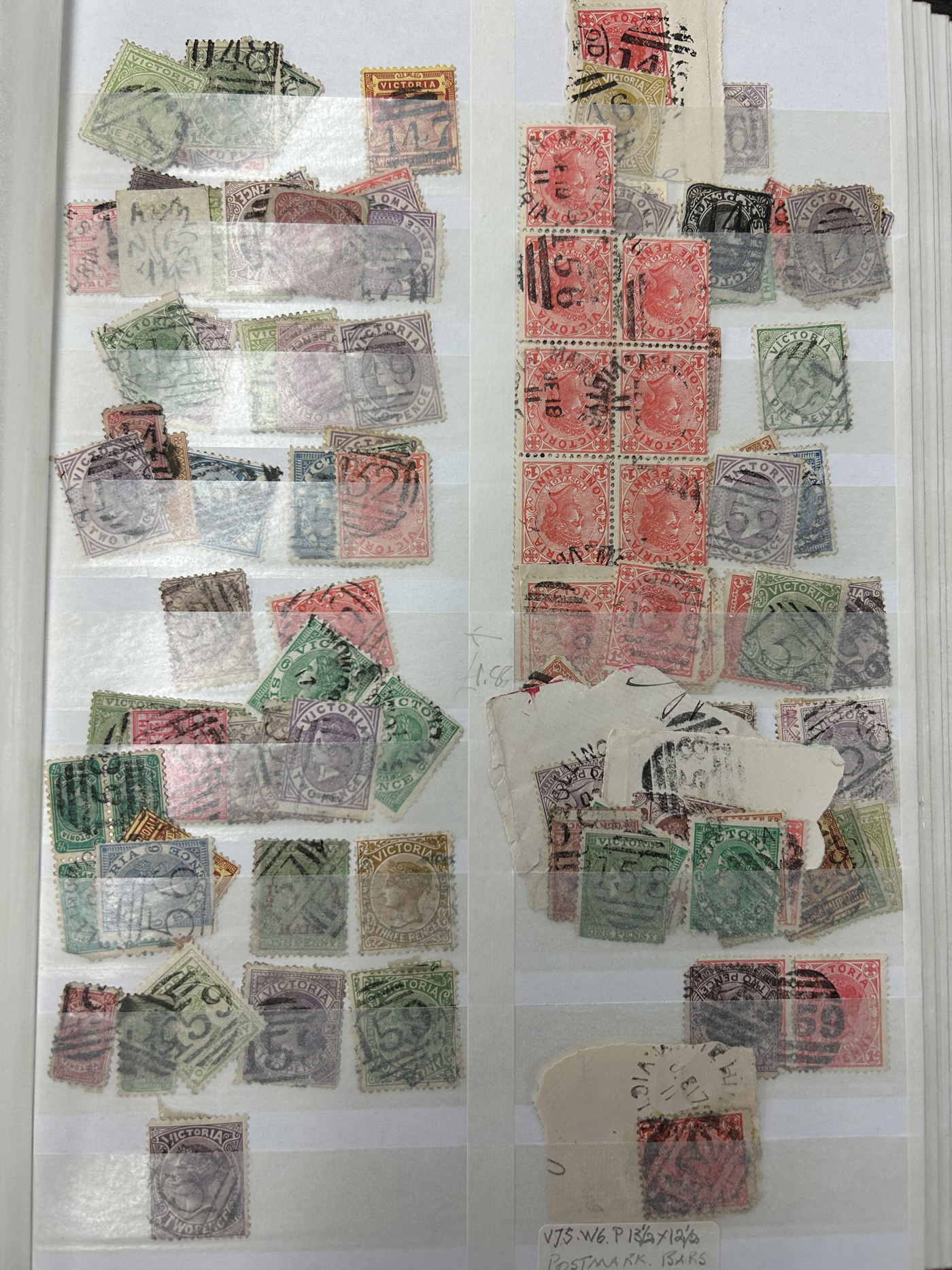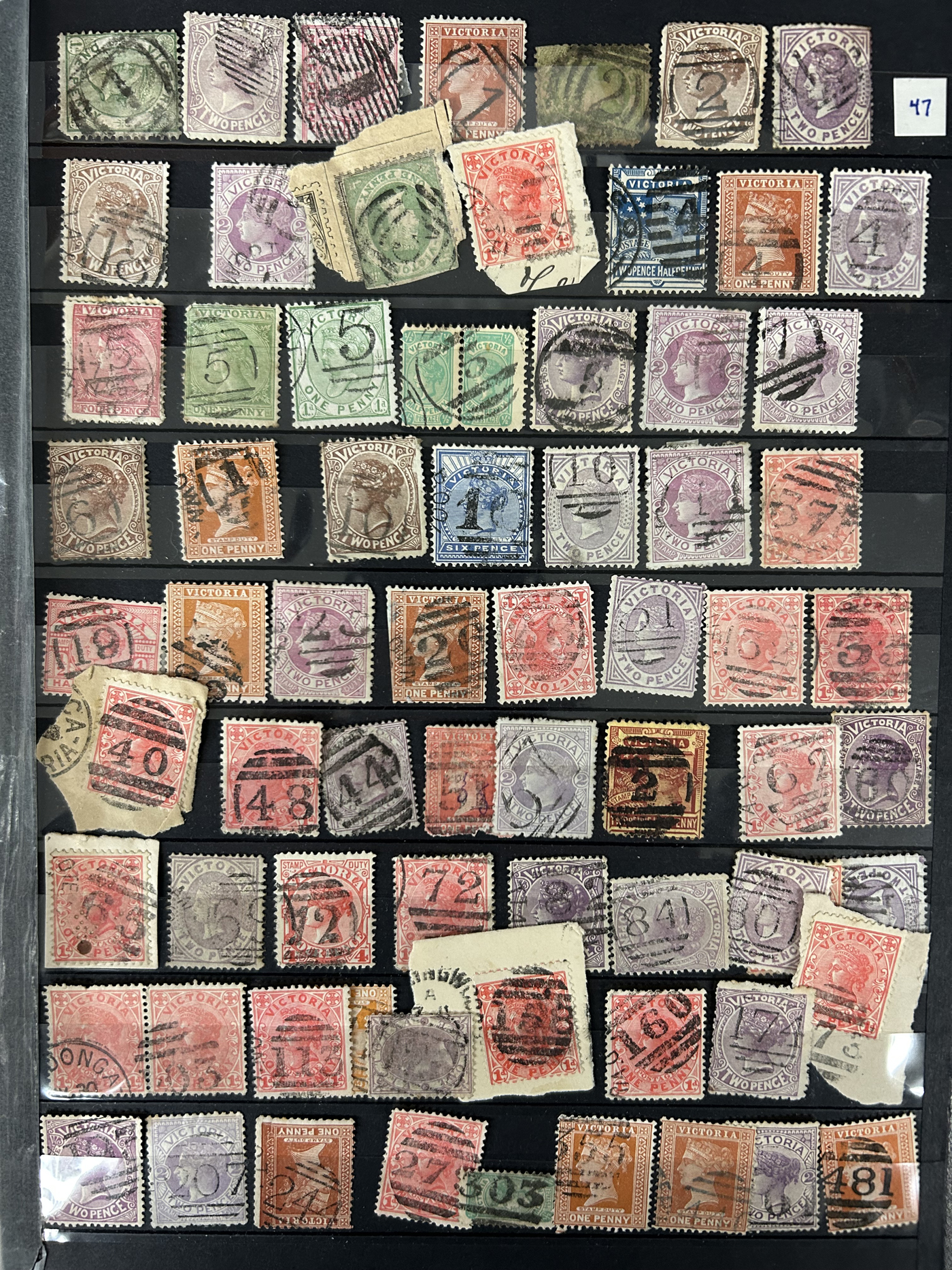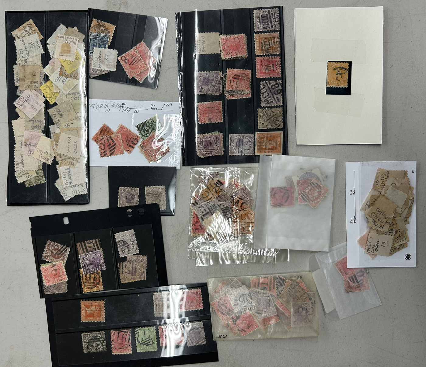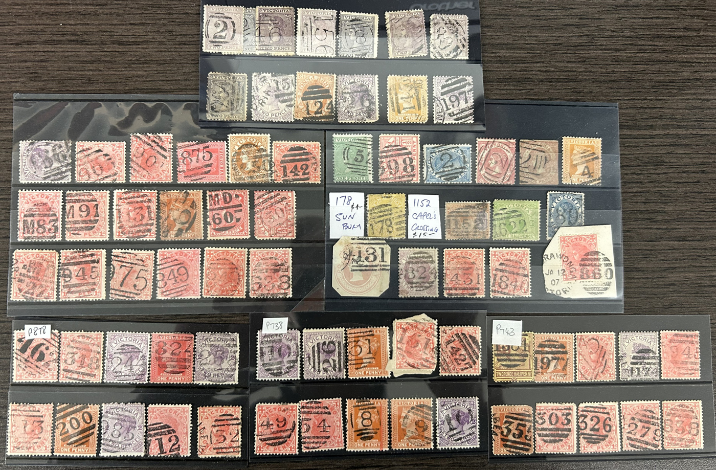 1247 O Victoria imageLarge Collection / Accumulation of Victoria Barred Numeral Postmarks on Victoria Stamps, displayed on 16 album pages, 4 black stock sheets, about 10 small black stock cards, several glassines and 102 cards plus two white envelopes. The lot probably contains several hundreds ( a few thousand?) Victoria stamp issues, each with a large assortment of barred numeral cancels. Unchecked by us for rare numerals or stamp / numeral combinations, see our many representative pictures to get an idea. (Scan 1) (Scan 2) (Scan 3) (Scan 4) (Scan 5) (Scan 6) (Scan 7) (Scan 8) (Scan 9) (Scan 10) (Scan 11) (Scan 12) (Scan 13) (All Scans)