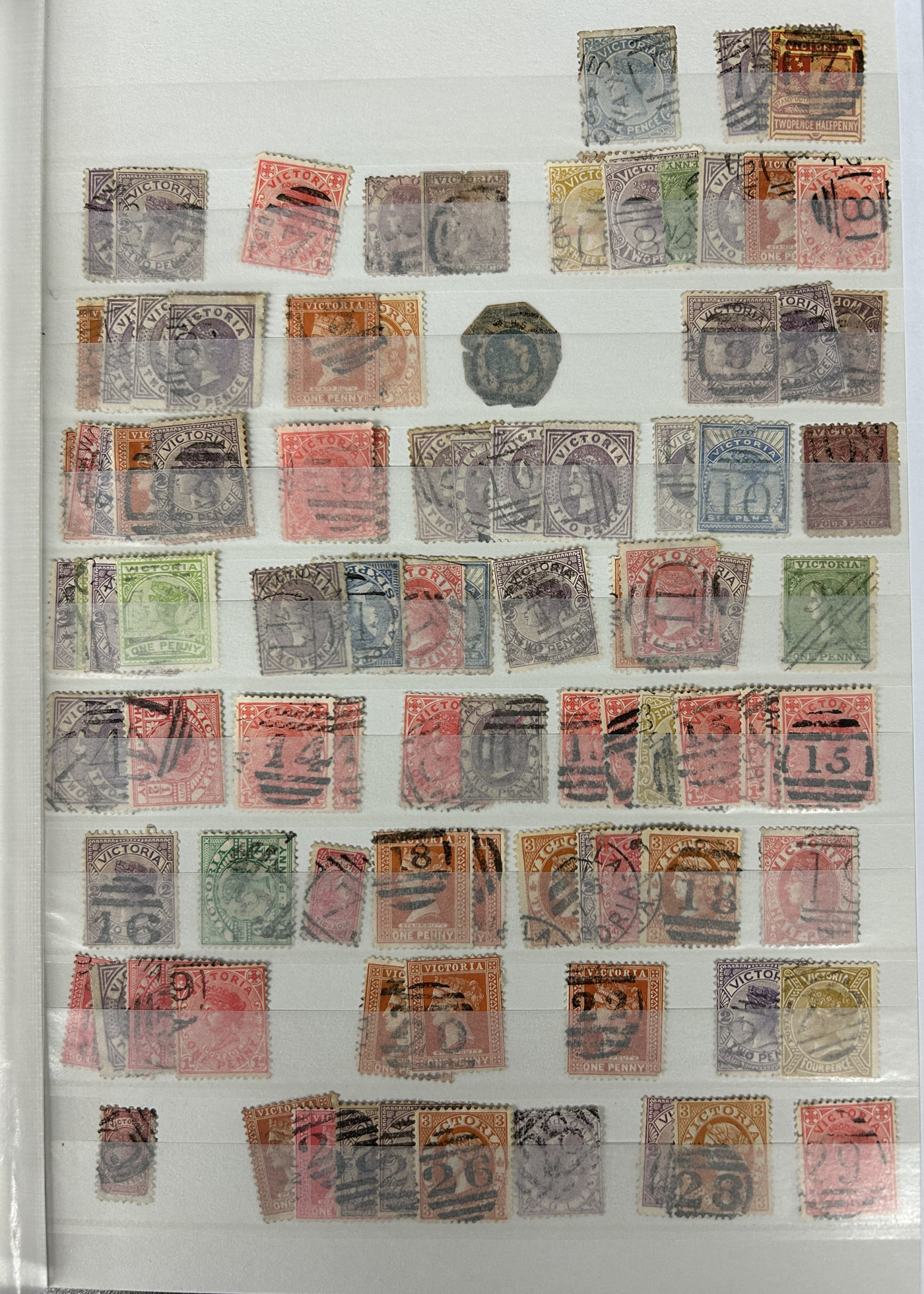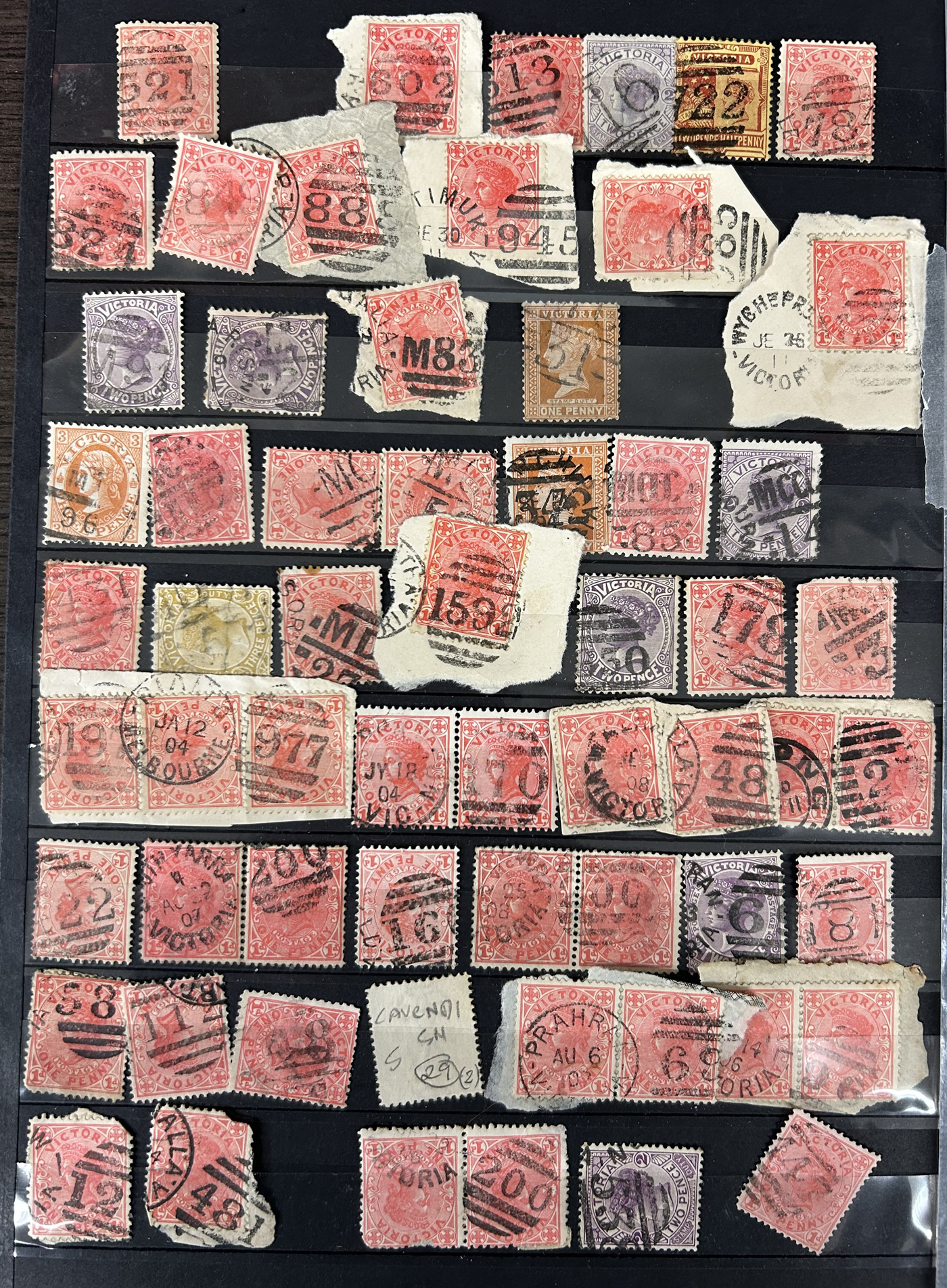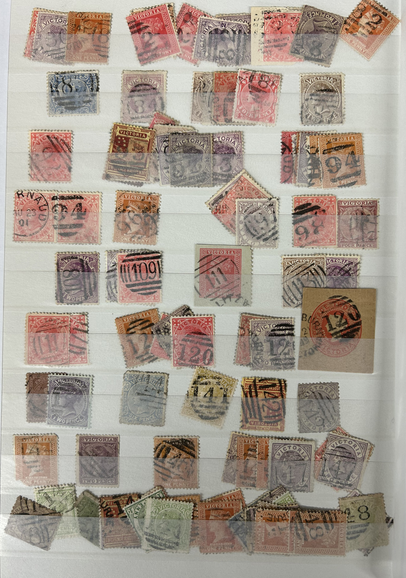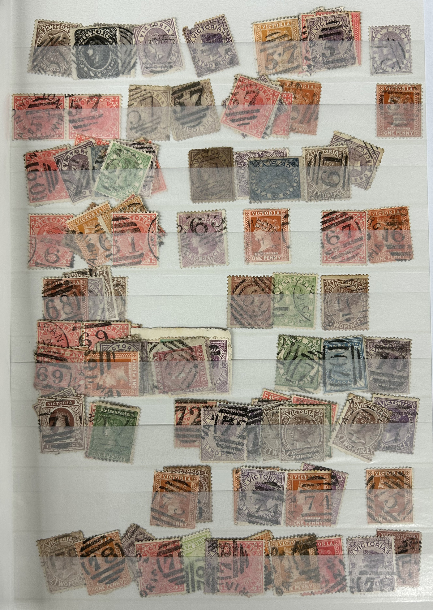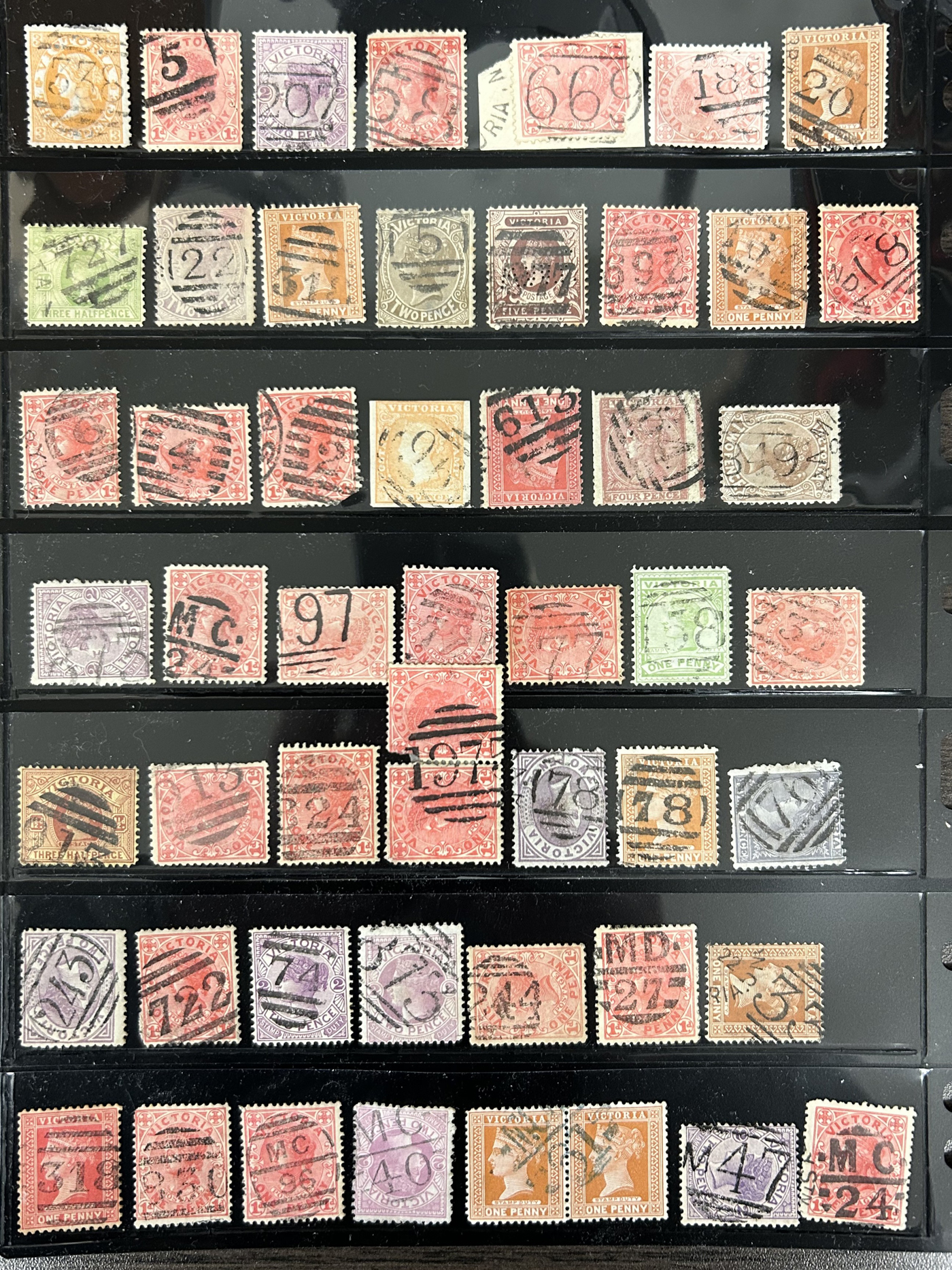 1247 O Victoria imageLarge Collection / Accumulation of Victoria Barred Numeral Postmarks on Victoria Stamps, displayed on 16 album pages, 4 black stock sheets, about 10 small black stock cards, several glassines and 102 cards plus two white envelopes. The lot probably contains several hundreds ( a few thousand?) Victoria stamp issues, each with a large assortment of barred numeral cancels. Unchecked by us for rare numerals or stamp / numeral combinations, see our many representative pictures to get an idea. (Scan 1) (Scan 2) (Scan 3) (Scan 4) (Scan 5) (Scan 6) (Scan 7) (Scan 8) (Scan 9) (Scan 10) (Scan 11) (Scan 12) (Scan 13) (All Scans)