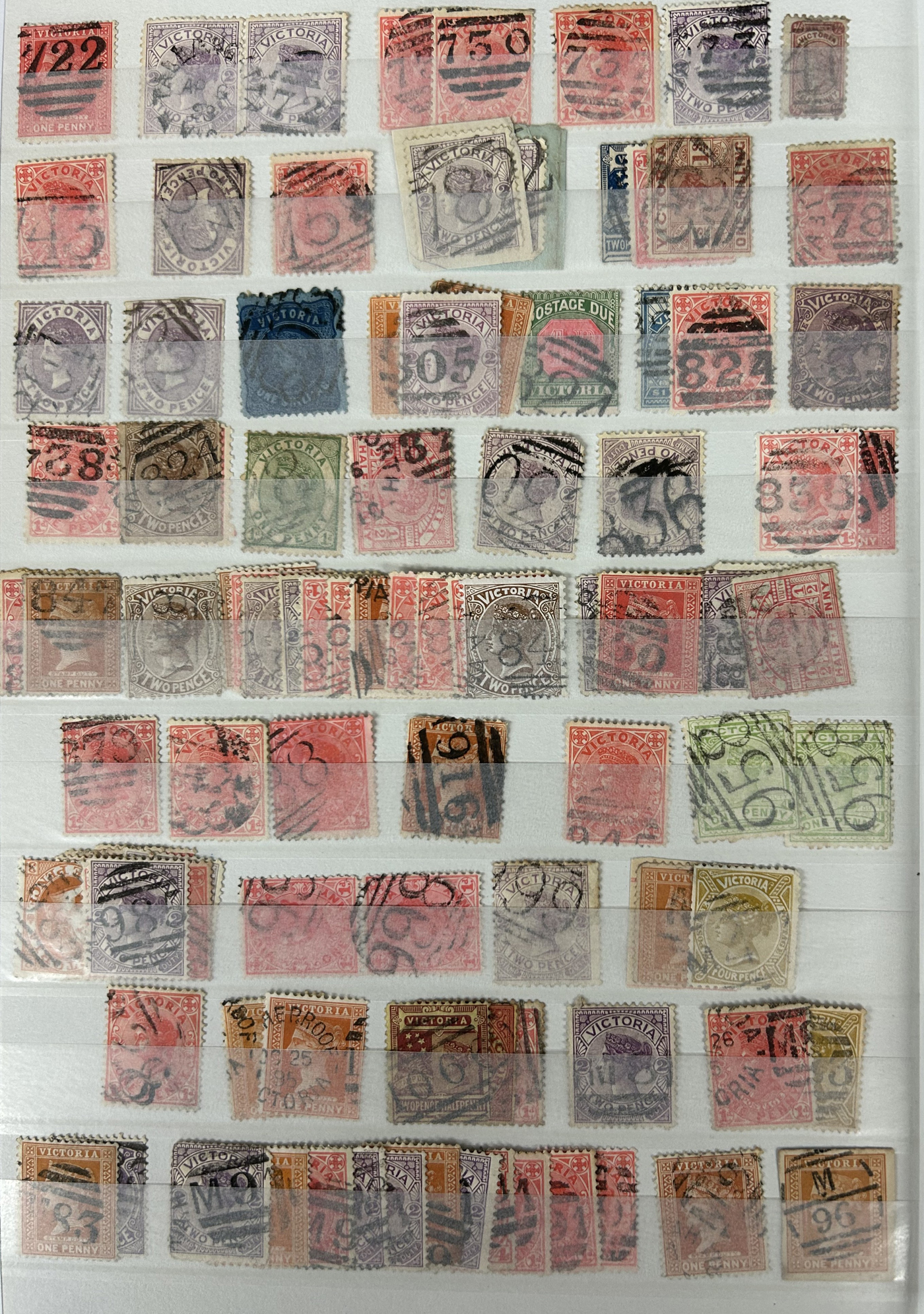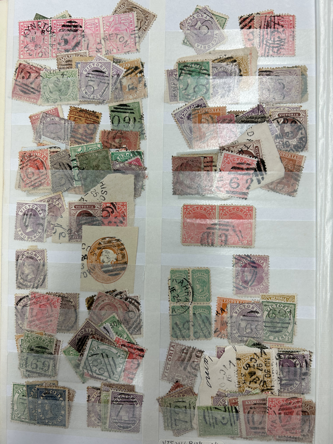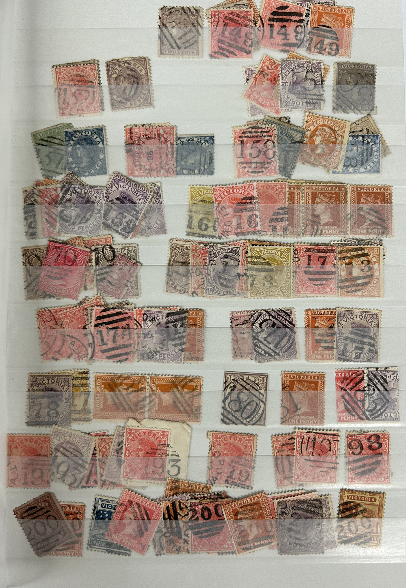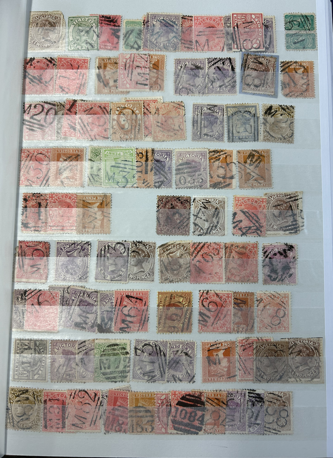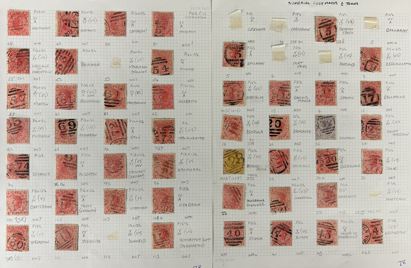 1247 O Victoria imageLarge Collection / Accumulation of Victoria Barred Numeral Postmarks on Victoria Stamps, displayed on 16 album pages, 4 black stock sheets, about 10 small black stock cards, several glassines and 102 cards plus two white envelopes. The lot probably contains several hundreds ( a few thousand?) Victoria stamp issues, each with a large assortment of barred numeral cancels. Unchecked by us for rare numerals or stamp / numeral combinations, see our many representative pictures to get an idea. (Scan 1) (Scan 2) (Scan 3) (Scan 4) (Scan 5) (Scan 6) (Scan 7) (Scan 8) (Scan 9) (Scan 10) (Scan 11) (Scan 12) (Scan 13) (All Scans)