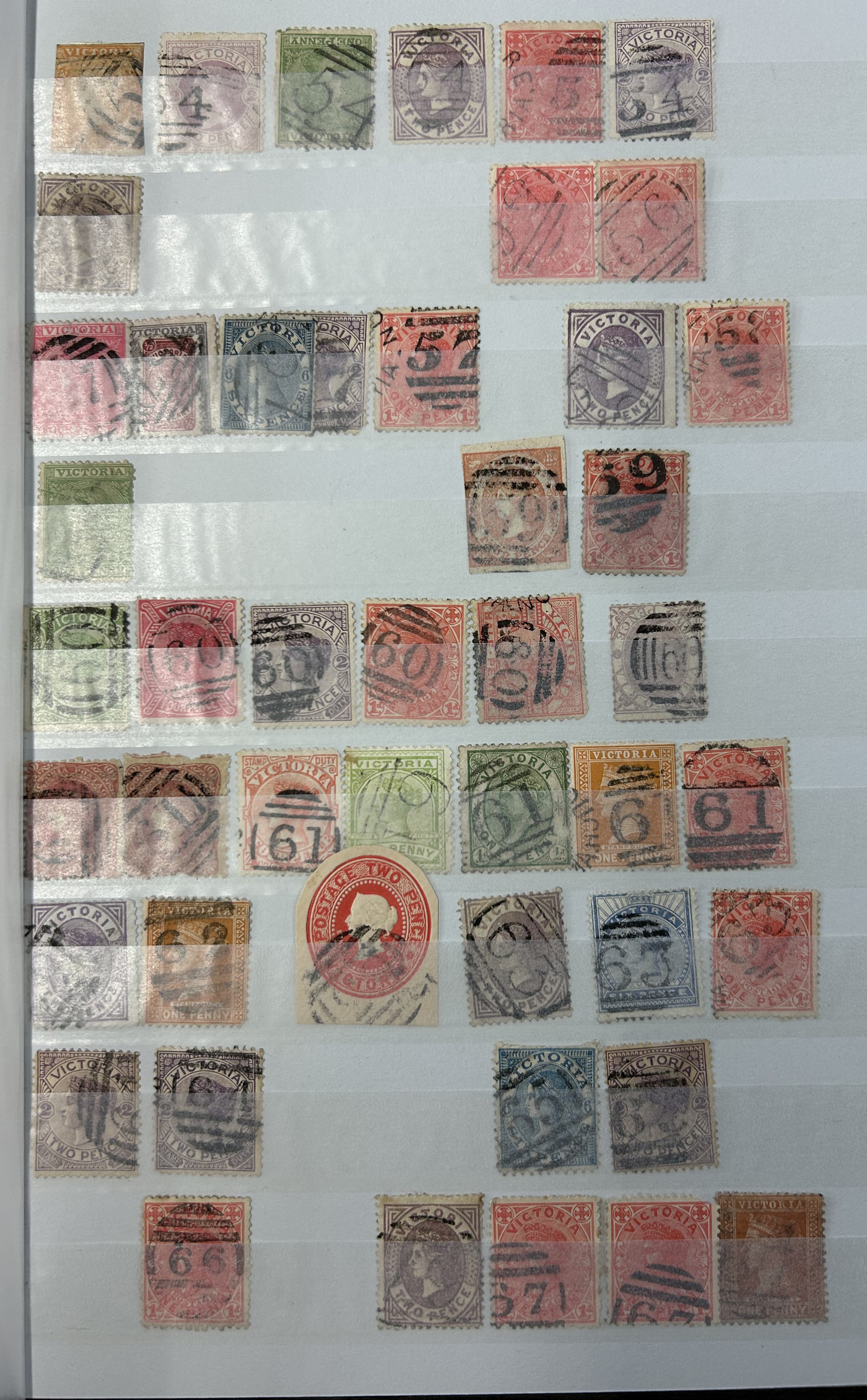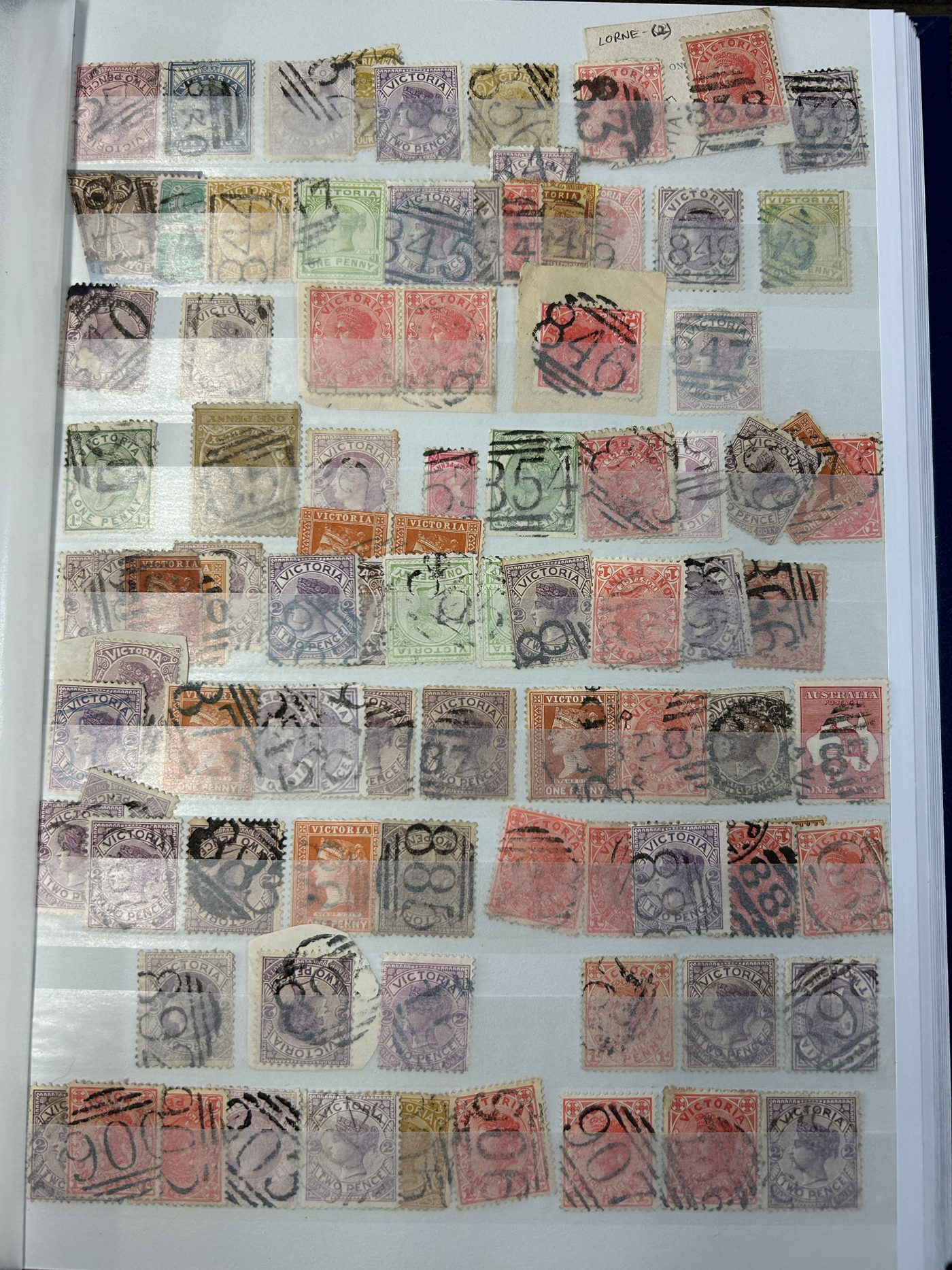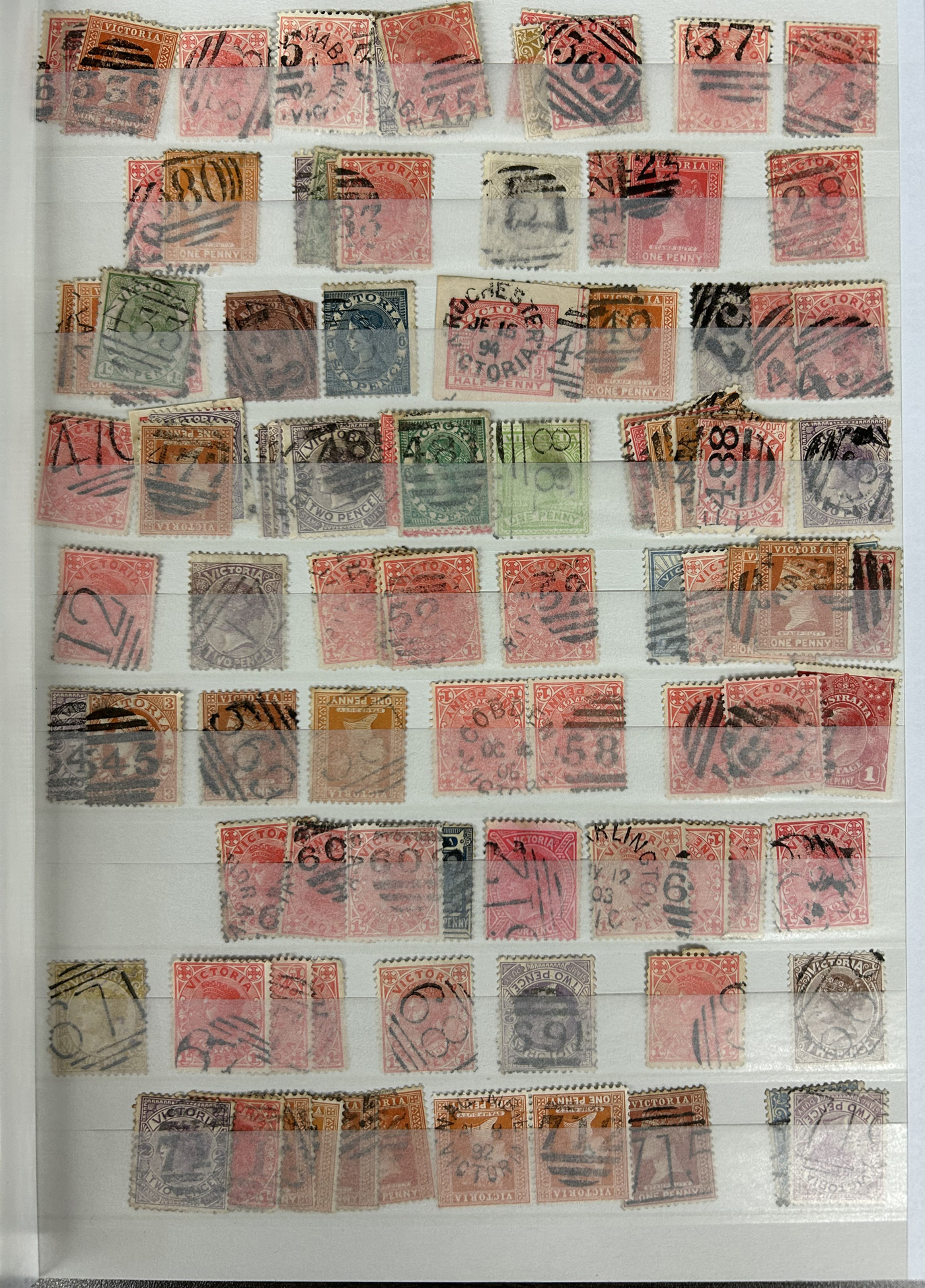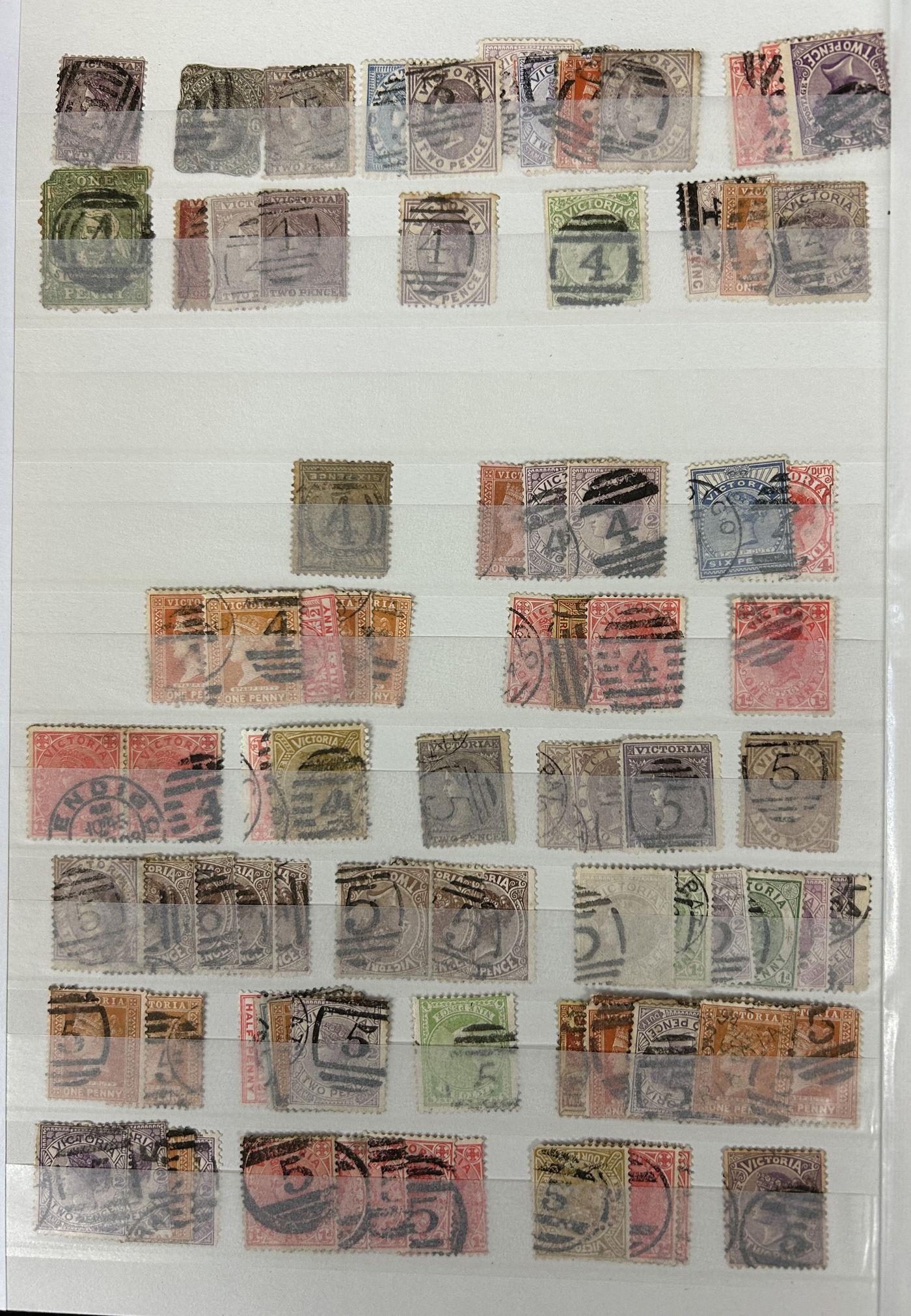 1247 O Victoria imageLarge Collection / Accumulation of Victoria Barred Numeral Postmarks on Victoria Stamps, displayed on 16 album pages, 4 black stock sheets, about 10 small black stock cards, several glassines and 102 cards plus two white envelopes. The lot probably contains several hundreds ( a few thousand?) Victoria stamp issues, each with a large assortment of barred numeral cancels. Unchecked by us for rare numerals or stamp / numeral combinations, see our many representative pictures to get an idea. (Scan 1) (Scan 2) (Scan 3) (Scan 4) (Scan 5) (Scan 6) (Scan 7) (Scan 8) (Scan 9) (Scan 10) (Scan 11) (Scan 12) (Scan 13) (All Scans)