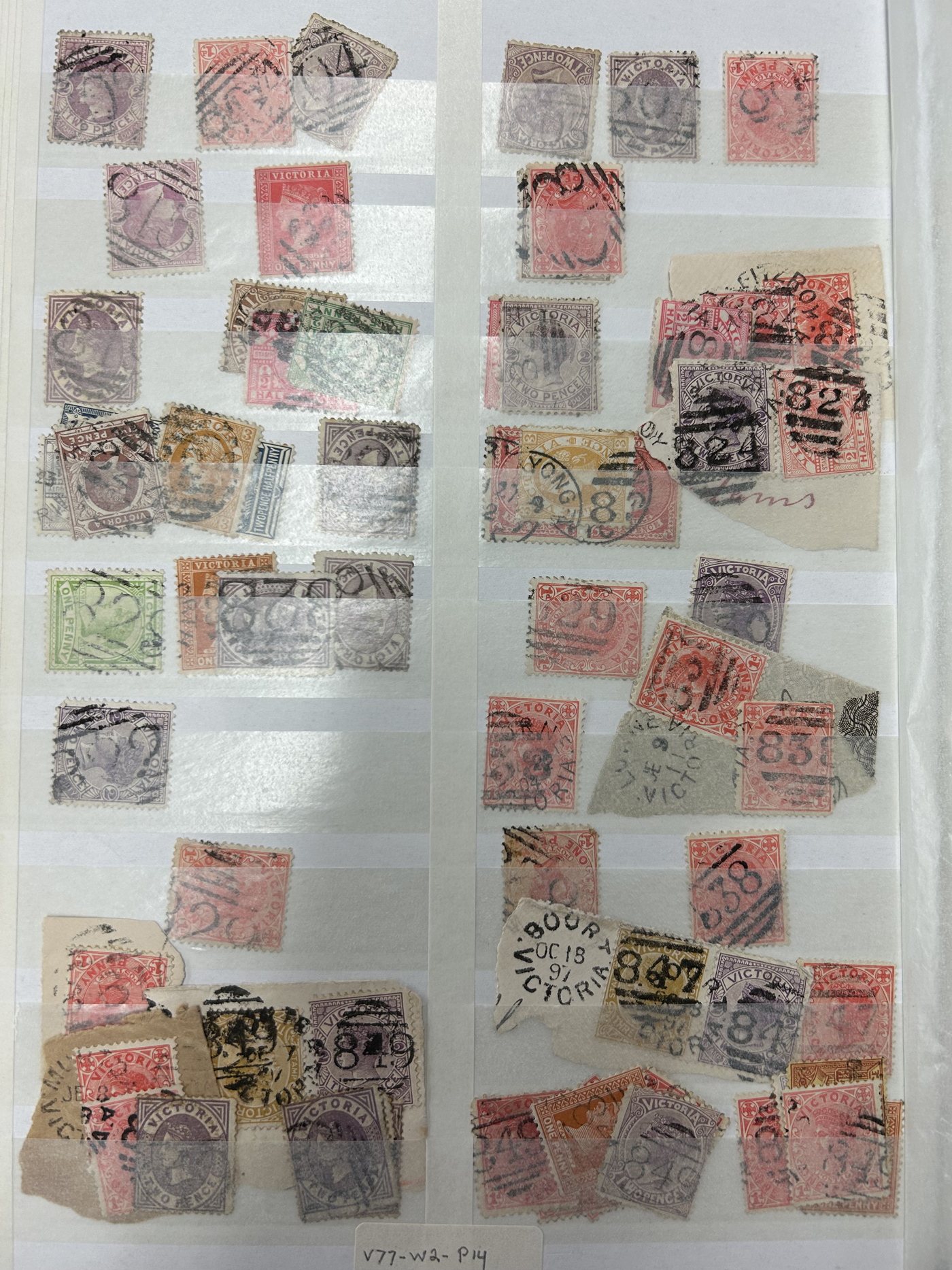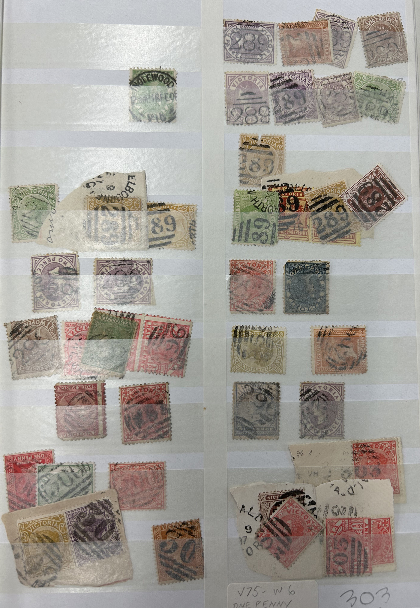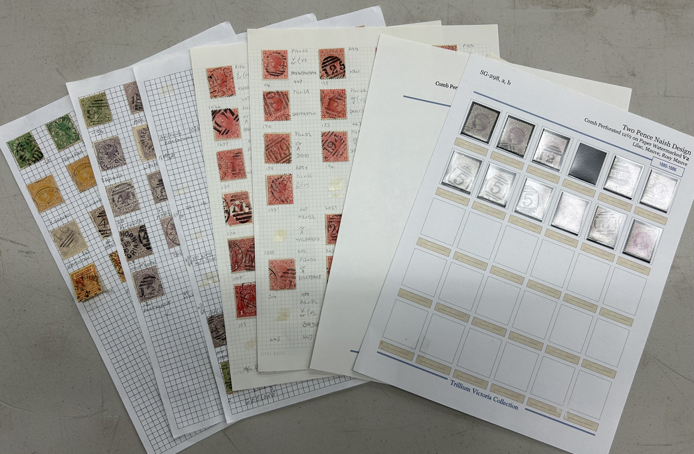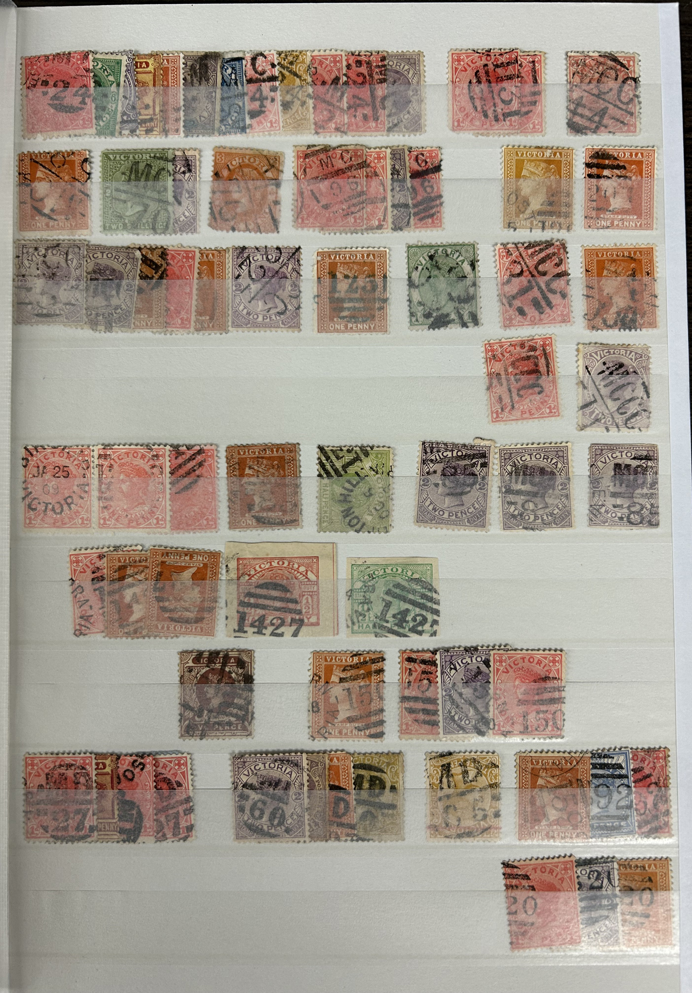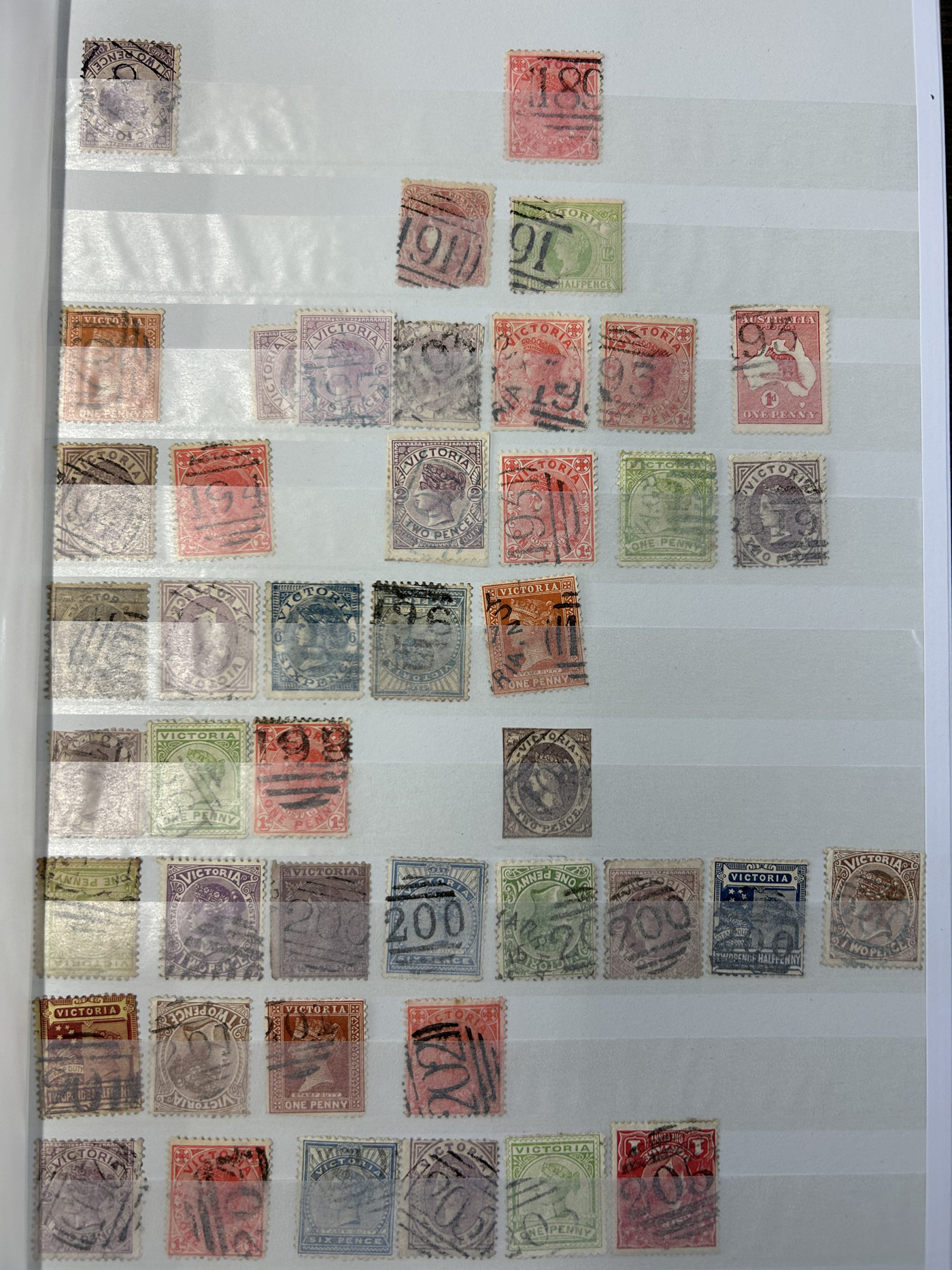 1247 O Victoria imageLarge Collection / Accumulation of Victoria Barred Numeral Postmarks on Victoria Stamps, displayed on 16 album pages, 4 black stock sheets, about 10 small black stock cards, several glassines and 102 cards plus two white envelopes. The lot probably contains several hundreds ( a few thousand?) Victoria stamp issues, each with a large assortment of barred numeral cancels. Unchecked by us for rare numerals or stamp / numeral combinations, see our many representative pictures to get an idea. (Scan 1) (Scan 2) (Scan 3) (Scan 4) (Scan 5) (Scan 6) (Scan 7) (Scan 8) (Scan 9) (Scan 10) (Scan 11) (Scan 12) (Scan 13) (All Scans)
