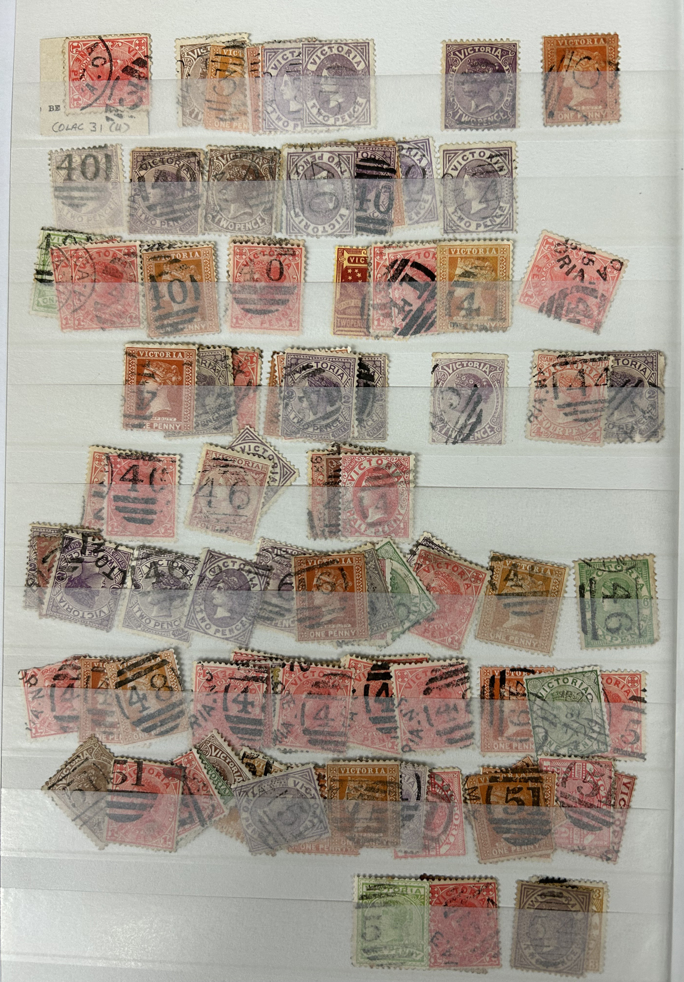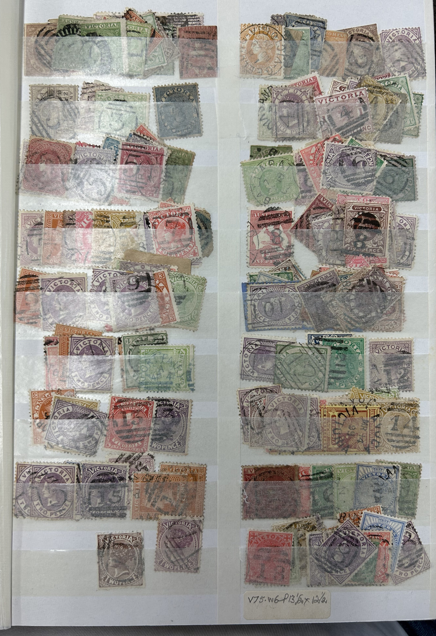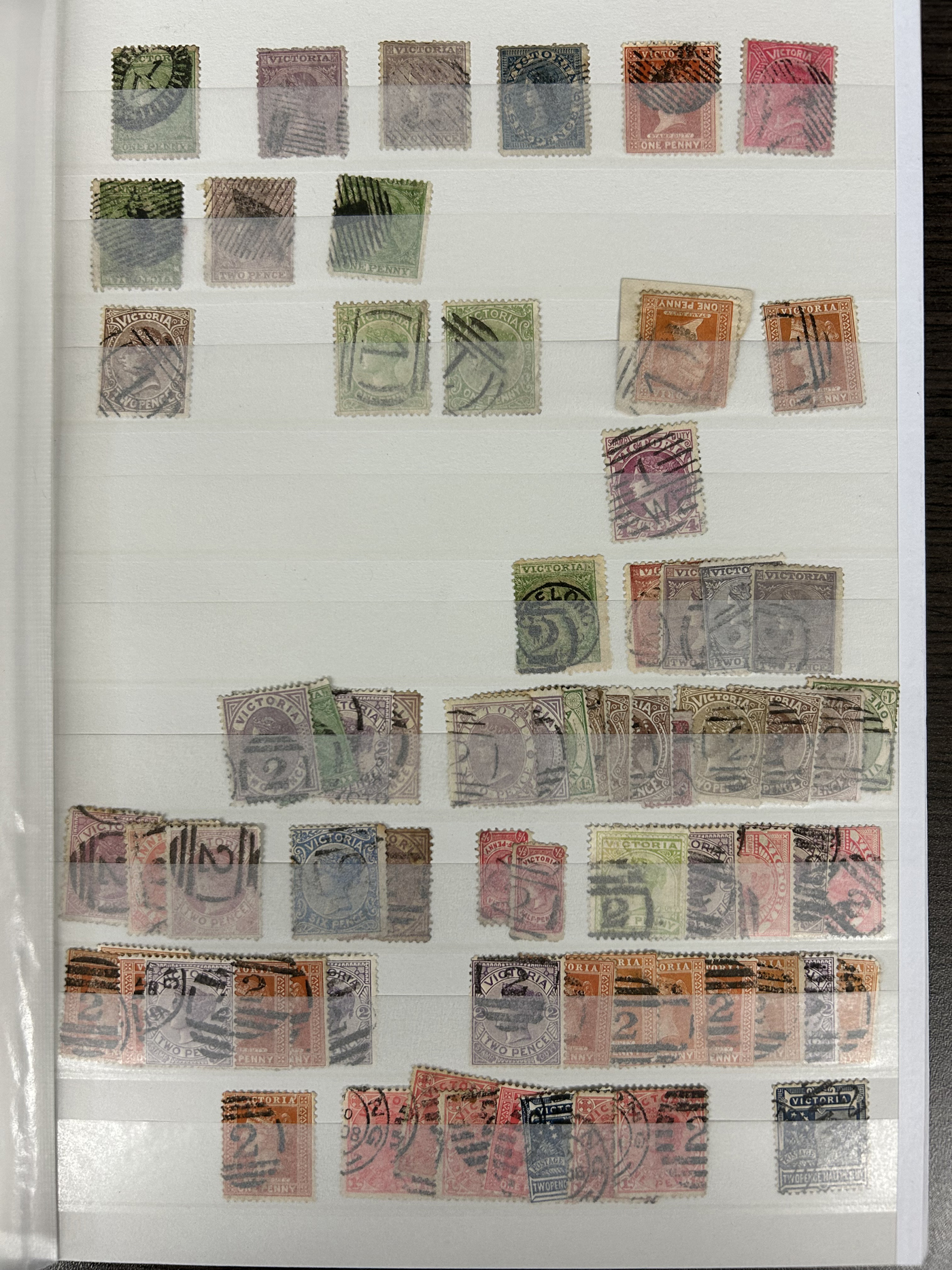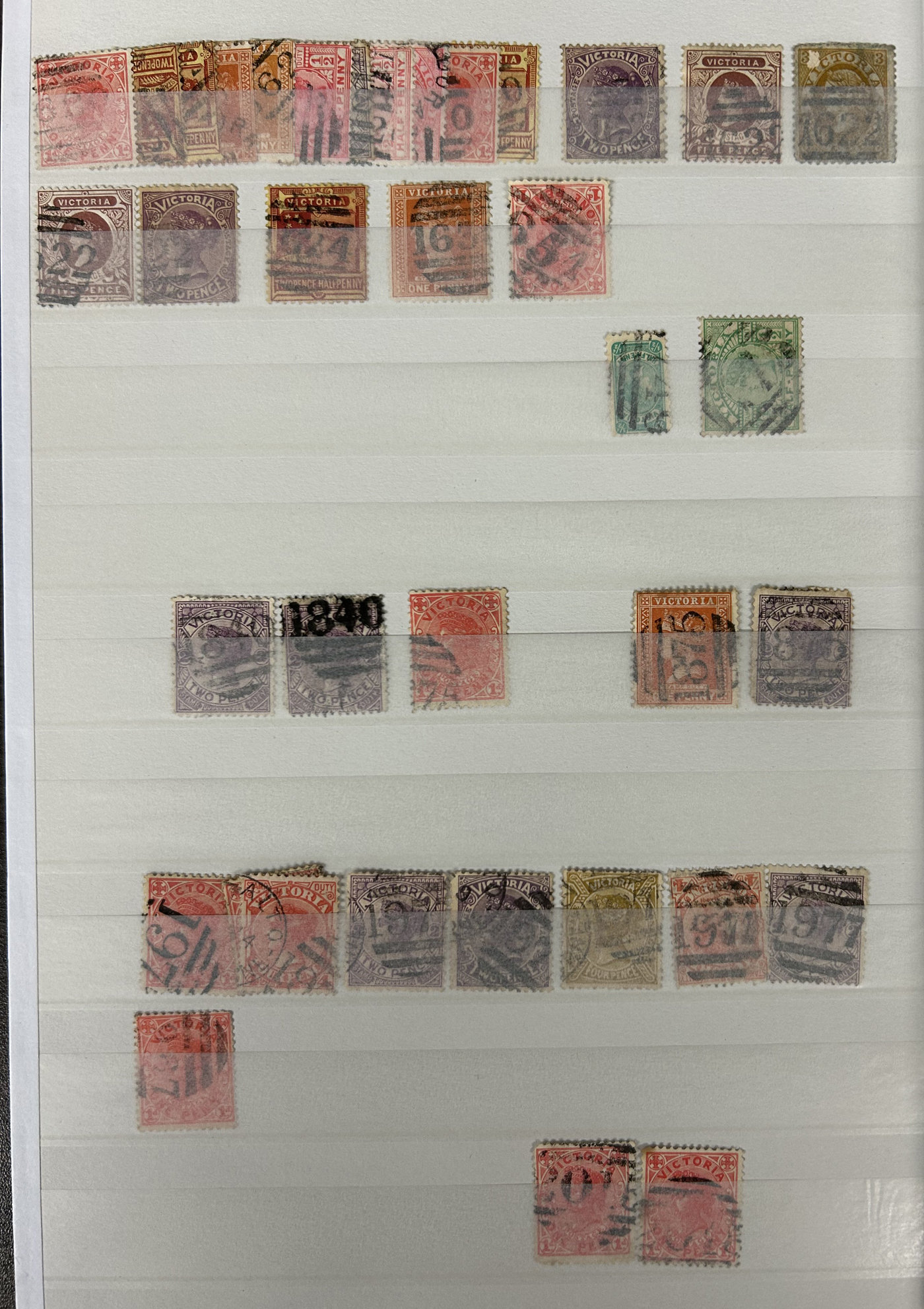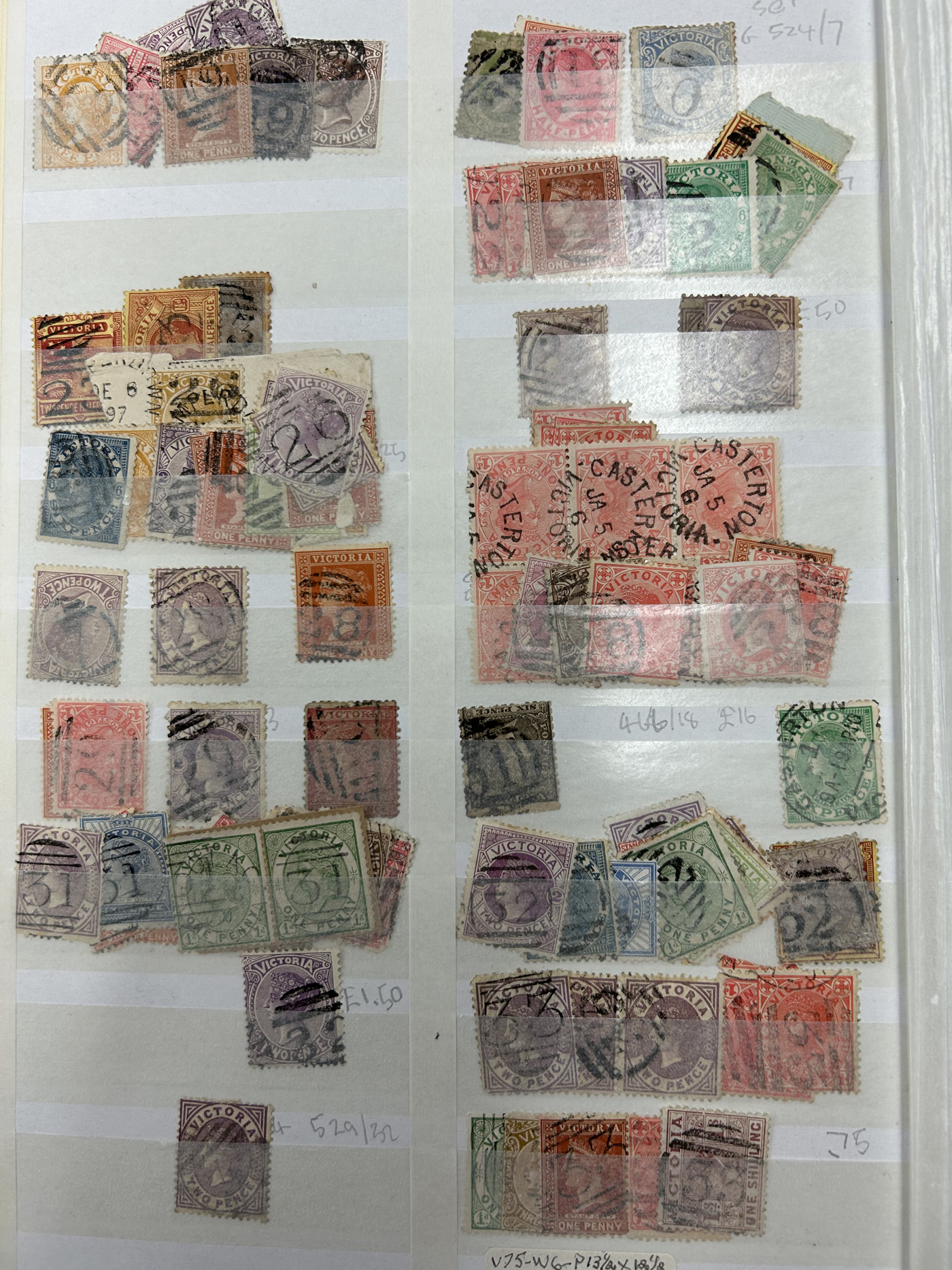 1247 O Victoria imageLarge Collection / Accumulation of Victoria Barred Numeral Postmarks on Victoria Stamps, displayed on 16 album pages, 4 black stock sheets, about 10 small black stock cards, several glassines and 102 cards plus two white envelopes. The lot probably contains several hundreds ( a few thousand?) Victoria stamp issues, each with a large assortment of barred numeral cancels. Unchecked by us for rare numerals or stamp / numeral combinations, see our many representative pictures to get an idea. (Scan 1) (Scan 2) (Scan 3) (Scan 4) (Scan 5) (Scan 6) (Scan 7) (Scan 8) (Scan 9) (Scan 10) (Scan 11) (Scan 12) (Scan 13) (All Scans)