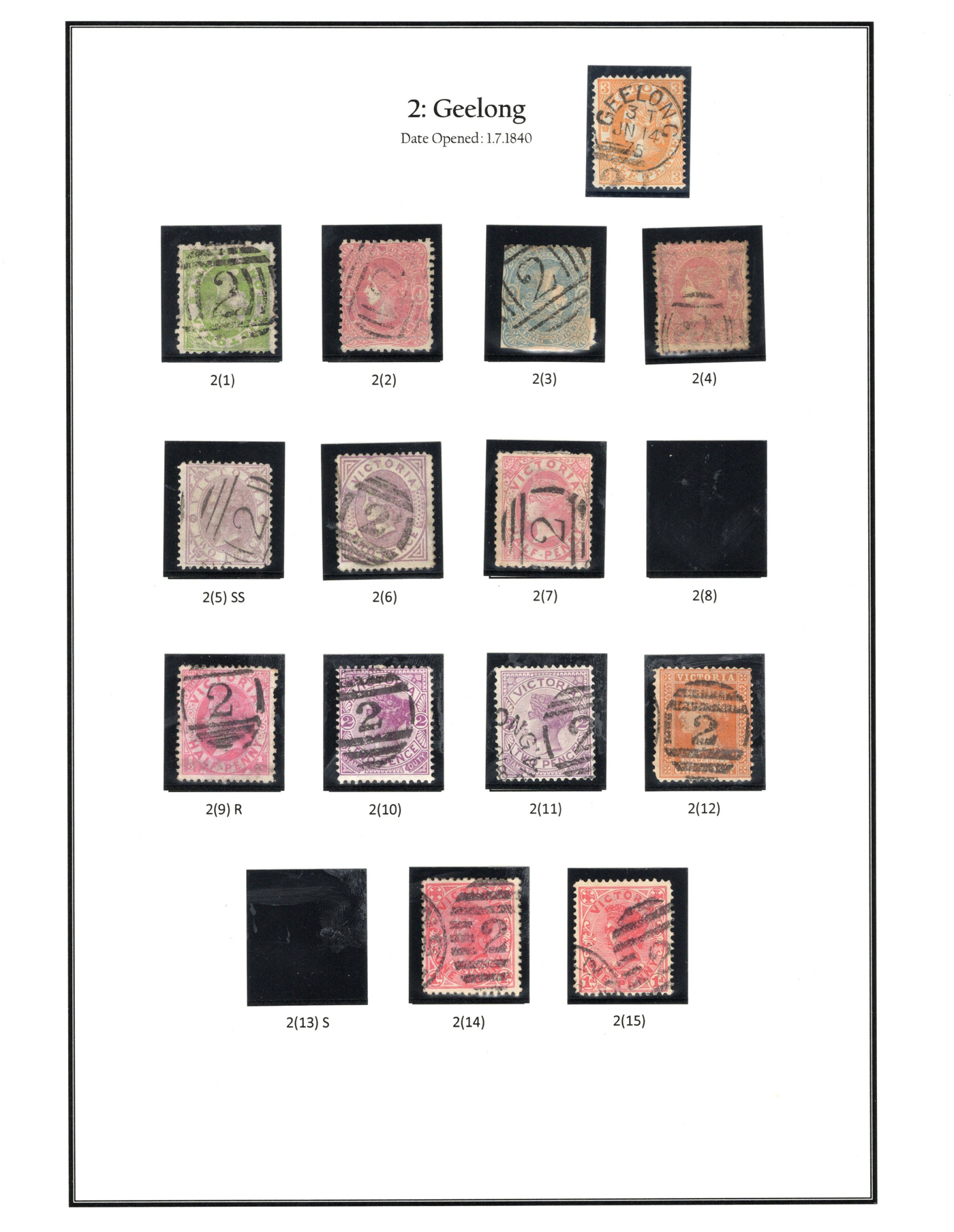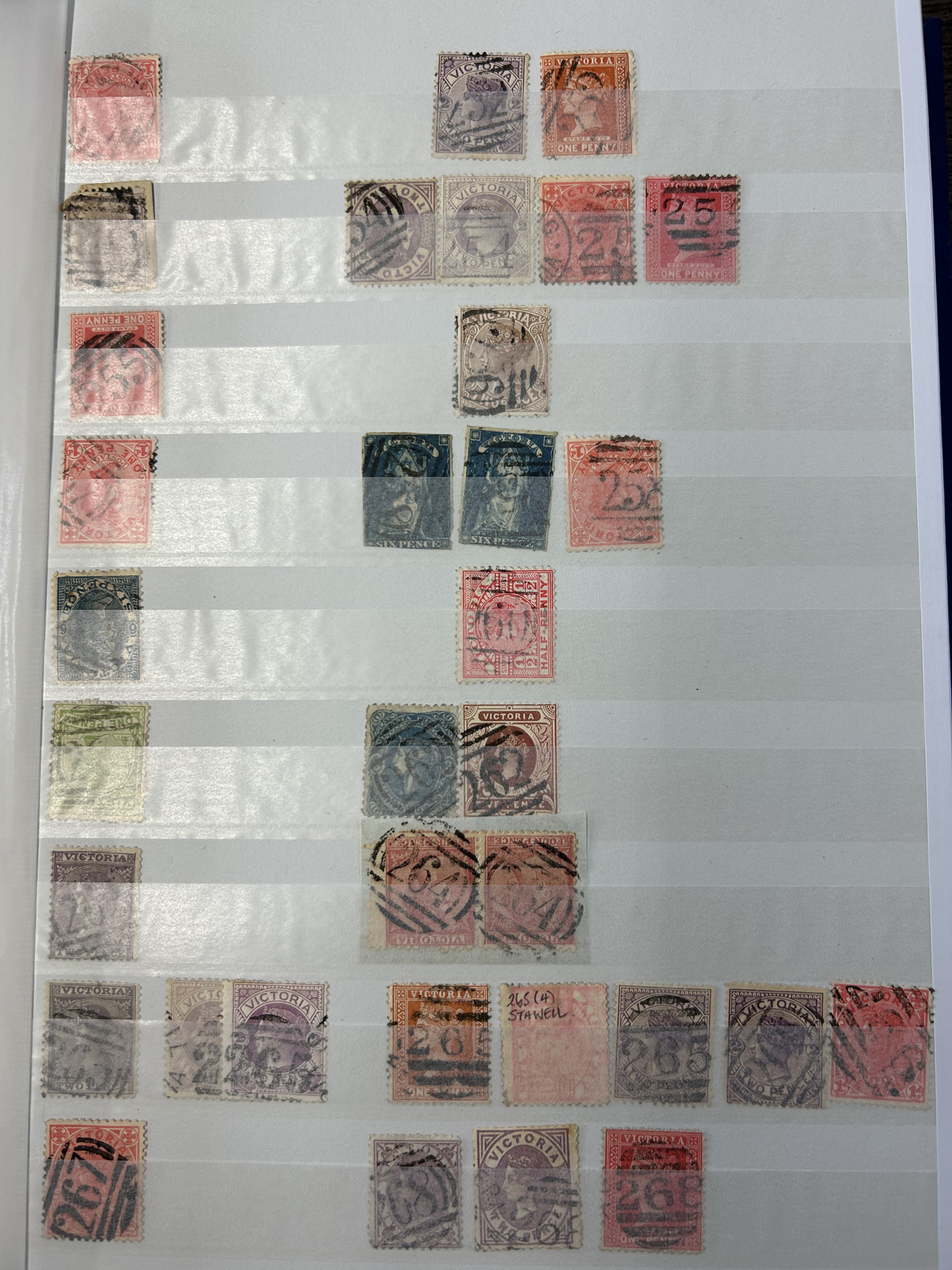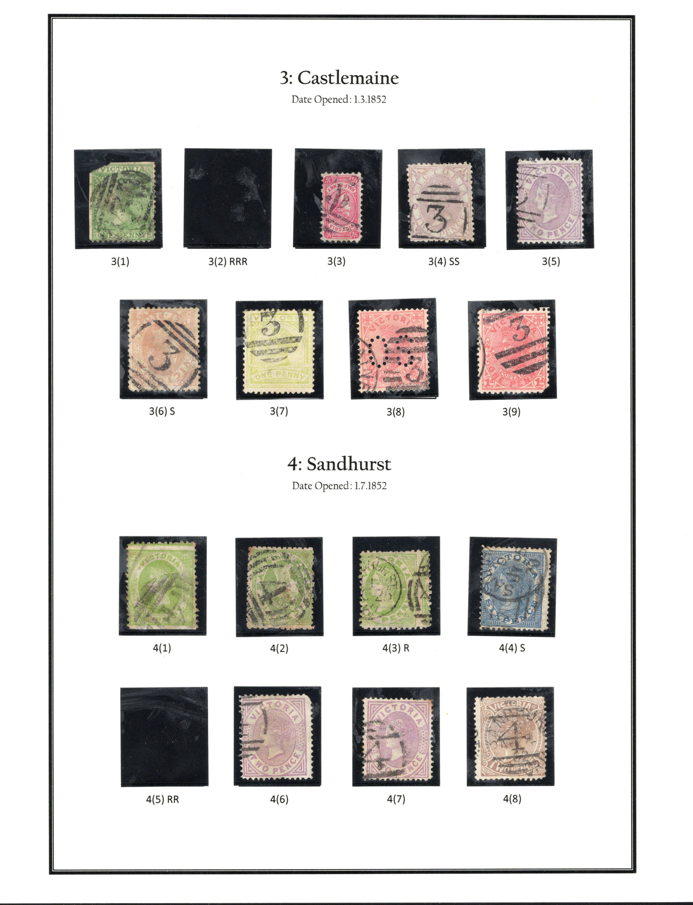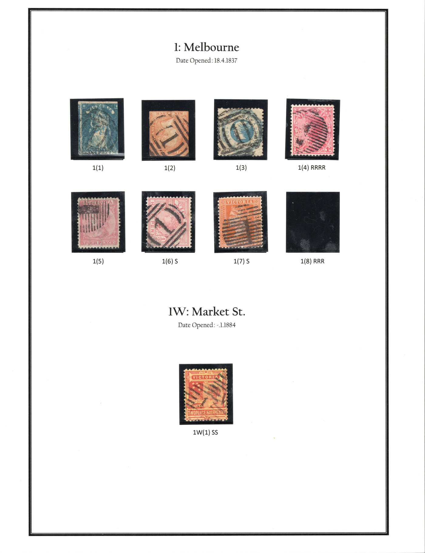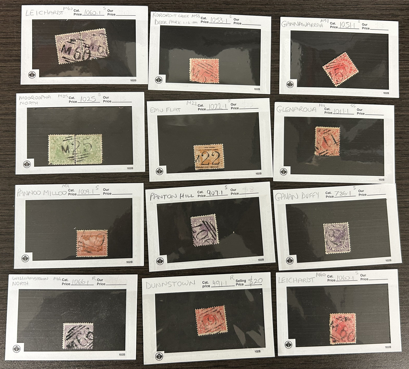 1247 O Victoria imageLarge Collection / Accumulation of Victoria Barred Numeral Postmarks on Victoria Stamps, displayed on 16 album pages, 4 black stock sheets, about 10 small black stock cards, several glassines and 102 cards plus two white envelopes. The lot probably contains several hundreds ( a few thousand?) Victoria stamp issues, each with a large assortment of barred numeral cancels. Unchecked by us for rare numerals or stamp / numeral combinations, see our many representative pictures to get an idea. (Scan 1) (Scan 2) (Scan 3) (Scan 4) (Scan 5) (Scan 6) (Scan 7) (Scan 8) (Scan 9) (Scan 10) (Scan 11) (Scan 12) (Scan 13) (All Scans)