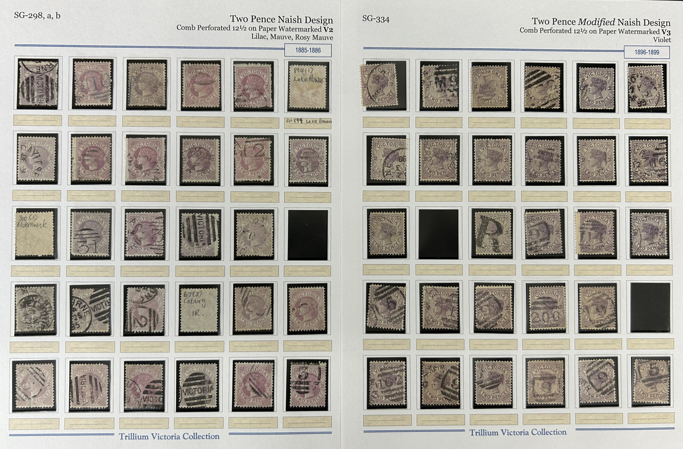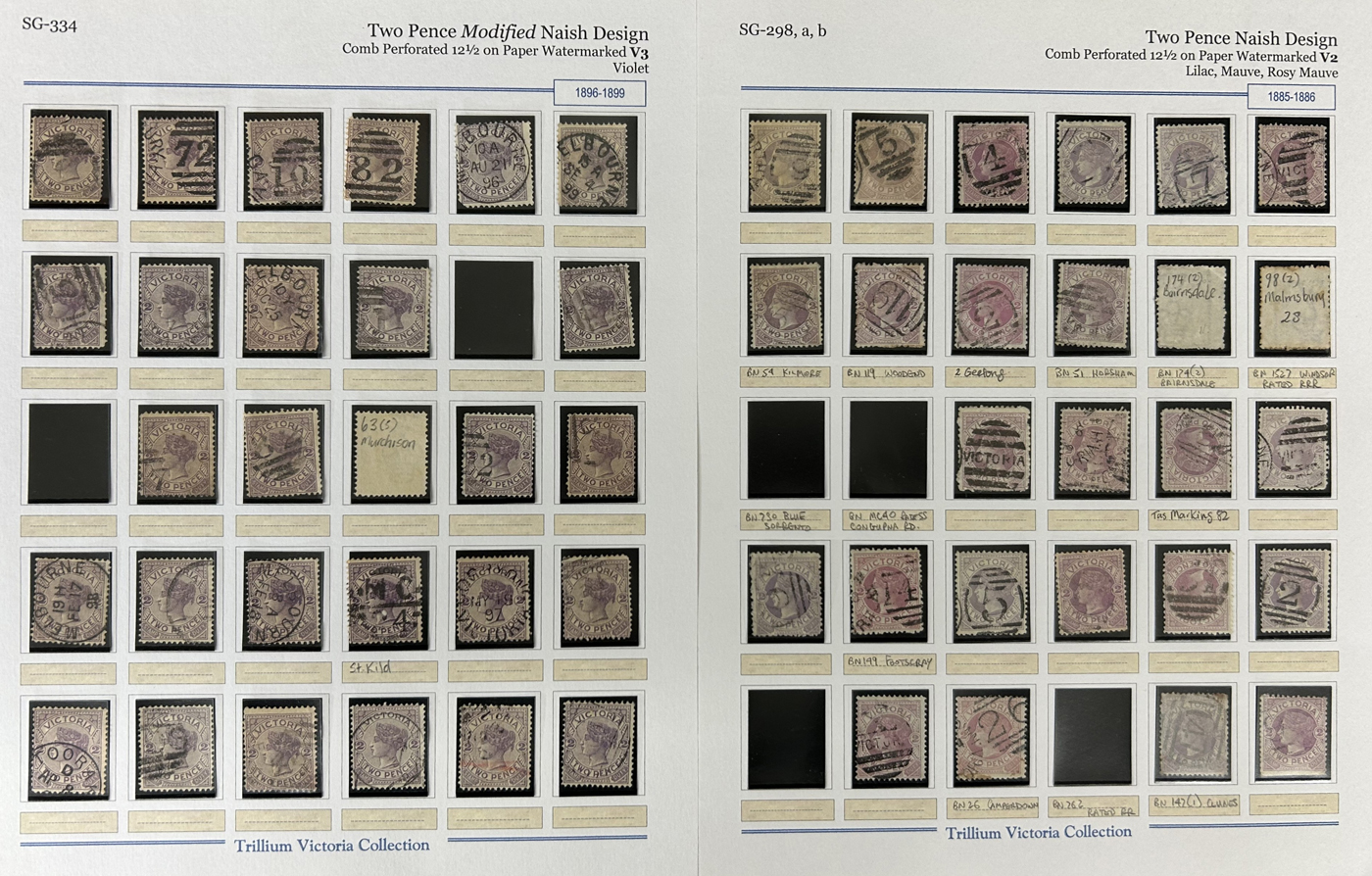 1249 O Victoria imageAdvanced Collection of Victoria Barred Numeral Cancels on Stamps, #1 to #2109, all neatly sorted and displayed in a thick stockbook. We counted a total of 2,200 different stamps, either by postmark, or stamp issue, as the collector worked on obtaining as many different postmarks on as many different stamps. Throughout the collection are many rare items, postmarks on Kangaroo and KGV stamps, coloured postmarks, a few complete duplex, and much more. The collection was assembled using the 2018 Brusden White "The Barred Numerals of Victoria" publication (offered separately in our literature section) which the owner used to check mark each postmark he owned. A rare offering, with each postmark being the best the collector could find, in terms of clarity and centering, includes many RR and RRR, RRRR (etc.) items, overall fine or better. We photographed several random pages to give a flair of what to expect. Should easily be worth our low estimate of just over C$1 a stamp. (Scan 1) (Scan 2) (Scan 3) (Scan 4) (Scan 5) (Scan 6) (Scan 7) (Scan 8) (All Scans)