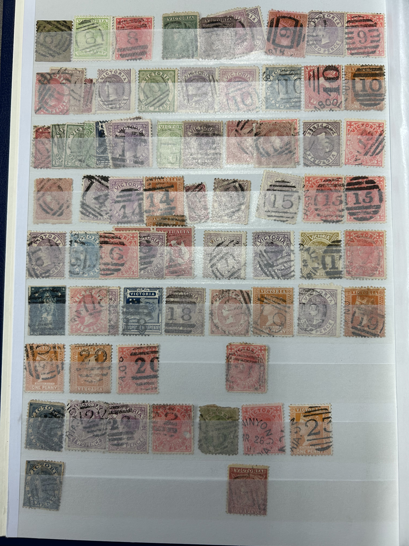 1251 O Victoria imageLarge Accumulation of Victoria Barred Numeral Cancels on Stamps, with roughly 2,000 stamps, all displayed numerically filling a thick 64 page stockbook. We note a good variety of different numbers, on a good variety of different stamp issues, with a few Australian issues, some coloured cancels, surely several rarer numbers, etc. A rare offering of what could be a very useful "stock" for collectors or dealers alike. Overall fine or better, see our many random pictures for an idea. Comes with a quality set of album pages to display these stamps, prepared by Jérémie Guerra in 2023, with spaces for all the barred numerals, with identification and rarity factors (the owner has started to insert stamps in this, and there are currently 44 stamps in it). Should easily be worth our 50c Canadian per stamp estimate. (Scan 1) (Scan 2) (Scan 3) (Scan 4) (Scan 5) (Scan 6) (Scan 7) (Scan 8) (Scan 9) (Scan 10) (Scan 11) (Scan 12) (All Scans)