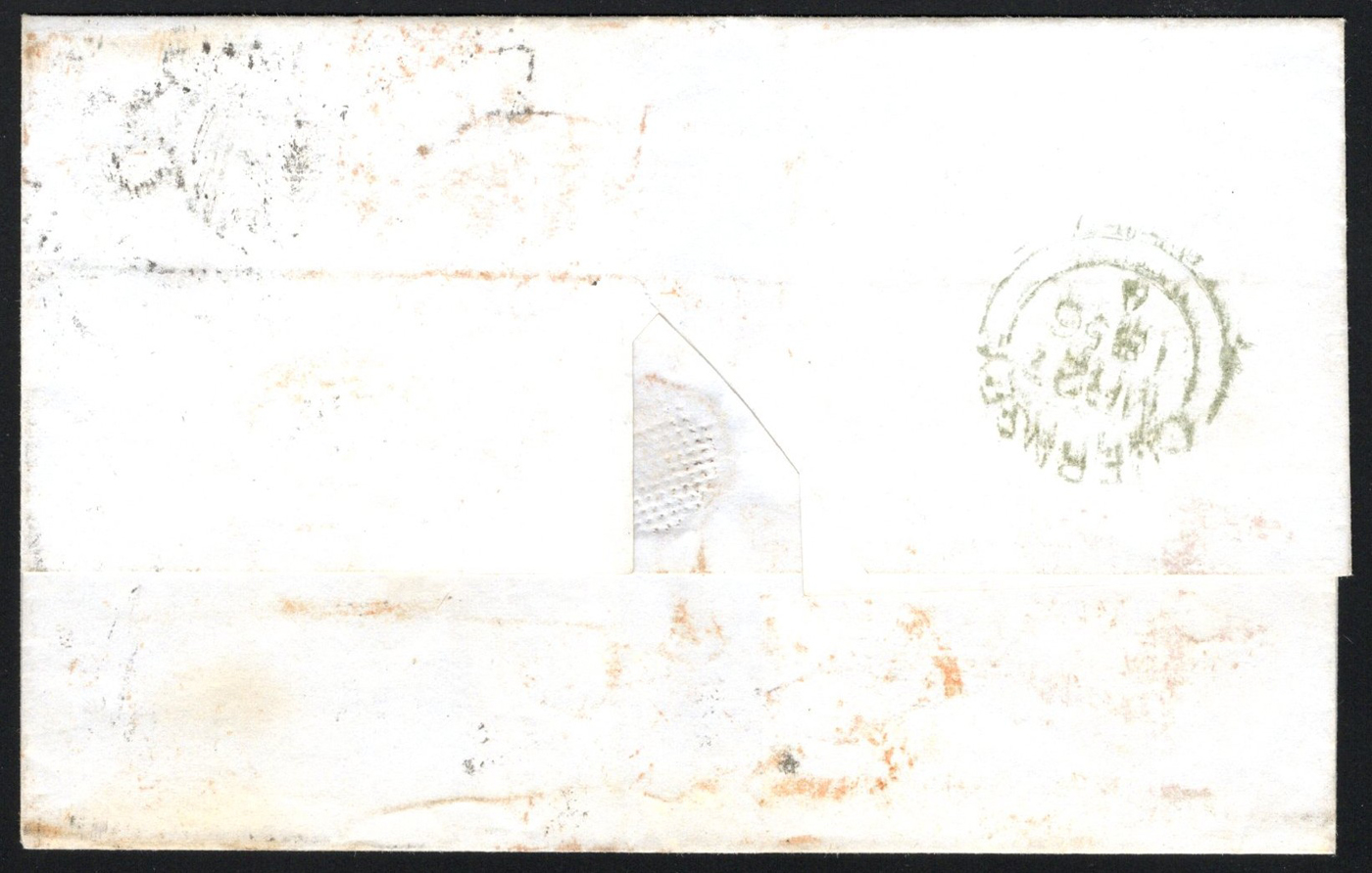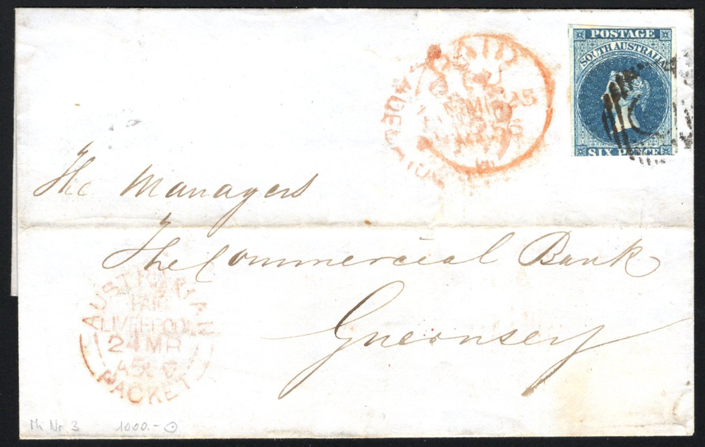 1241 CVR South Australia image1856 6d Blue Imperforate on Folded Cover to Guernsey, mailed from Adelaide on DEC.10 (?) 1856 and franked with a 6d blue Queen Victoria imperforate adhesive, tied by a circular grid cancel. The cover (no letter inside) is addressed to Guernsey and has a MAR.27.1856 double-circle receiver in green. There are also two additional handstamps including a double-circle "AUSTRALIAN / PACKET / Paid Liverpool" (dated MAR.24) and a circular PAID in red (dated MAR.25), both likely applied in England. Horizontal crease, else very fine. (Scan 1) (Scan 2) (All Scans)