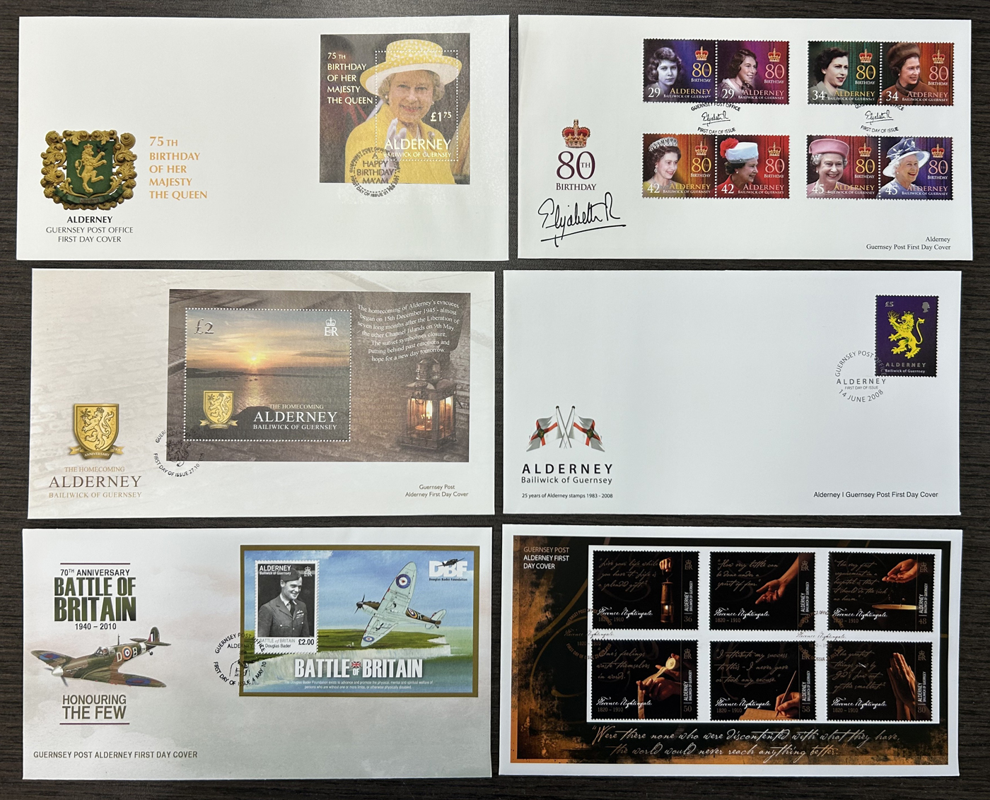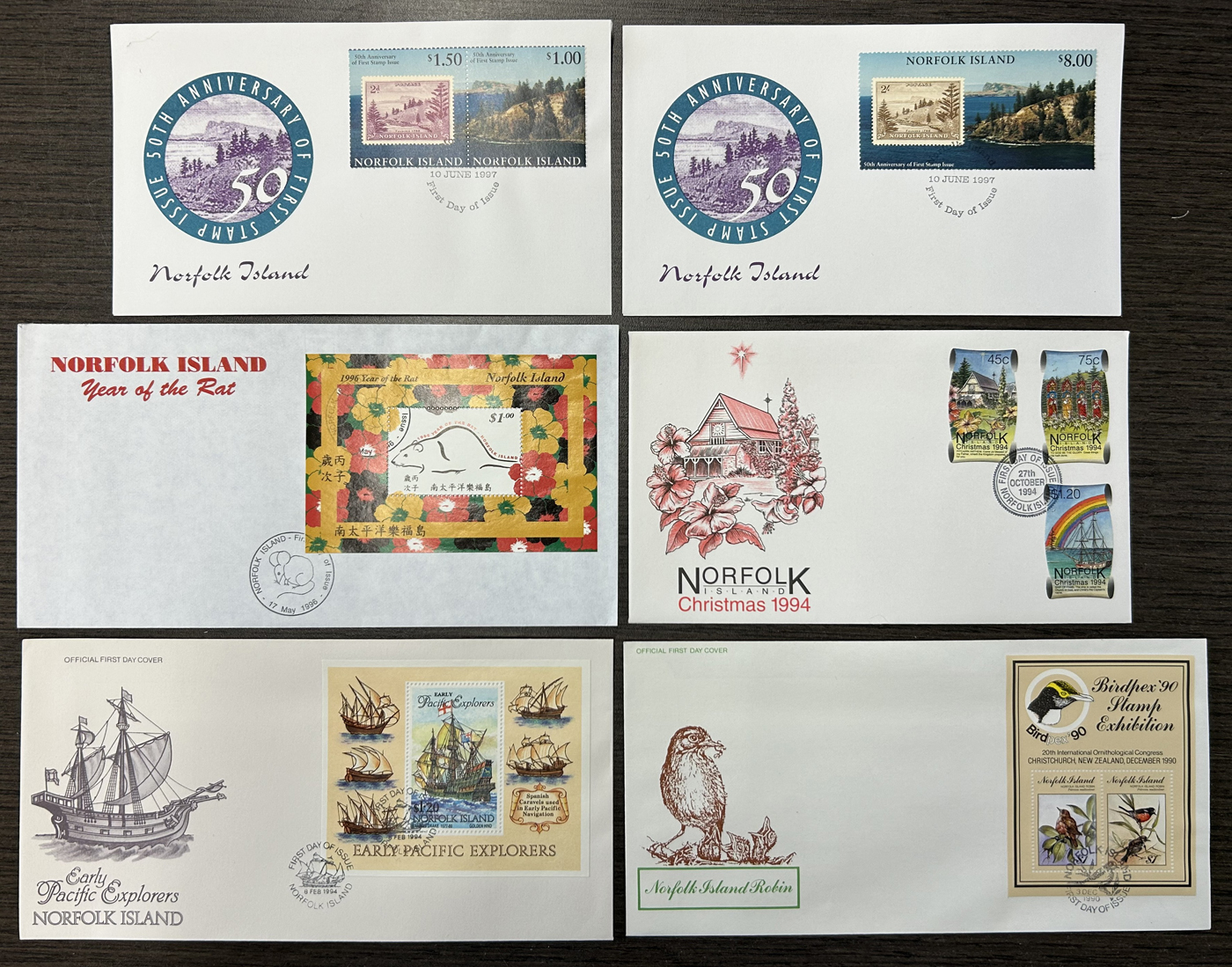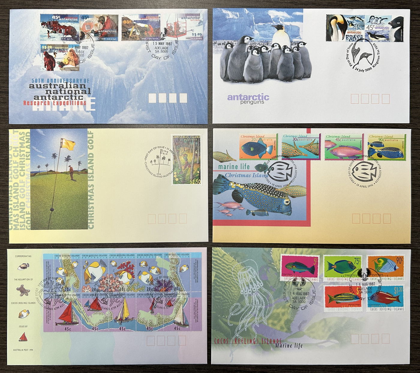 1258 CVR   imageGroup of 359 Different Unaddressed First Day Covers from 6 Different Countries, Alderney has 87 from 1998 to 2010, Norfolk Island has 168 from 1976 to 1997 (plus a few aerogrammes), Cocos (Keeling) Islands has 18 from 1994 to 2000, Christmas Island has 21 from 1994 to 1997, Australian Antarctic Territory has 2 from 1997 and 2000, and Great Britain has 64 from 1971 to 1980 (plus 13 Air Letters). A very fine group. (Scan 1) (Scan 2) (Scan 3) (All Scans)