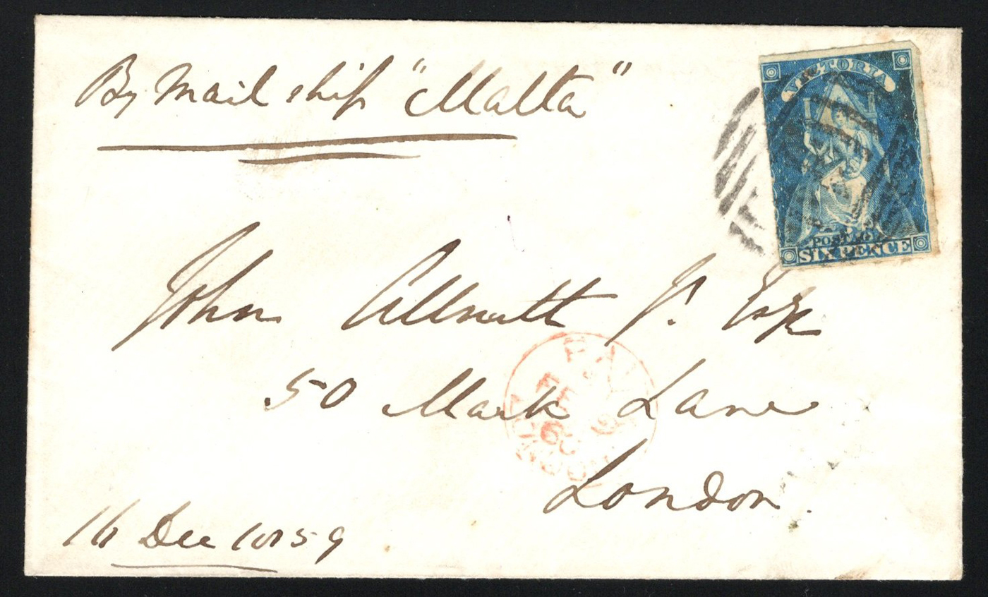 1253 CVR Victoria #30 image1859 6d Cover Melbourne to Great Britain, mailed Melbourne on DEC.16.1859 (datestamp on back) to London, England, with red FEB.9.1860 English entry c.d.s., endorsed "Per Mail Ship Malta". The cover is franked with a 6d blue Queen Victoria on Throne rouletted, tied by a circular barred cancel. Very fine. (Scan 1) (Scan 2) (All Scans)