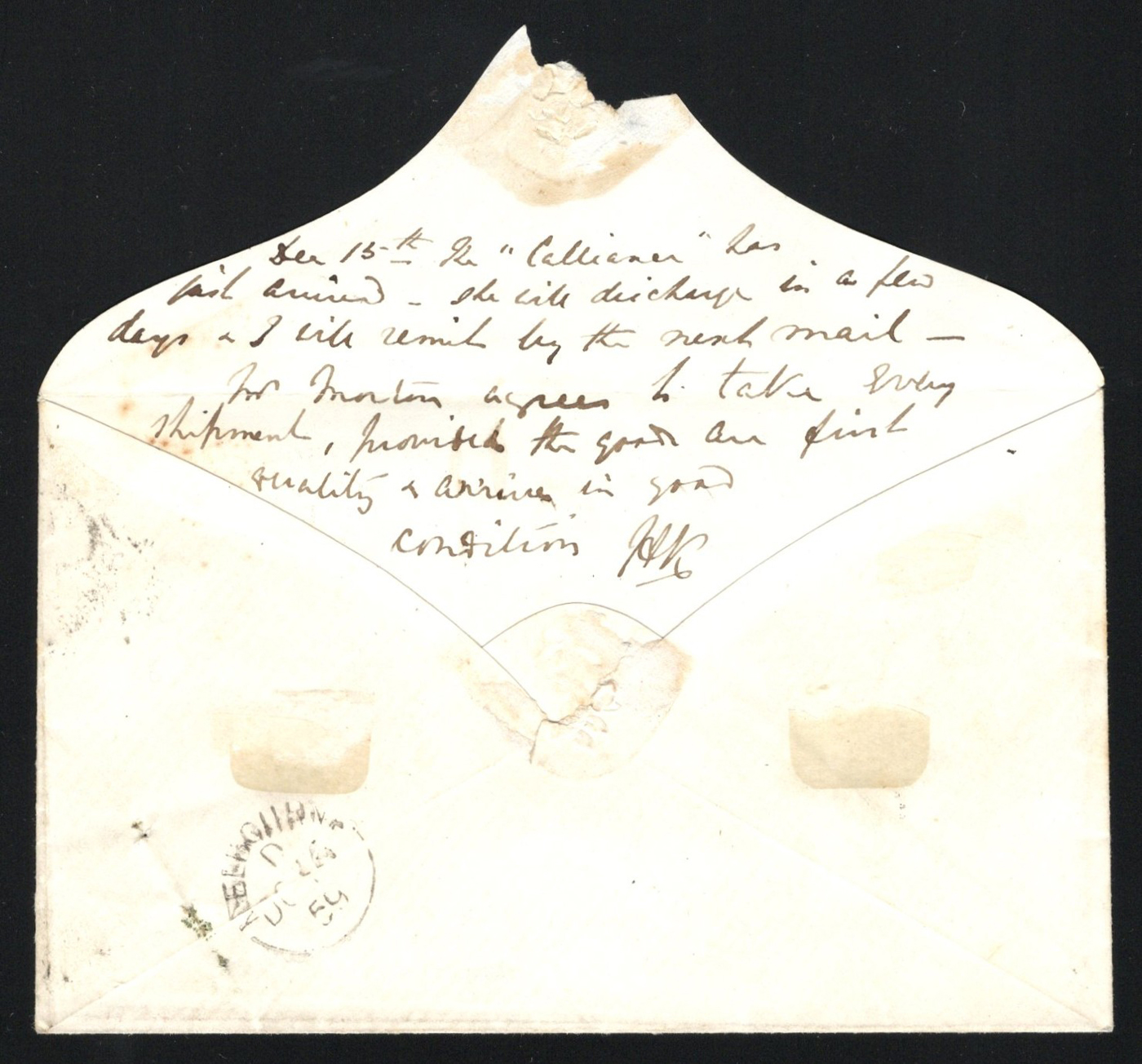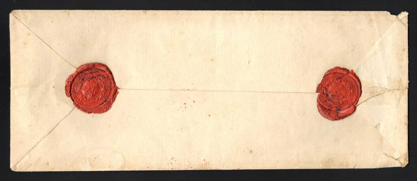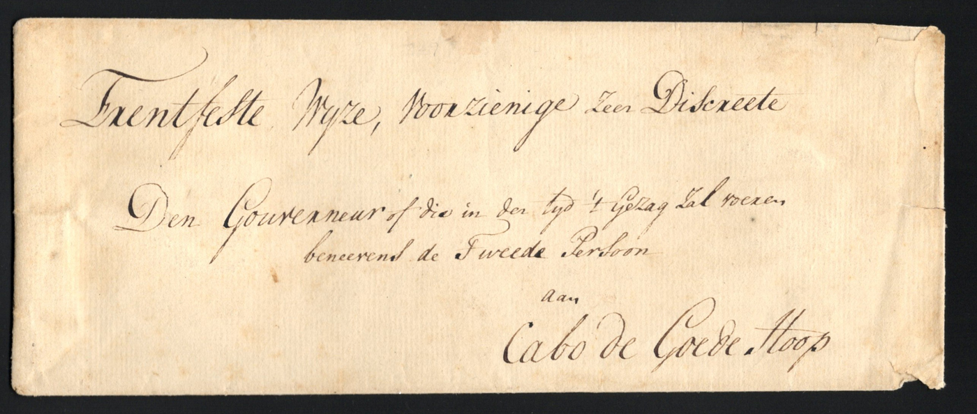 1260 CVR   imageStampless Cover Mailed Holland to Cape of Good Hope, an undated (owner thinks 17th century based on the paper structure) early envelope from Holland and addressed to "The Governor or in his place the Second Person in command of Cape of Good Hope" (translation), with two intact red wax seals showing the VOC monogram with a "c" added at base and an "s" at top. Minor faults, else very fine. (Scan 1) (Scan 2) (All Scans)