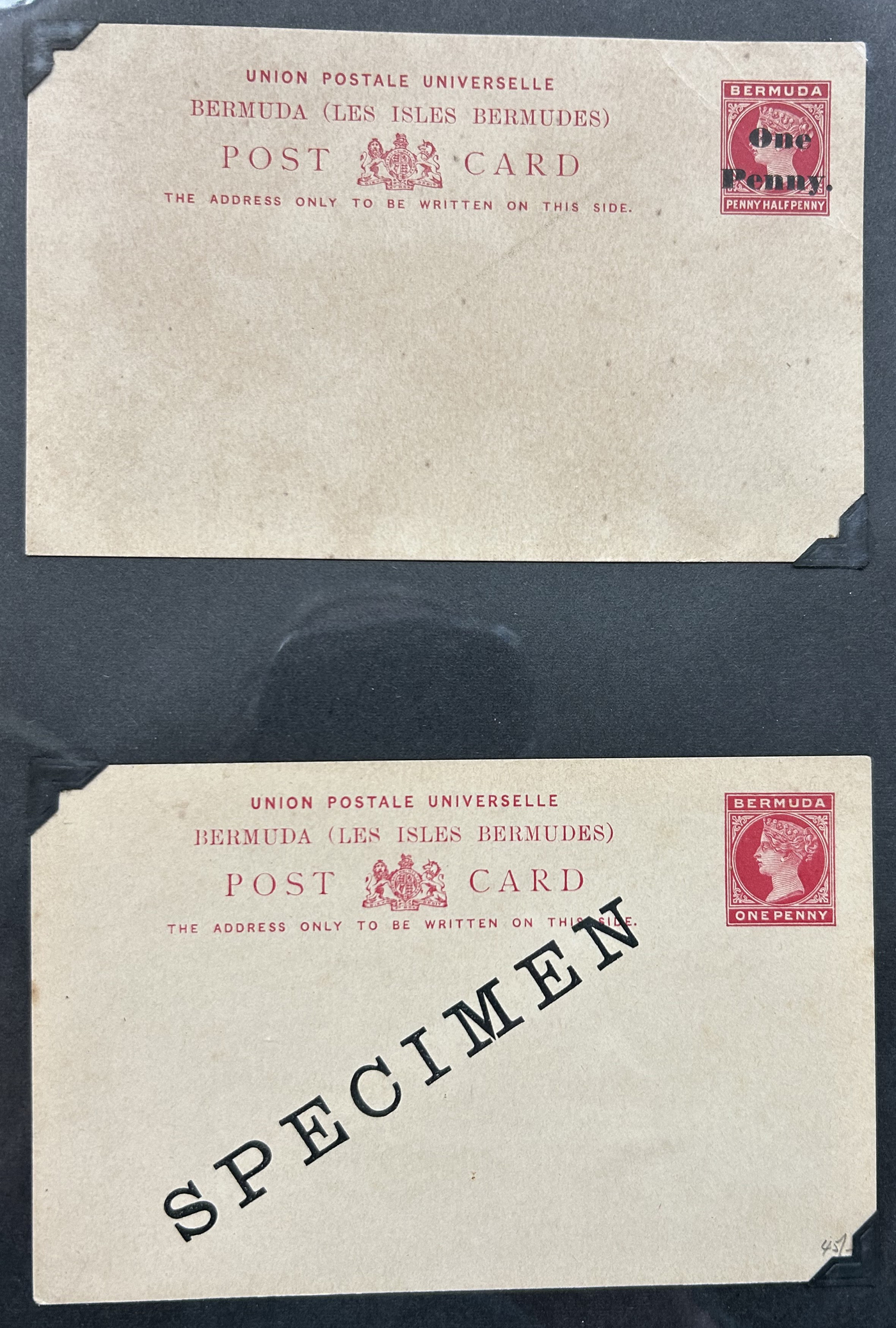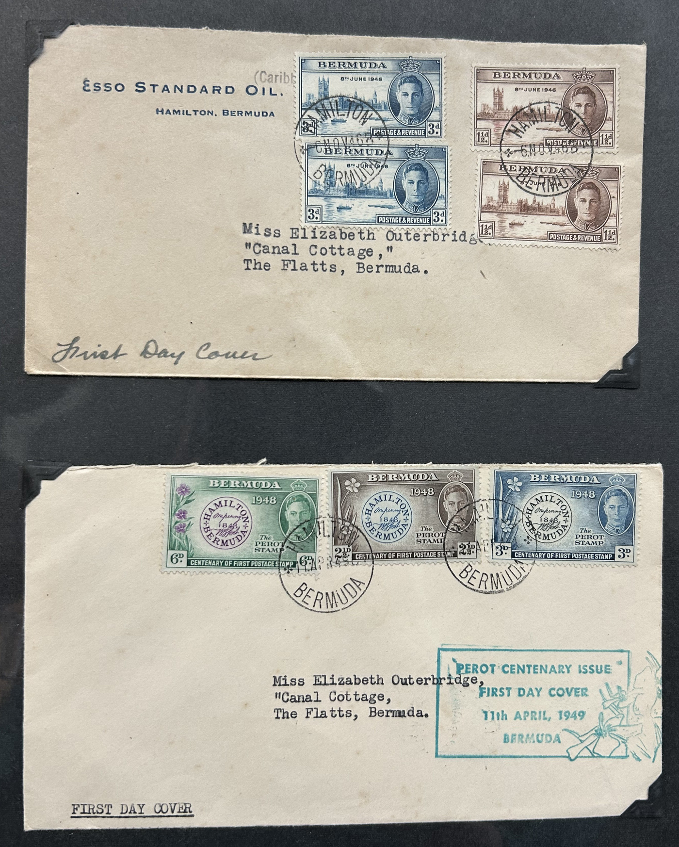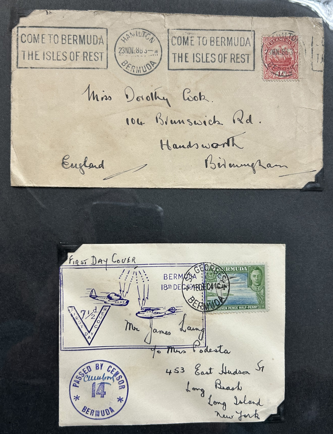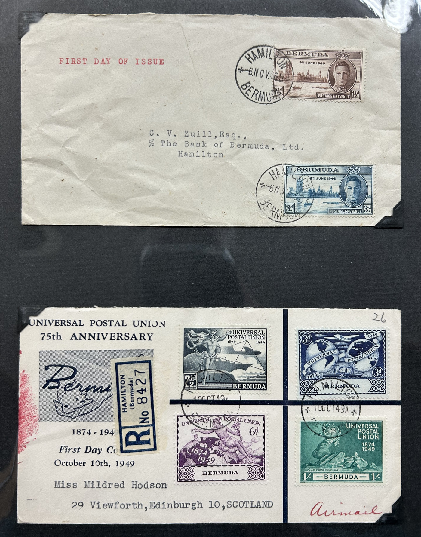 1257 CVR   imageCollection of Bermuda Postal History, Victorian Era to the 1960s, with just over 60 items, including 17 postal stationery cards (QV to QEII, mostly unused, with two SPECIMEN cards, a UPU card with reply portion attached, etc.). Rest are covers, including first day covers (noted 1935 Jubilee, 1936 Pictorial, 1946 Peace, 1949 U.P.U., and many more), first flight covers from 1937 to 1948, various event covers, etc. We also note better frankings, including a few "key plates", etc. Overall very fine and desireable, our photos only show a sampling. (Scan 1) (Scan 2) (Scan 3) (Scan 4) (Scan 5) (Scan 6) (Scan 7) (Scan 8) (Scan 9) (Scan 10) (Scan 11) (Scan 12) (Scan 13) (All Scans)