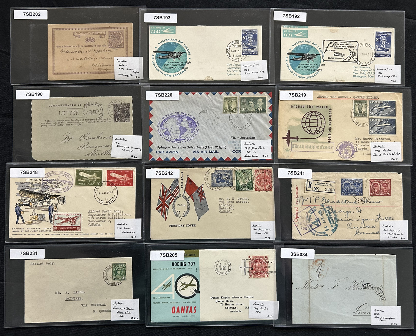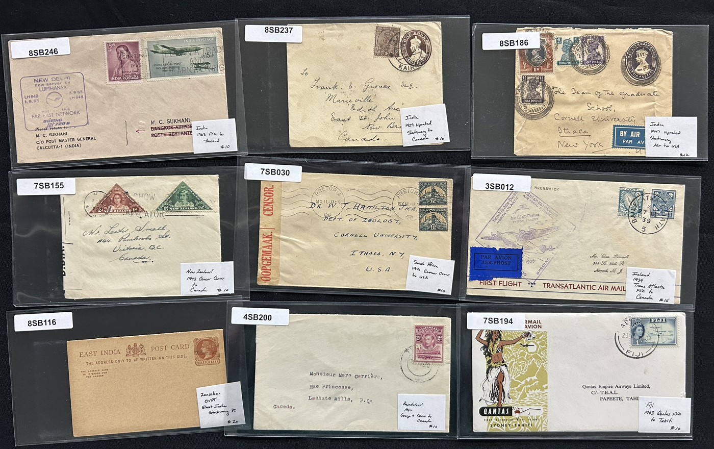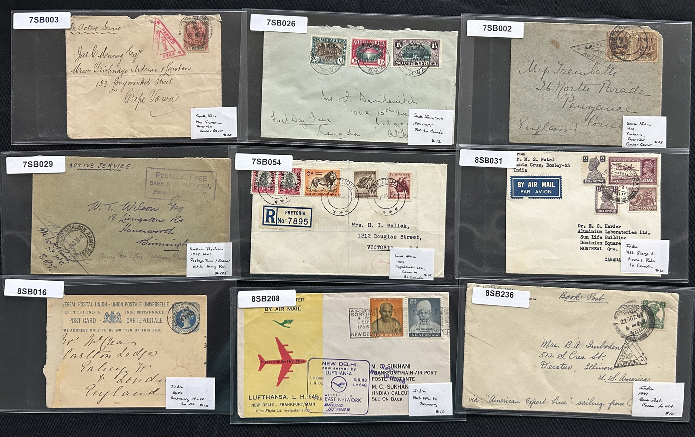 1259 CVR/PC   imageGroup of 75 British Commonwealth Country Covers and Cards, 1910s to 1950s, with others on either side of the date range. We note interesting material from Ireland (x10), New Zealand (x14), South Africa and Area (x7), India (x12), Australia (x20) and a range of other countries (x12 items) with interest in frankings, rates, postmarks, airmail, first days, first flights, registered, stationery cards, an 1847 folded stampless cover from Gibraltar, censored, a 1915 WWI "Postage Free" Northern Rhodesia cover and much more. An interesting group, all sleeved, priced and pictured online. Overall very fine. (Scan 1) (Scan 2) (Scan 3) (Scan 4) (Scan 5) (Scan 6) (Scan 7) (All Scans)