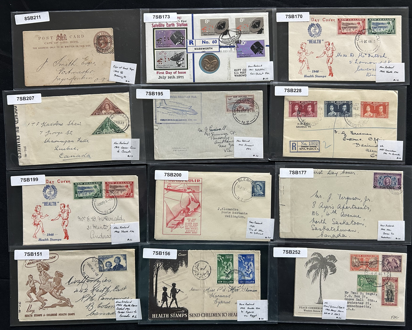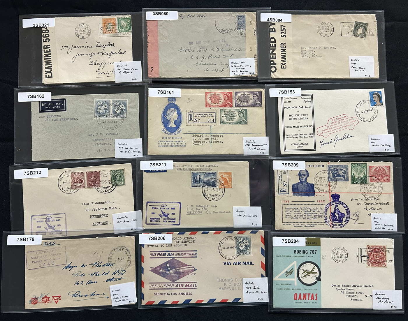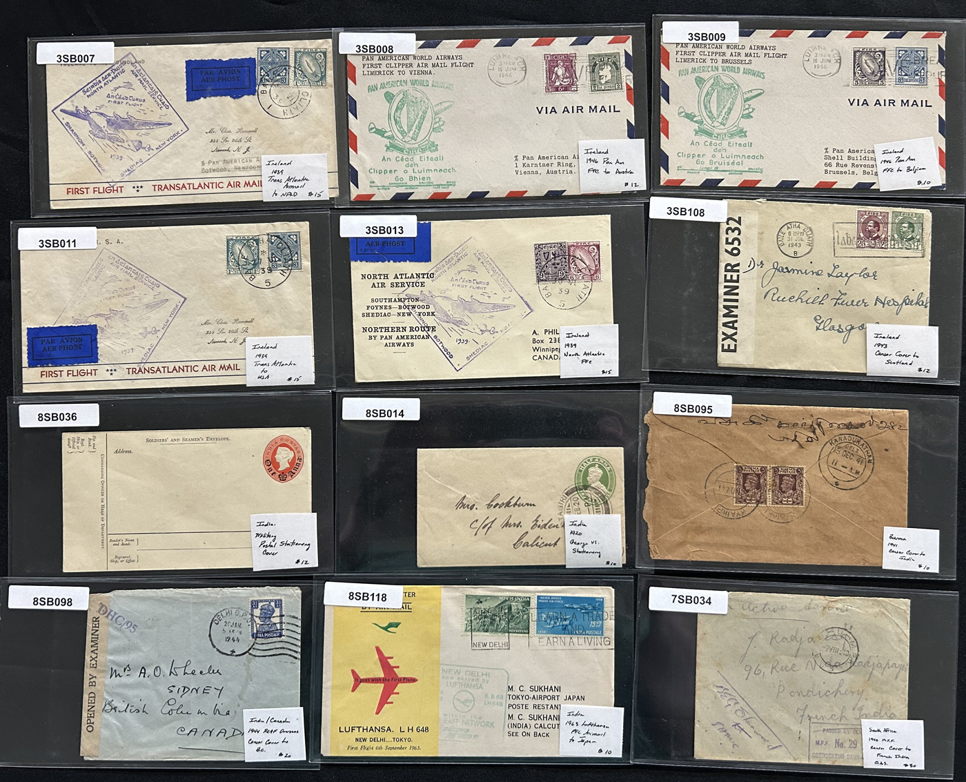 1259 CVR/PC   imageGroup of 75 British Commonwealth Country Covers and Cards, 1910s to 1950s, with others on either side of the date range. We note interesting material from Ireland (x10), New Zealand (x14), South Africa and Area (x7), India (x12), Australia (x20) and a range of other countries (x12 items) with interest in frankings, rates, postmarks, airmail, first days, first flights, registered, stationery cards, an 1847 folded stampless cover from Gibraltar, censored, a 1915 WWI "Postage Free" Northern Rhodesia cover and much more. An interesting group, all sleeved, priced and pictured online. Overall very fine. (Scan 1) (Scan 2) (Scan 3) (Scan 4) (Scan 5) (Scan 6) (Scan 7) (All Scans)