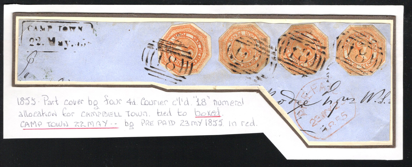 1243 O Tasmania imageFour 4d Red Orange Queen Victoria Octagonal Imperforates on Large 1855 Piece, each cut-to-shape stamp is tied by a #18 (Campbell Town) grid cancel, with boxed "CAMP TOWN / 22.May.1855" in black at upper left and an "PRE-PAID 23 MY 23 / 1855" semi-circle in red. Fine and scarce, ex Clements.