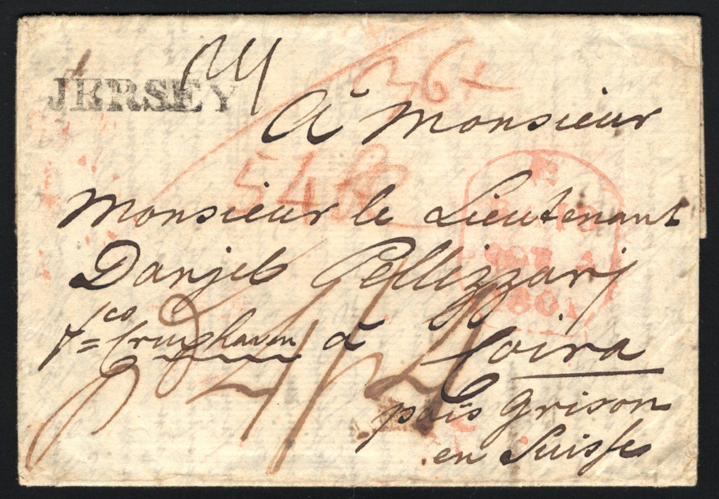 1306 CVR   image1801 Folded Letter Jersey to Switzerland, lengthy letter inside (in German) is datelined 1801, mailed with "JERSEY" straight despatch handstamp (used 1797-1810), with GPO 1801 tombstone in red on front, with several rate markings in red and black crayon. Very fine and a scarce destination. (Scan 1) (Scan 2) (All Scans)
