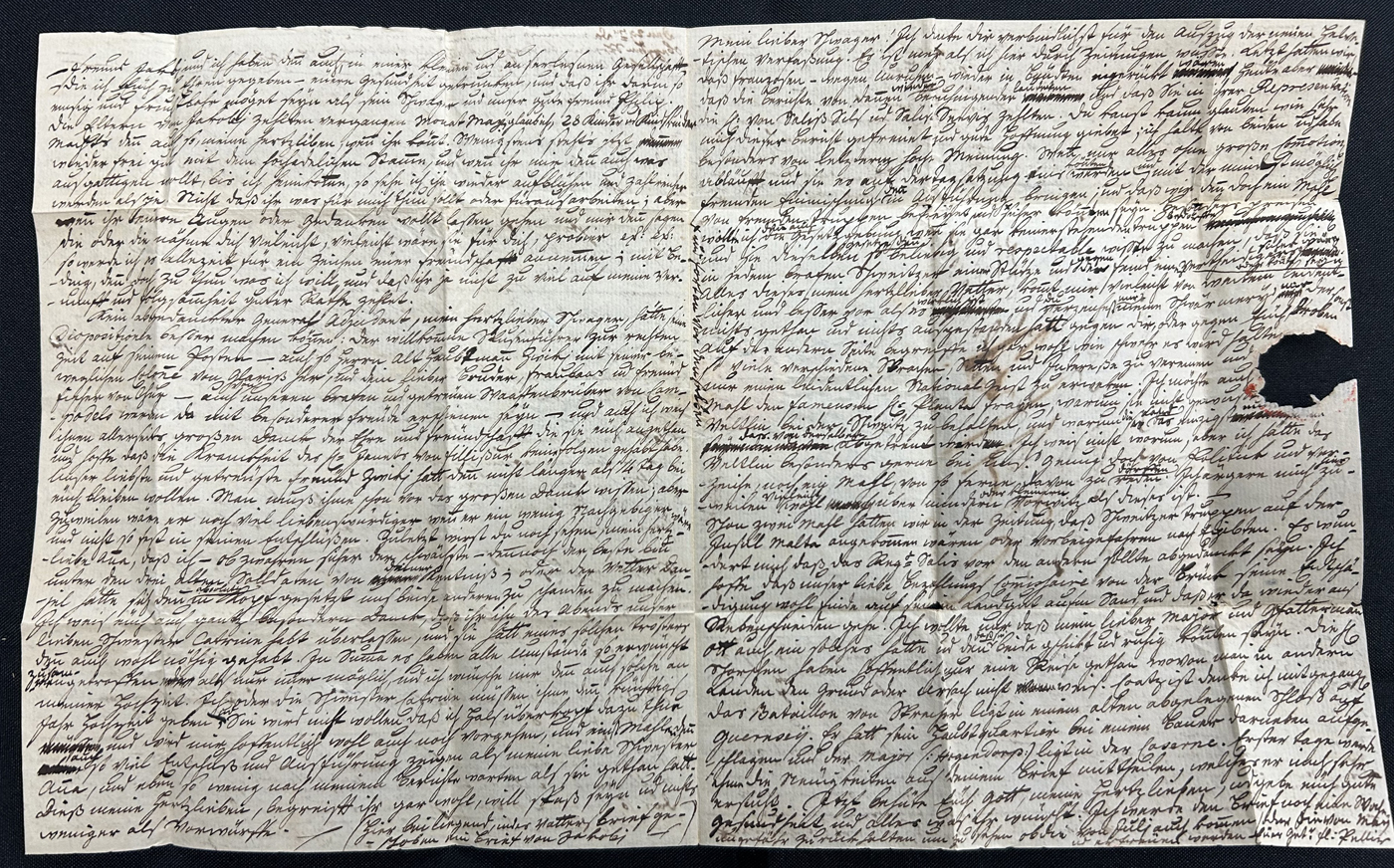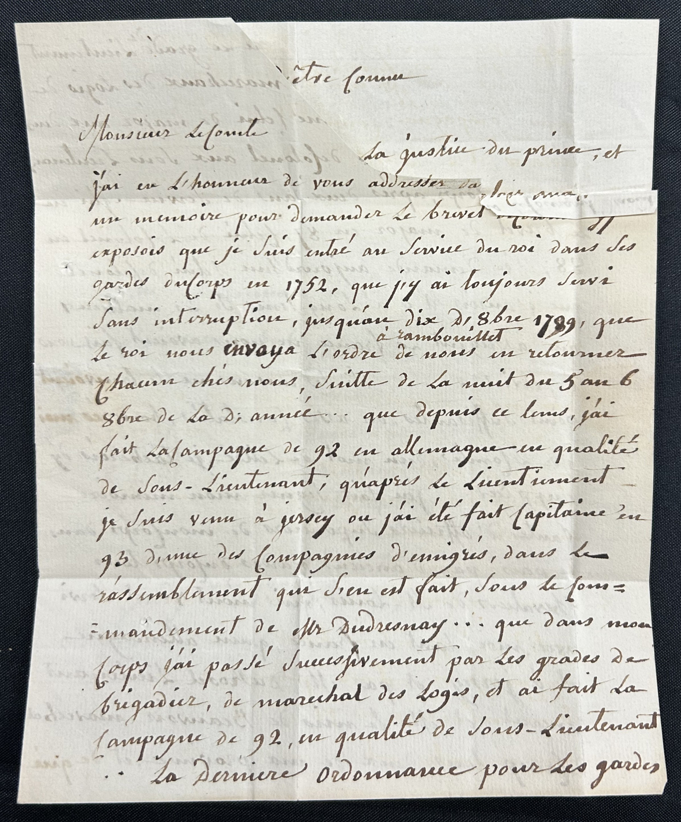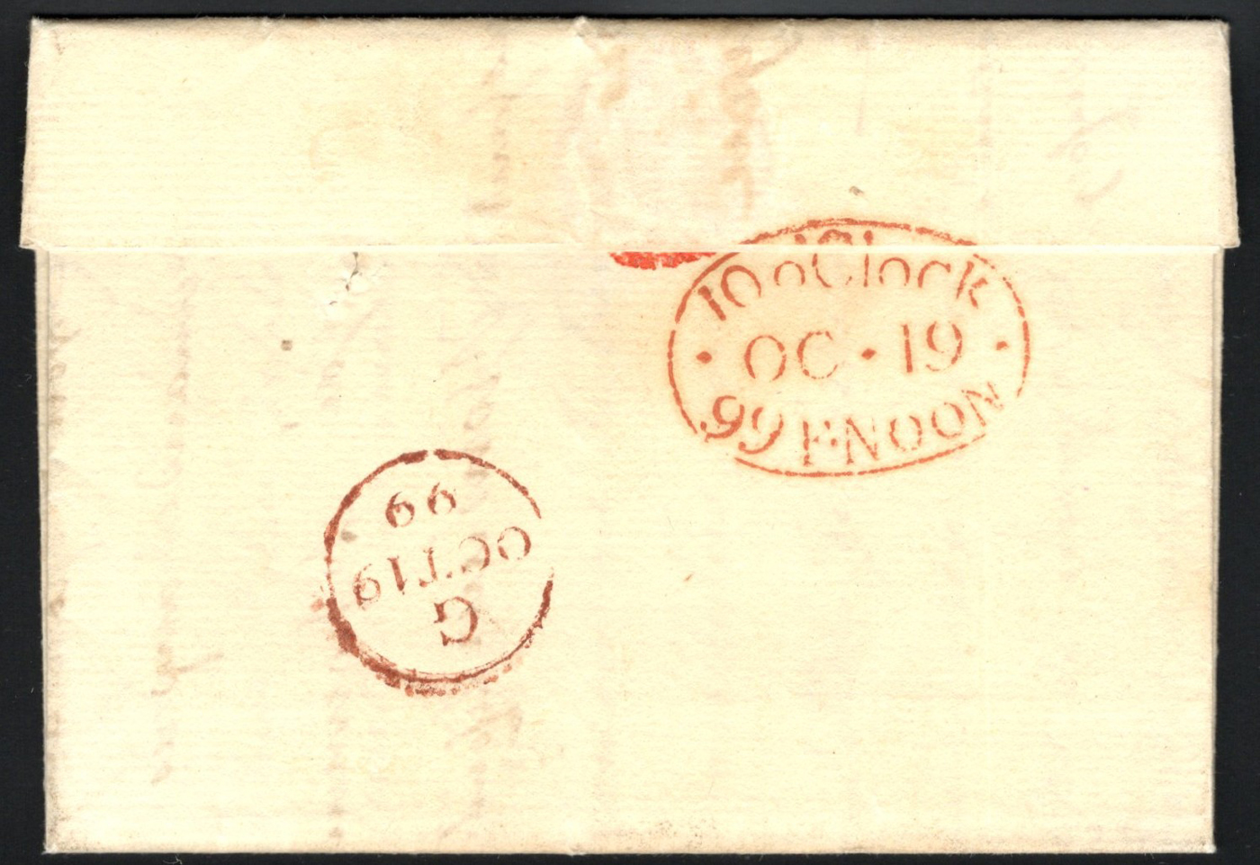1305 CVR   image1799 Folded Letter Jersey to London, England, 3-page letter inside (in French) is dated "15 octobre 1799", with straight line "JERSEY" despatch handstamp (used 1797-1810) and OCT 19 / 99 circular GPO receiver in dark red, alongside an oval "10 oClock / 99. F. Noon / OC 19" handstamp in red. In the letter, the writer is asking to be promoted to Colonel, due to his many years of continuous service to the King ("since 1852, up until the King told us all to go back home" and continues to describe his years of service, including the "German campaign in 92" (Scan 1) (Scan 2) (Scan 3) (All Scans)