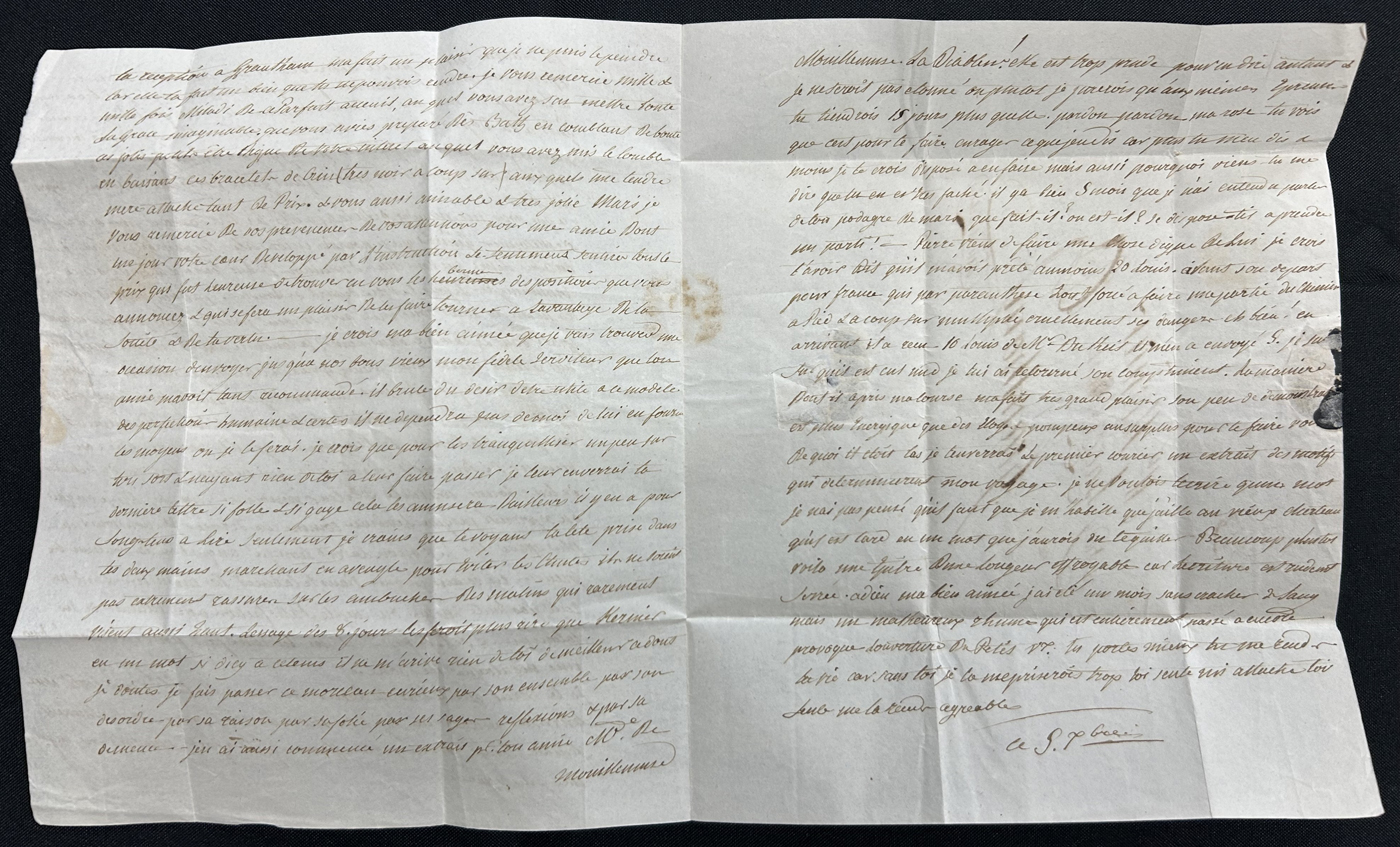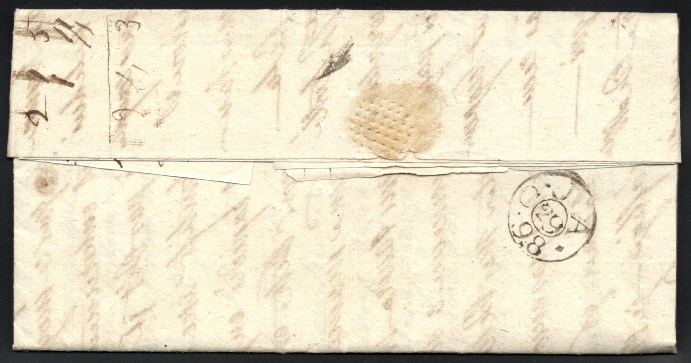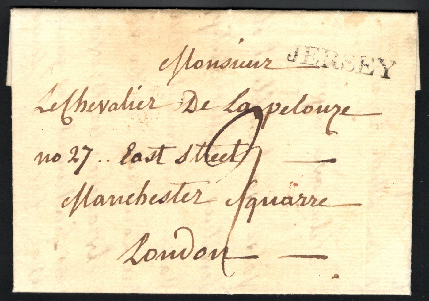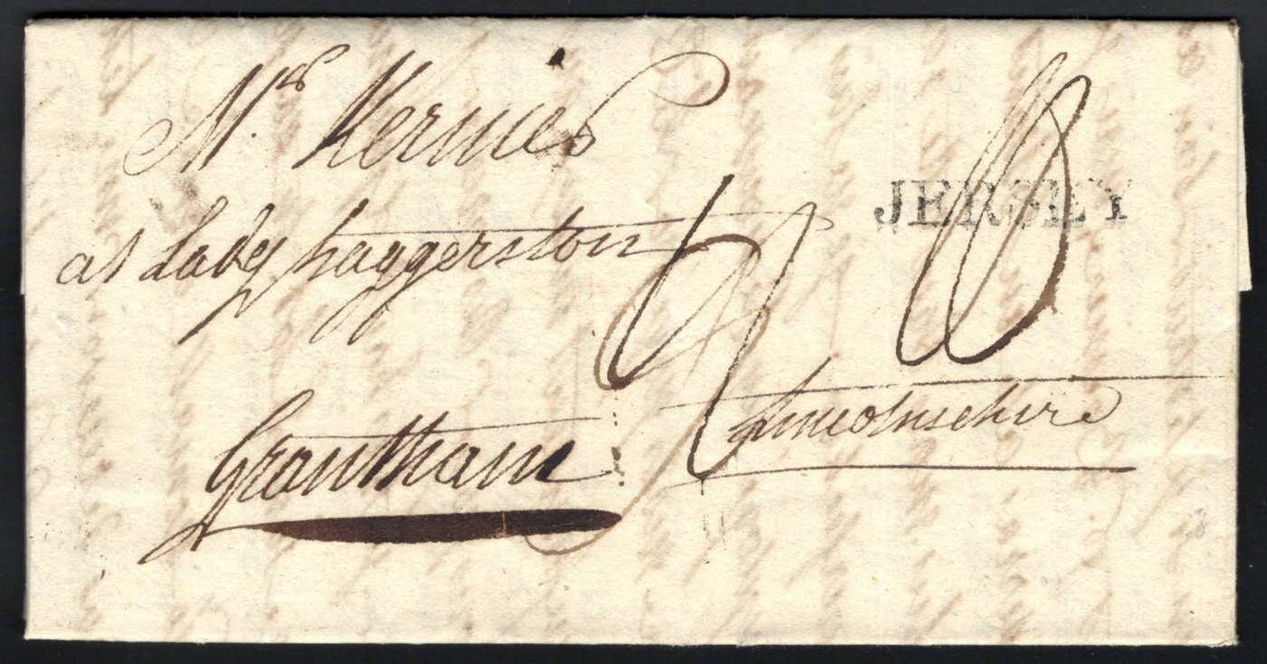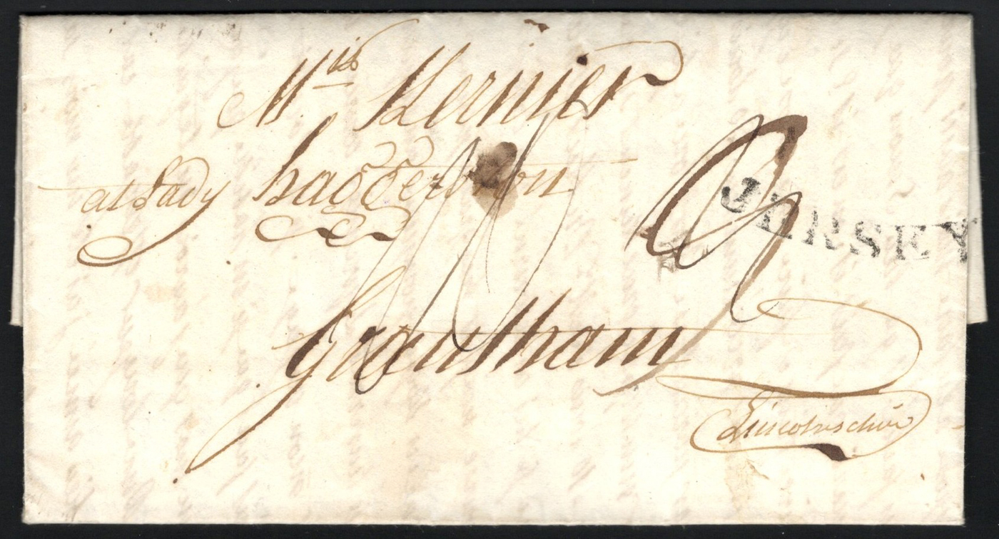 1303 CVR   image1797 Folded Letter Jersey to Grantham, England, lengthy letter inside (in French) is undated, with concave "JERSEY" despatch handstamp (used 1797-1799 only) and DE / 11 / 97 GPO receiver. Very fine. (Scan 1) (Scan 2) (Scan 3) (All Scans)