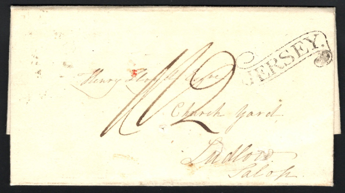 1307 CVR   image1814 Folded Letter Jersey to Ludlow, England, datelined May 4th 1814 inside, with scroll "JERSEY." (with period) despatch handstamp (used 1810-1830) and no receiver. Very fine.