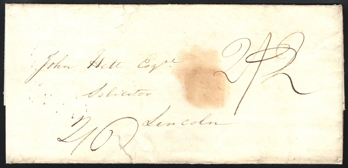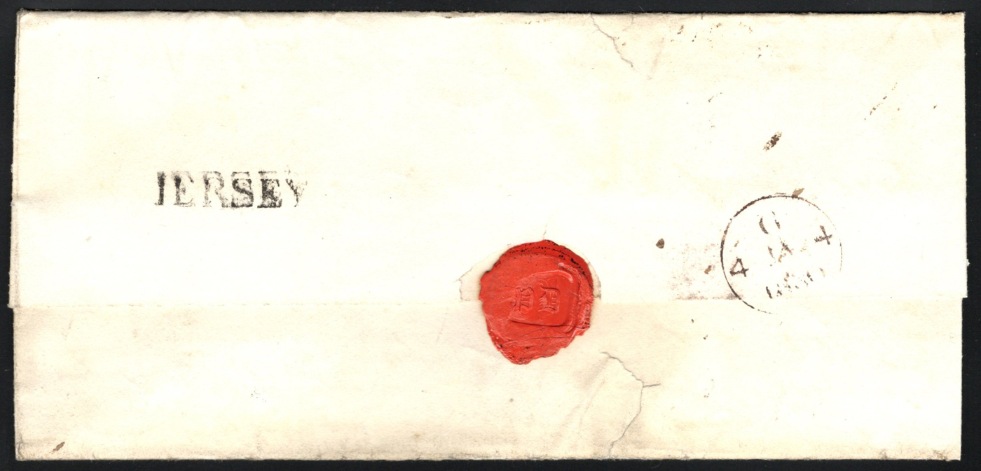1308 CVR   image1829 Folded Letter Jersey to Lincoln, England, letter inside is dated January 1829, with straight "JERSEY" despatch handstamp on back (a scarce late use, in period with broken "J") and JA 4 GPO receiver. Very fine. (Scan 1) (Scan 2) (All Scans)