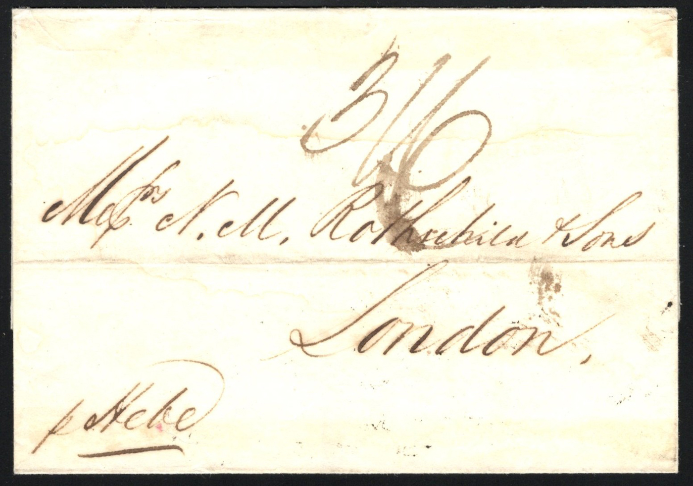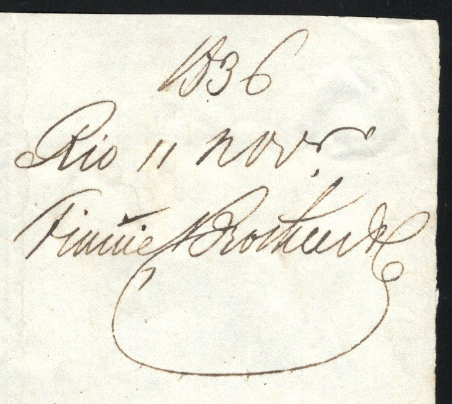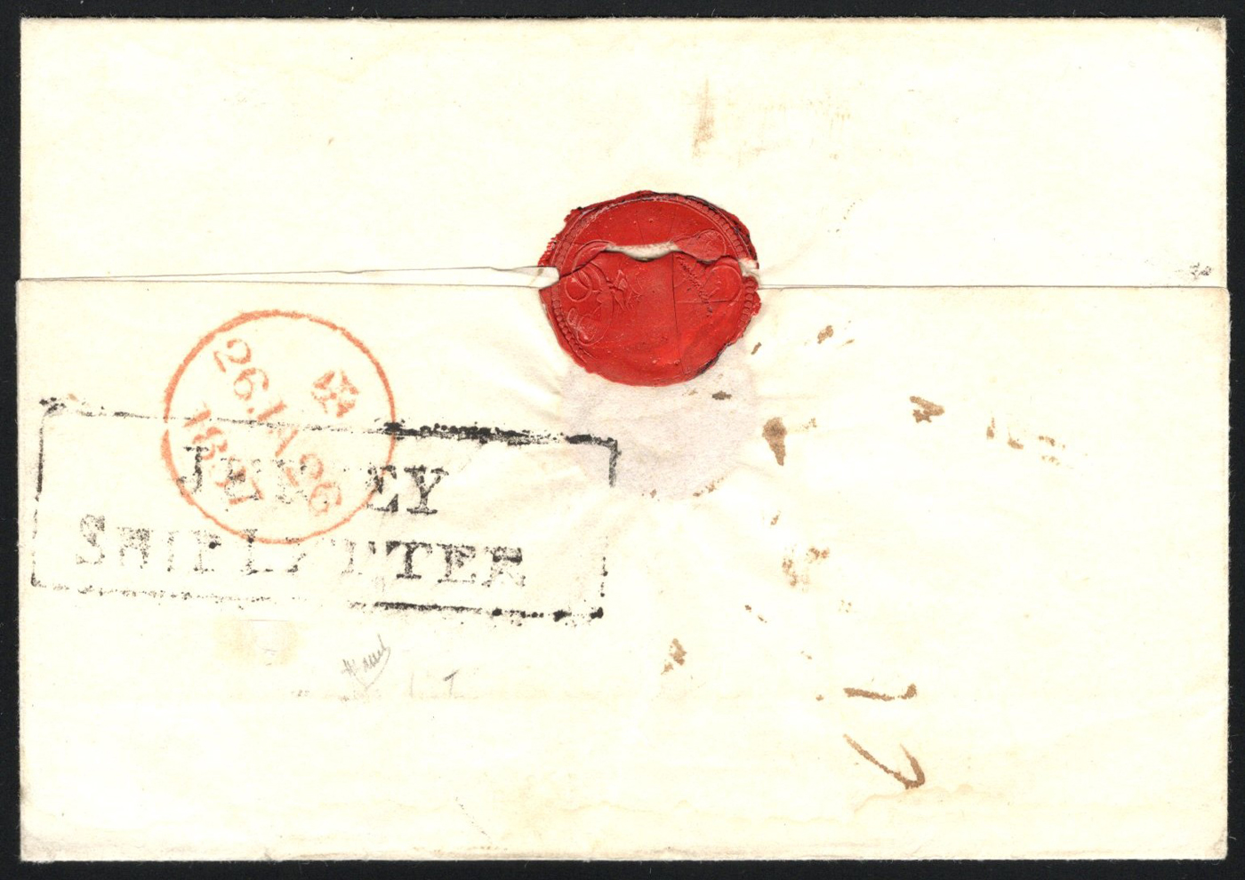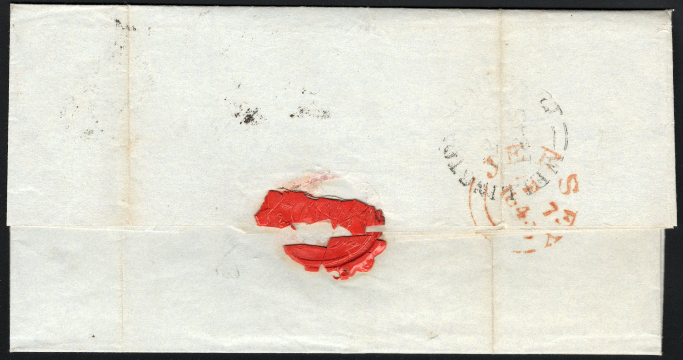 1309 CVR   image1837 Folded Cover from Rio de Janeiro, Entered the Mail in Jersey, Onwards to London, England, no letter inside, but docketing reading "1836 / Rio 11 Nov / signature", with boxed "JERSEY / SHIP LETTER" in black on front, alongside a crown 26 JA 26 / 1837 circular GPO receiver in red. Addressed to Messr Rothchild & Sons in London. Very fine, and a rare ship letter handstamp (this was not popular in the Channel Islands, listed at £650 in Collect British Postmarks). (Scan 1) (Scan 2) (Scan 3) (All Scans)