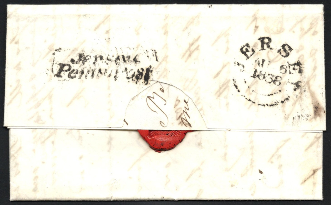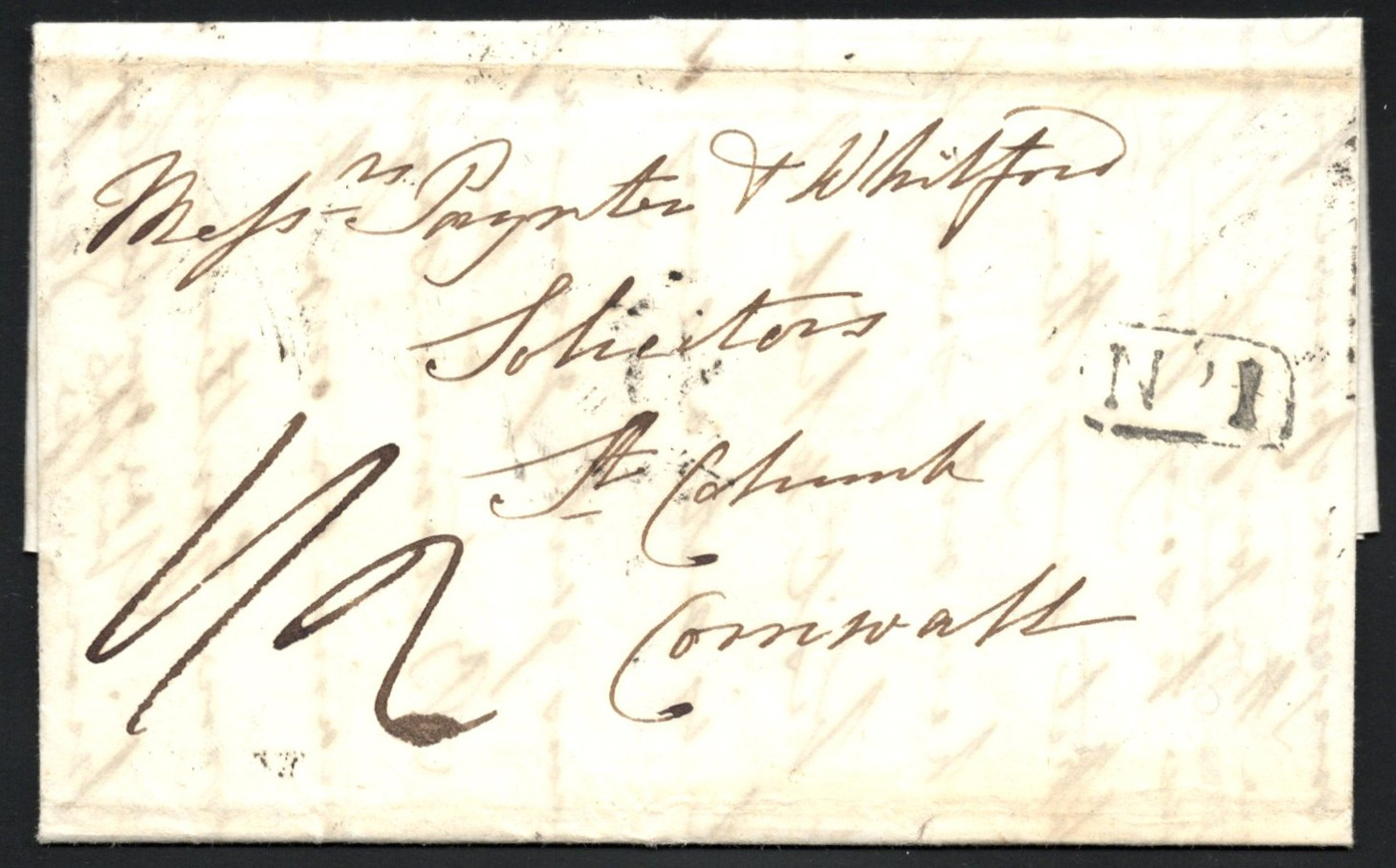 1310 CVR   image1838 Folded Letter Jersey to Cornwall, England, lengthy letter inside is datelined "St Aubins, August 6, 1838", with AU 6 / 1838 double-arc "JERSEY" despatch handstamp on back, next to a rare boxed "Jersey / Penny Post" boxed handstamp, and "No 1" local boxed handstamp receiver of St Aubins on front. Very fine. (Scan 1) (Scan 2) (Scan 3) (All Scans)
