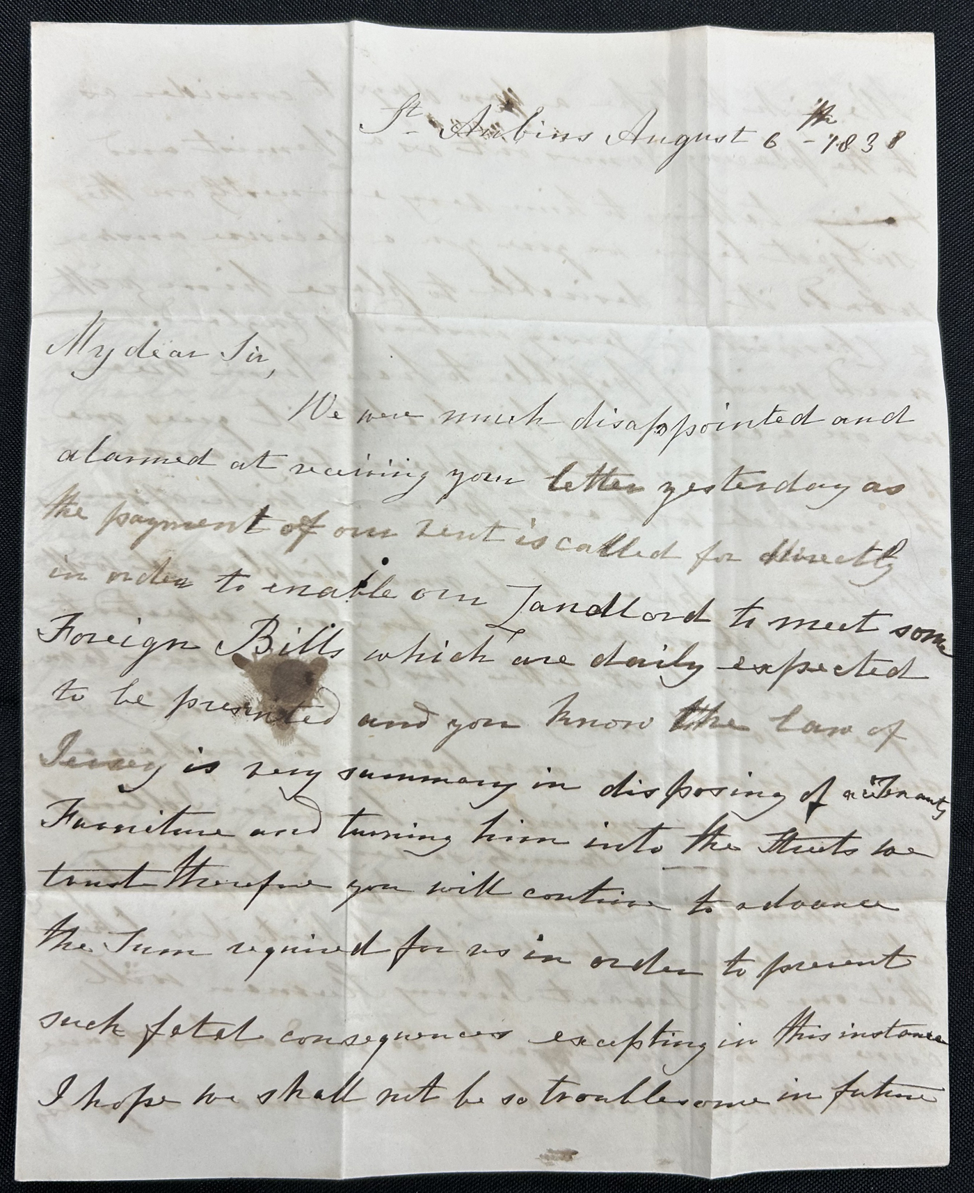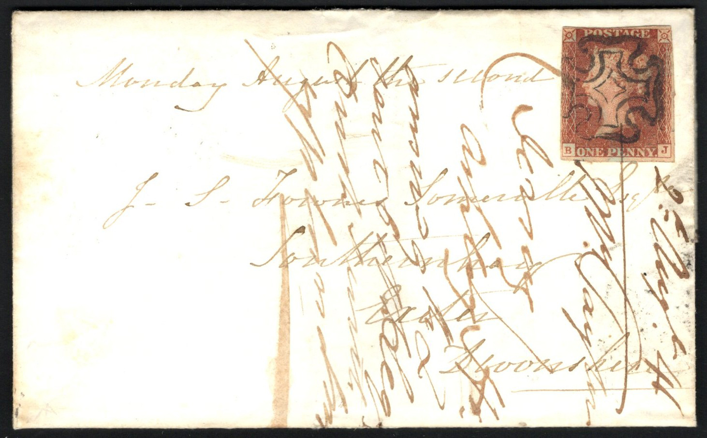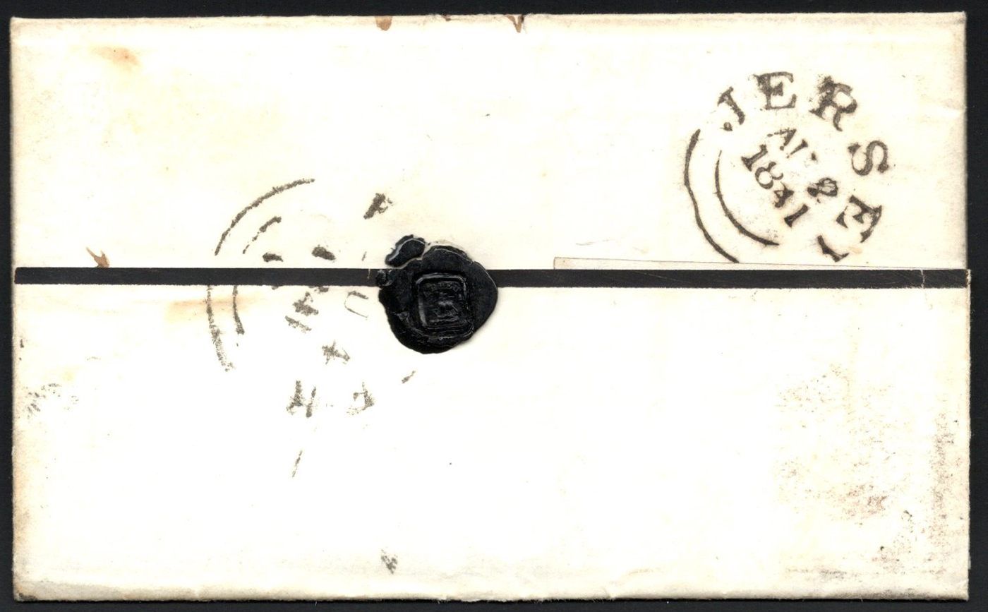 1311 CVR   image1841 Penny Red Folded Letter Jersey to Exeter, England, a three page mourning folded letter mailed with "JERSEY" AU 2 / 1841 double arc datestamp on back, franked with an imperforate Penny Red, cancelled (not tied) by a distinct black Maltese Cross. Part Exeter double arc receiver on back, very fine. (Scan 1) (Scan 2) (Scan 3) (All Scans)