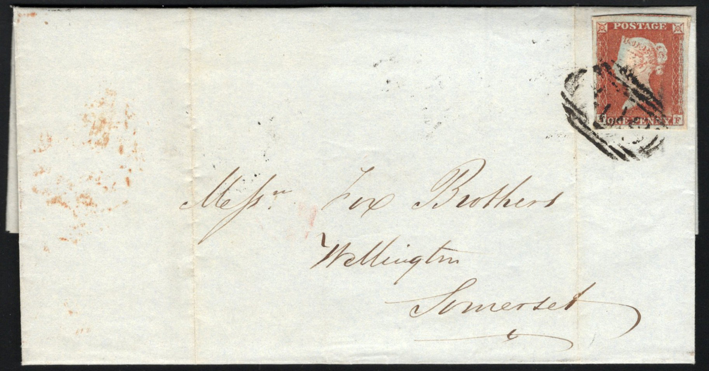 1312 CVR   image1845 Penny Red Folded Letter Jersey to Wellington, England, letter inside is datelined "Jersey April 7 1845", mailed with a red "JERSEY" AP 7 / 1845 double arc datestamp on back, franked with a large margined imperforate Penny Red (Plate 46, position FF, with "mark above second F" constant plate variety), tied by a #409 in oval grid cancel, with part Wellington double arc receiver on back, very fine. (Scan 1) (Scan 2) (All Scans)