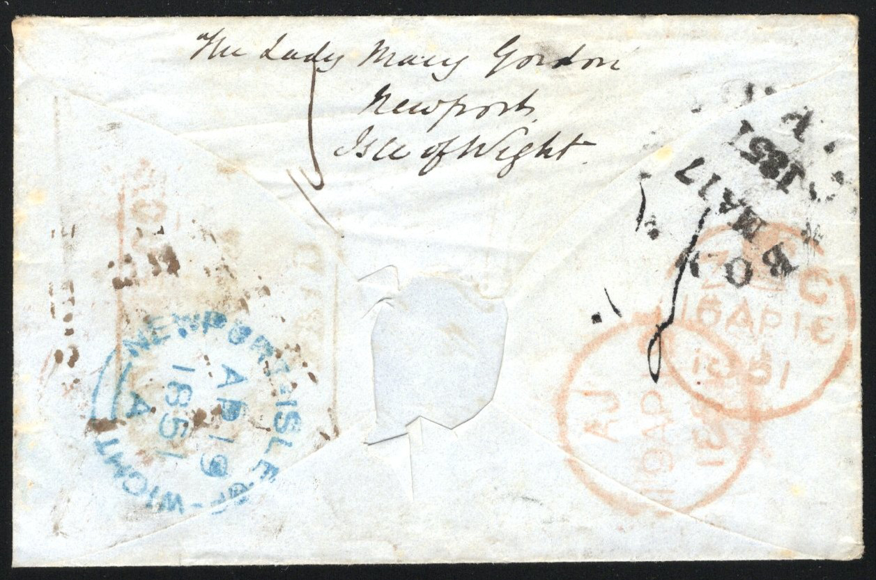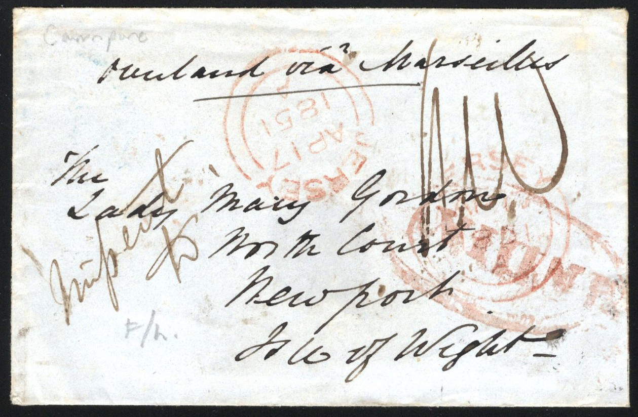 1313 CVR   image1851 Cover Mailed from India to Isle of Wight, Redirected to Jersey, an envelope with 4 page letter inside (with three-masted ship embossed logo) mailed from India (MAR.17.1851 Bombay despatch on back) to "The Lady Mary Gordon" on the Isle of Wight (APR.19.1851 Newport Isle of Wight receiver in blue) endorsed "overland via Marseilles". The letter is marked "mifsent to" and was redirected to Jersey and has a APR.17.1851 double arc receiver in red. Back also has two London GPO datestamps in red (APR.16 and APR.19). Lady Gordon, a.k.a. "Mrs Disney Leith" or "Mary Charlotte Julia Leith", was a British novelist who often traveled to Iceland and translated Icelandic novels (see Wikipedia). Very fine, unusual and a well travelled little cover. (Scan 1) (Scan 2) (Scan 3) (All Scans)
