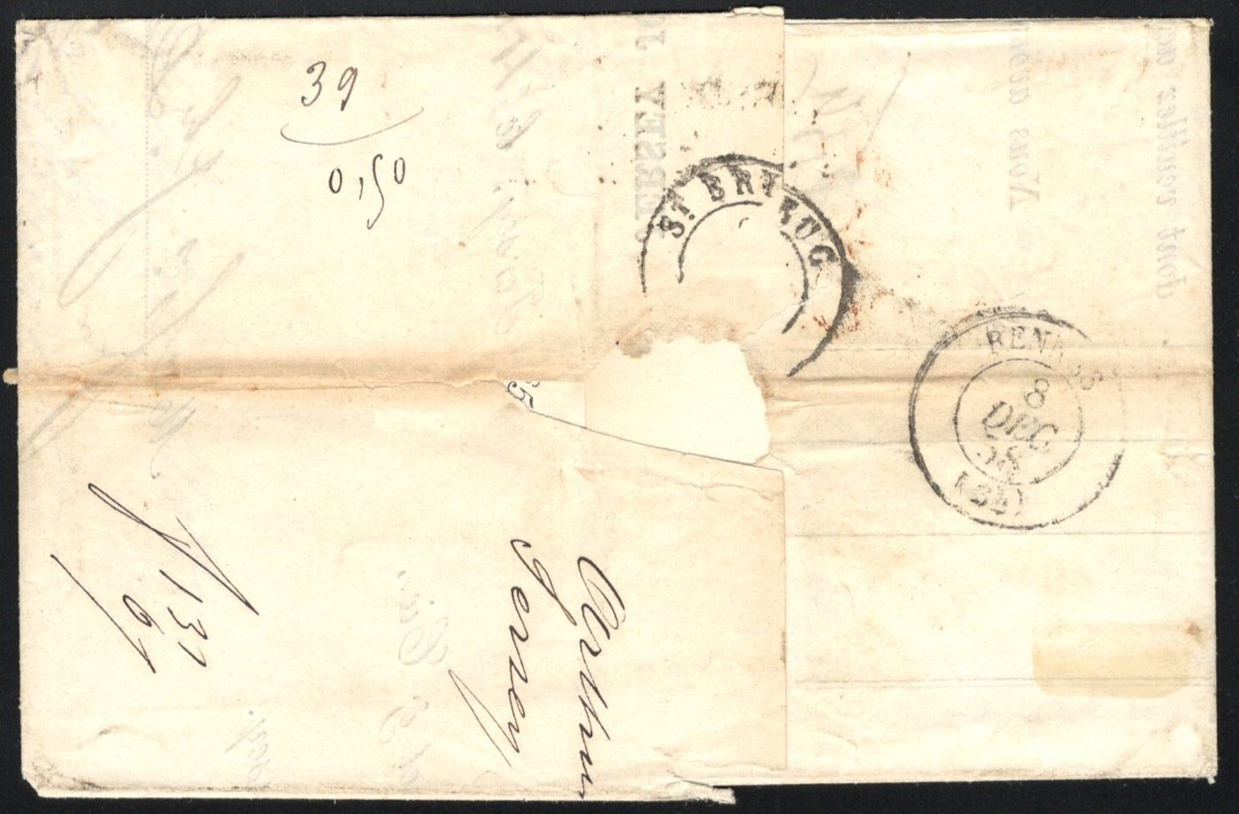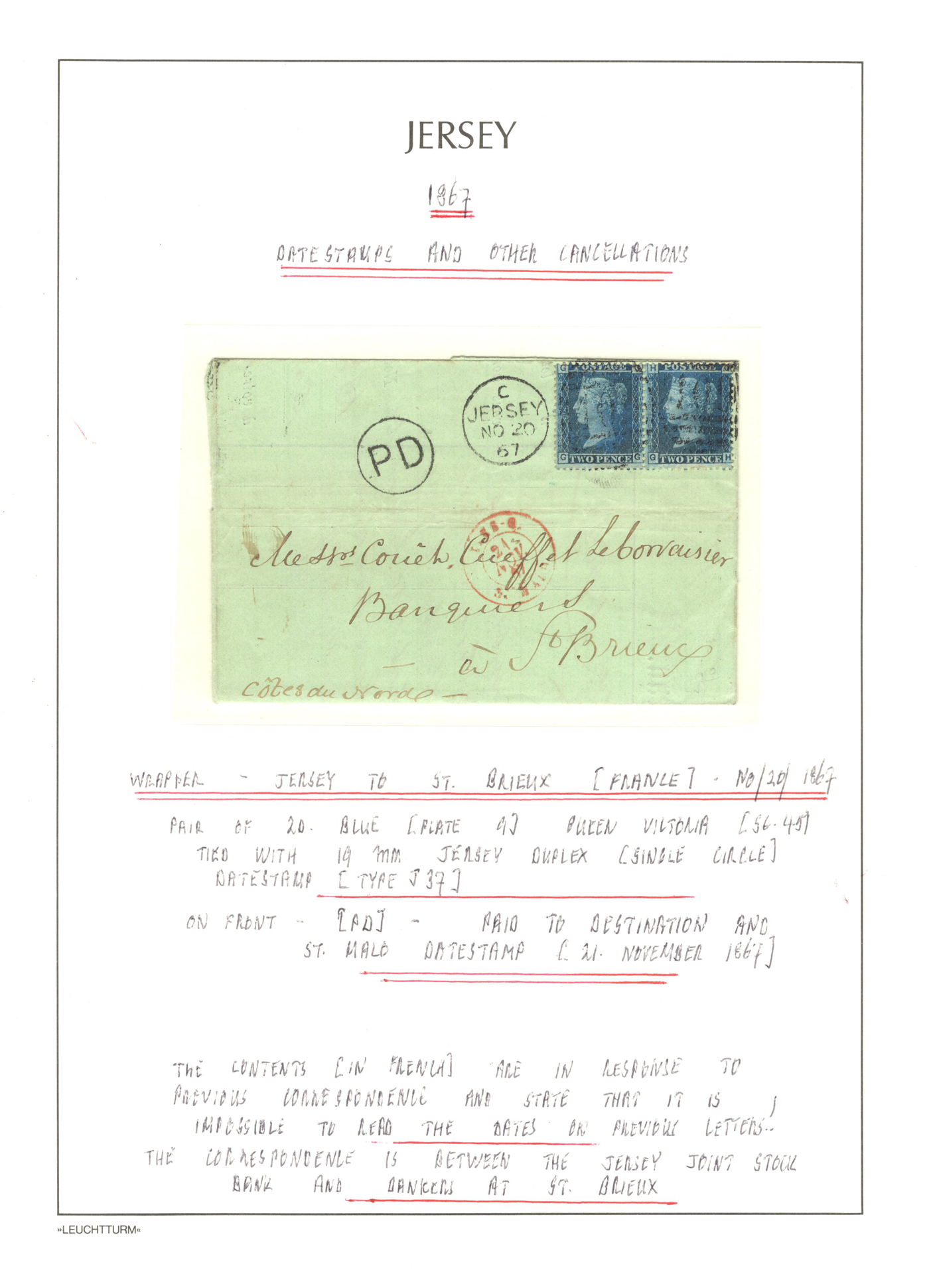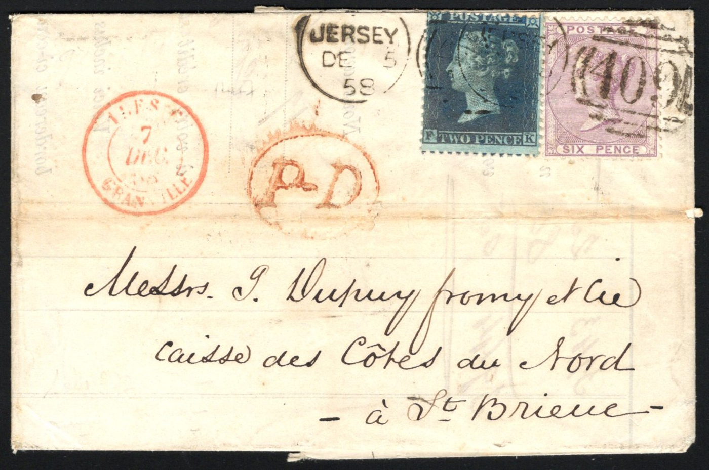 1314 CVR   image1858 8d Banking Receipt Mailed Jersey to France, a receipt from the Jersey Joint Stock Bank mailed on DEC.5.1858 (Jersey 409 duplex) to St Brieuc (France, just south west from Jersey) with part receiver on back. The receipt is franked with a fine 6d (Scott 27) and 2d (plate 5) Queen Victoria issues, both tied by the duplex, and there is circled "PD" (paid to destination handstamp and a red DEC.7 Granville French entry transit datestamp on front, and a DEC.8 Rennes transit on back (unusual, as Rennes is much further inland going south). A fine and scarce item. (Scan 1) (Scan 2) (Scan 3) (All Scans)