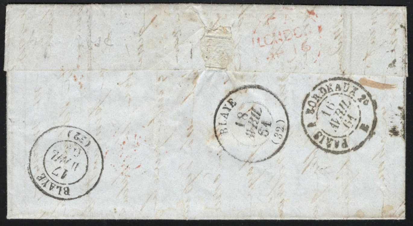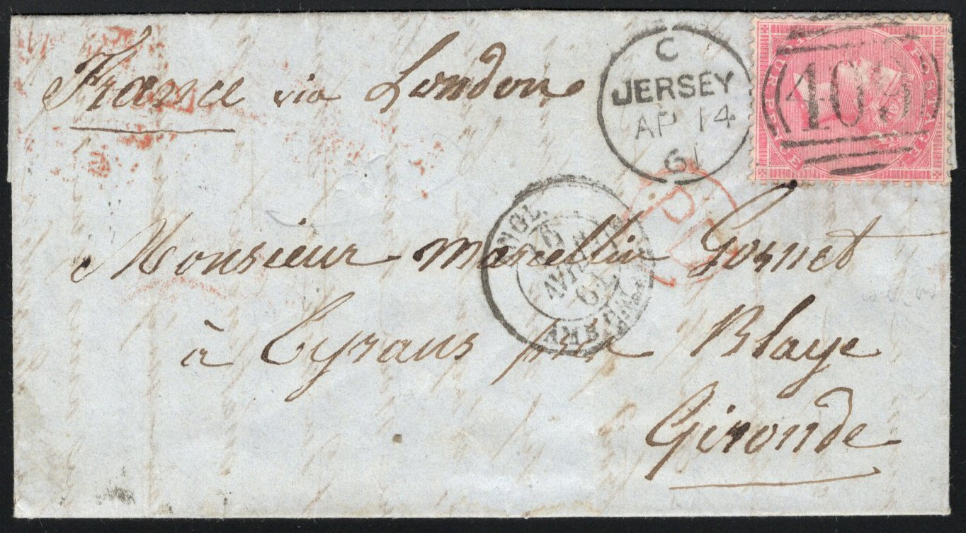 1315 CVR   image1861 4d Folded Letter Jersey to Blaye, France, a three-page folded letter (in French) datelined "Jersey le 13 avril 1861" mailed APR.14.1861 (Jersey 409 duplex) to Blaye (APR.17 and APR.18 receivers on back), endorsed "France via London" with a light APR.16 London transit on back (in red), with APR.16 entry transit and APR.16 Paris à Bordeaux railway transit. The letter is franked with a fine 4d Queen Victoria (Scott 26, S.G. 66), Very fine and scarce. (Scan 1) (Scan 2) (All Scans)