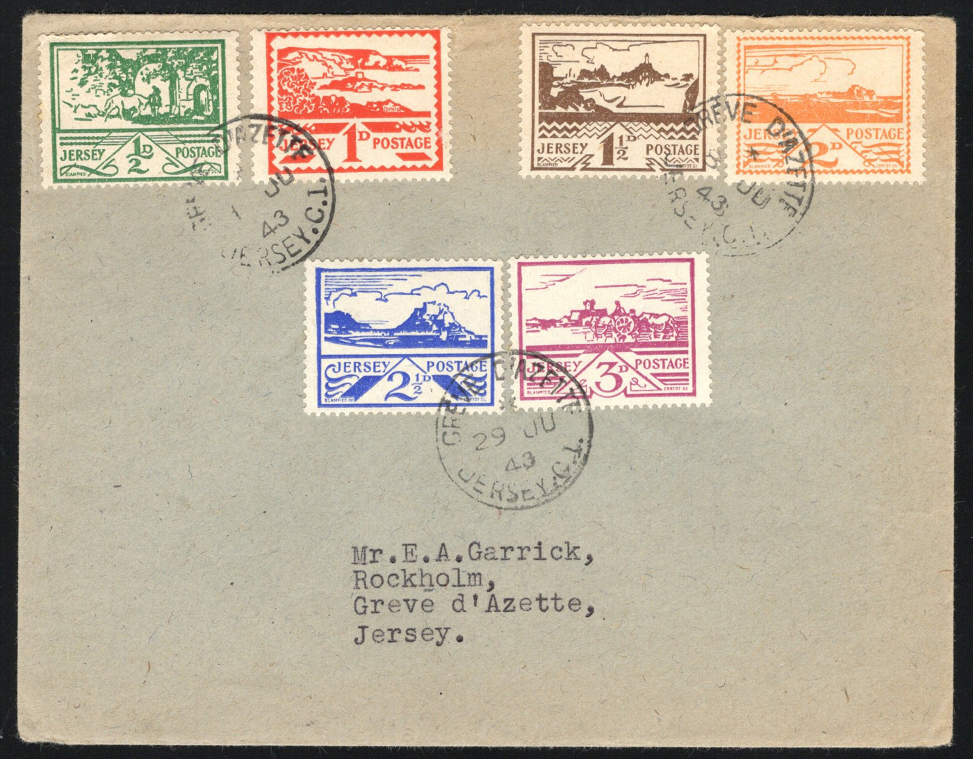 1317 CVR   image1943 ½d to 3d Jersey Scenes on First Day Cover, with each two values postmarked with their respective proper first day of issue, with a "Greve D'Azette / Jersey C.I." circular datestamp, addressed locally, very fine.