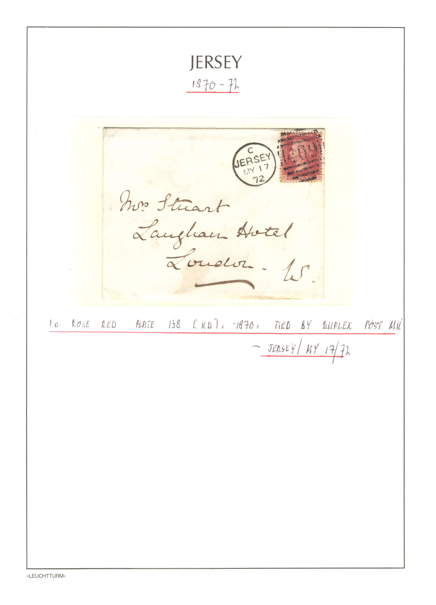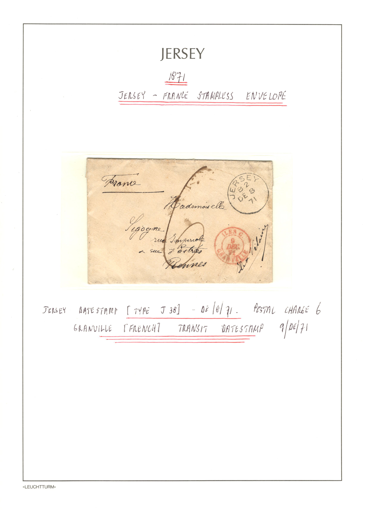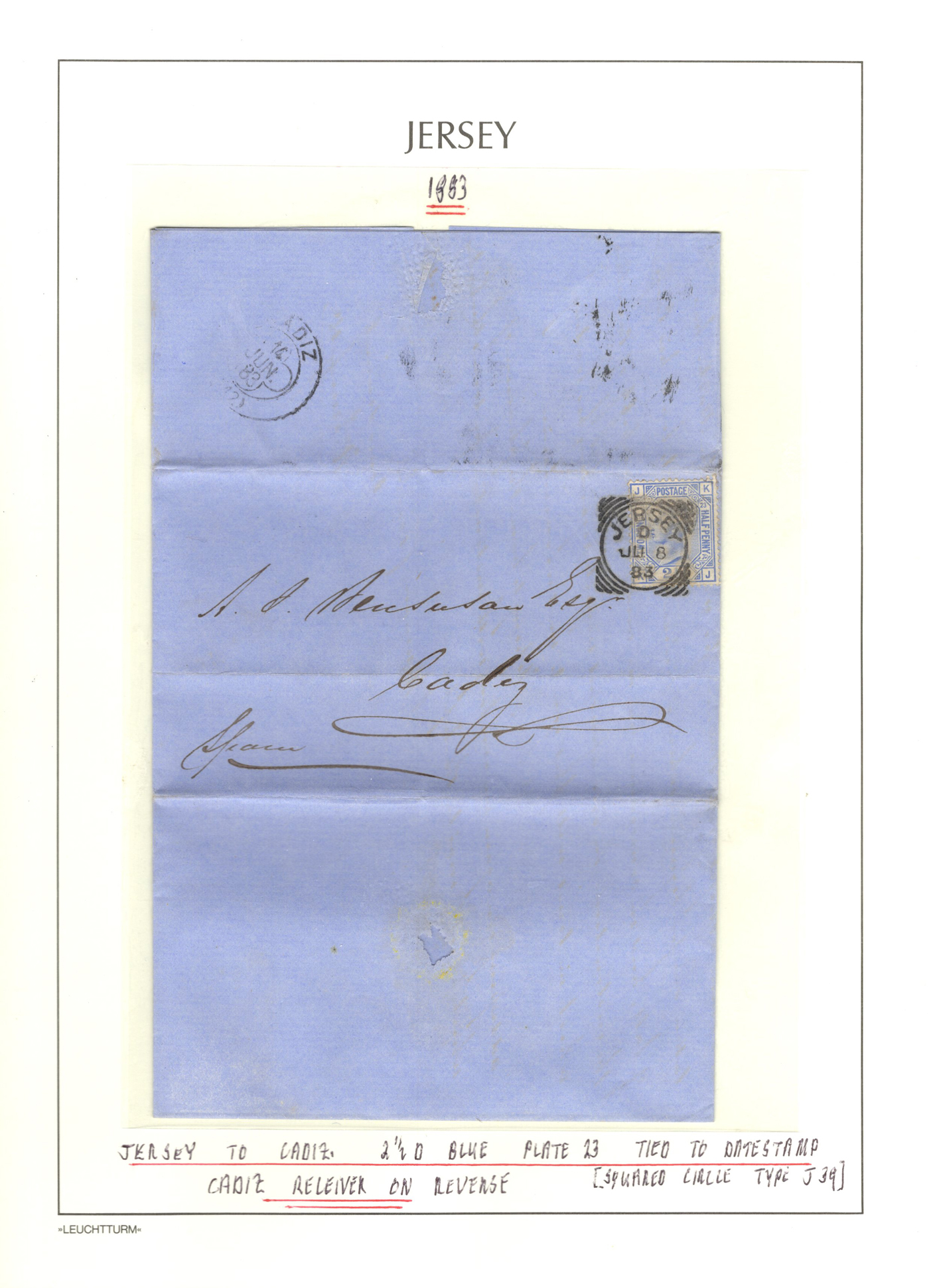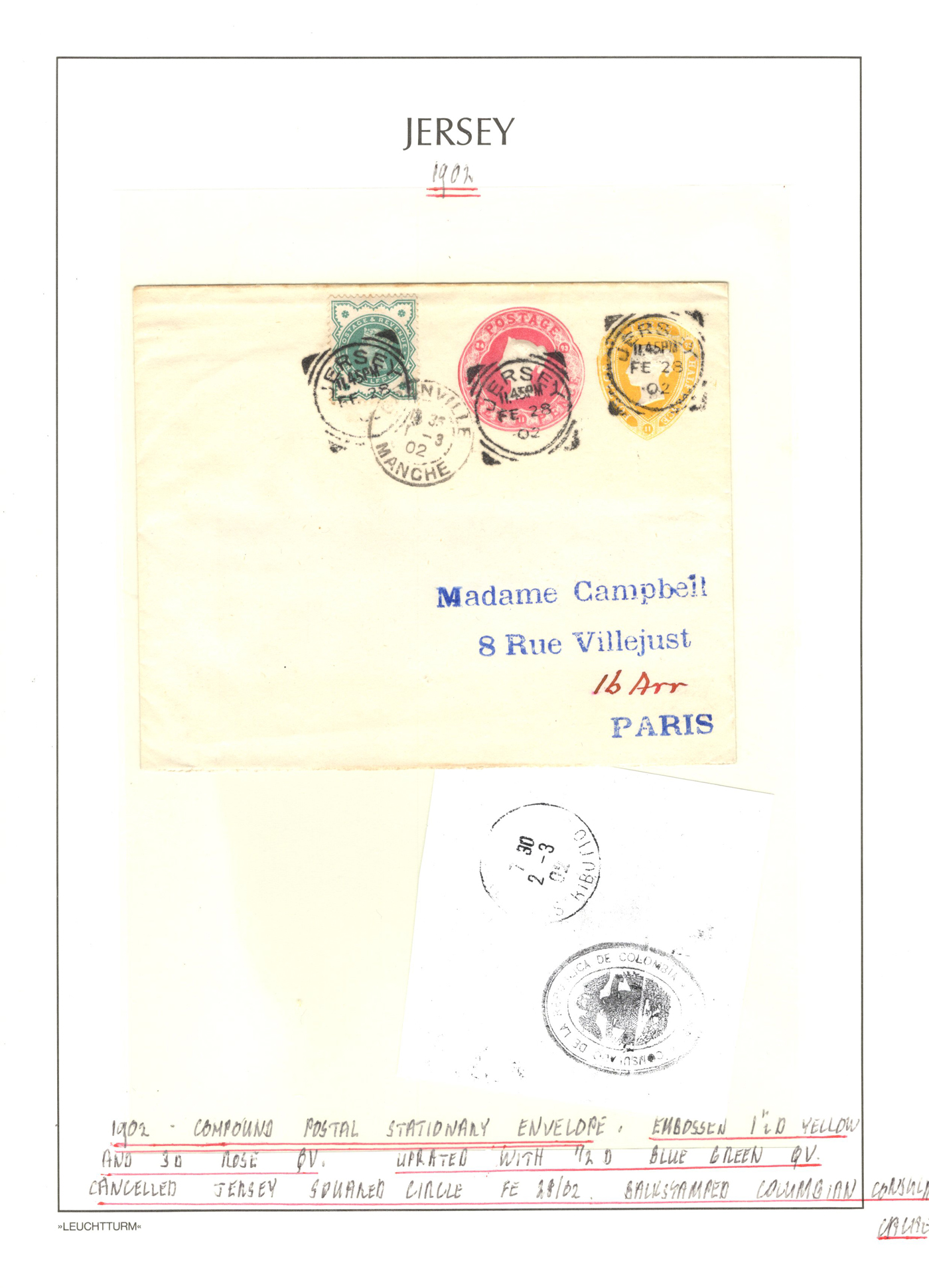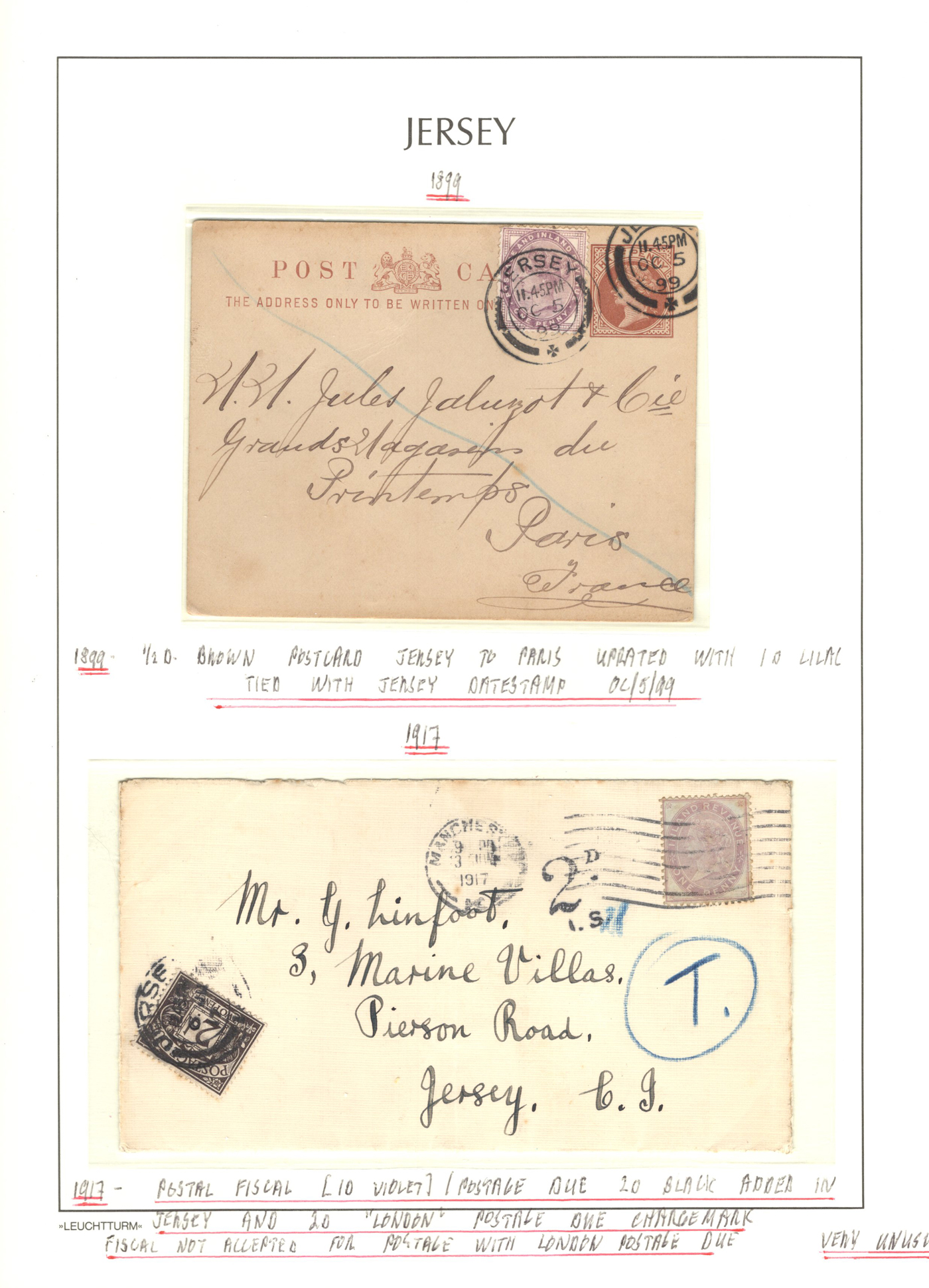 1316 CVR/PC   imageGroup of 13 Early Jersey Covers / Cards, 1867-1917, with 1867 folded cover to France (409 duplex ties pair of 2d blues), 1871 stampless cover to France, 1872 cover to London (duplex 409 ties Penny Red), 1883 folded letter to Cadiz, Spain (squared circle ties 2½d blue), 1888 UPU stationery card to Switzerland (squared circle), 1894 registered letter to France (409 grid cancel ties a 1½d stamp to stationery envelope), 1899 folded letter to Cadiz, Spain (squared circle ties 2½d blue), 1899 uprated stationery card to France (MC circular datestamp ties stamp), 1899 uprated registered stationery cover to Germany (409 grid cancels tie a 3d yellow stamp to a 3½d yellow envelope), 1899 uprated stationery cover to France (MC datestamps tie 1d purple stamp), 1901 picture postcard to France (lovely Jersey illustration, with Grand Hotel cachet), 1902 uprated stationery envelope to France (a 3½d yellow + 3d compound franking envelope uprated with a ½d, all tied by squared circle cancels, with Columbia Consul backstamp) and a 1917 cover mailed from Manchester to Jersey with a 1d purple Postal Fiscal, GB 2d Postage Due tied by Jersey datestamp). All have appropriate breceivers, etc. A mostly very fine group, all written-up on album pages. (Scan 1) (Scan 2) (Scan 3) (Scan 4) (Scan 5) (Scan 6) (Scan 7) (Scan 8) (Scan 9) (Scan 10) (Scan 11) (Scan 12) (All Scans)