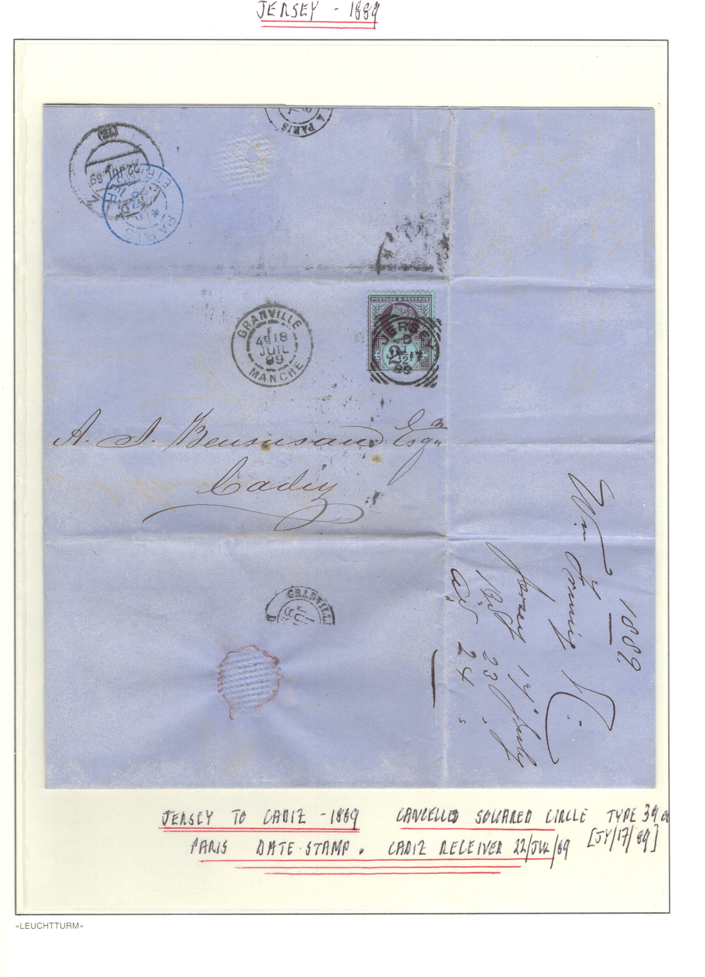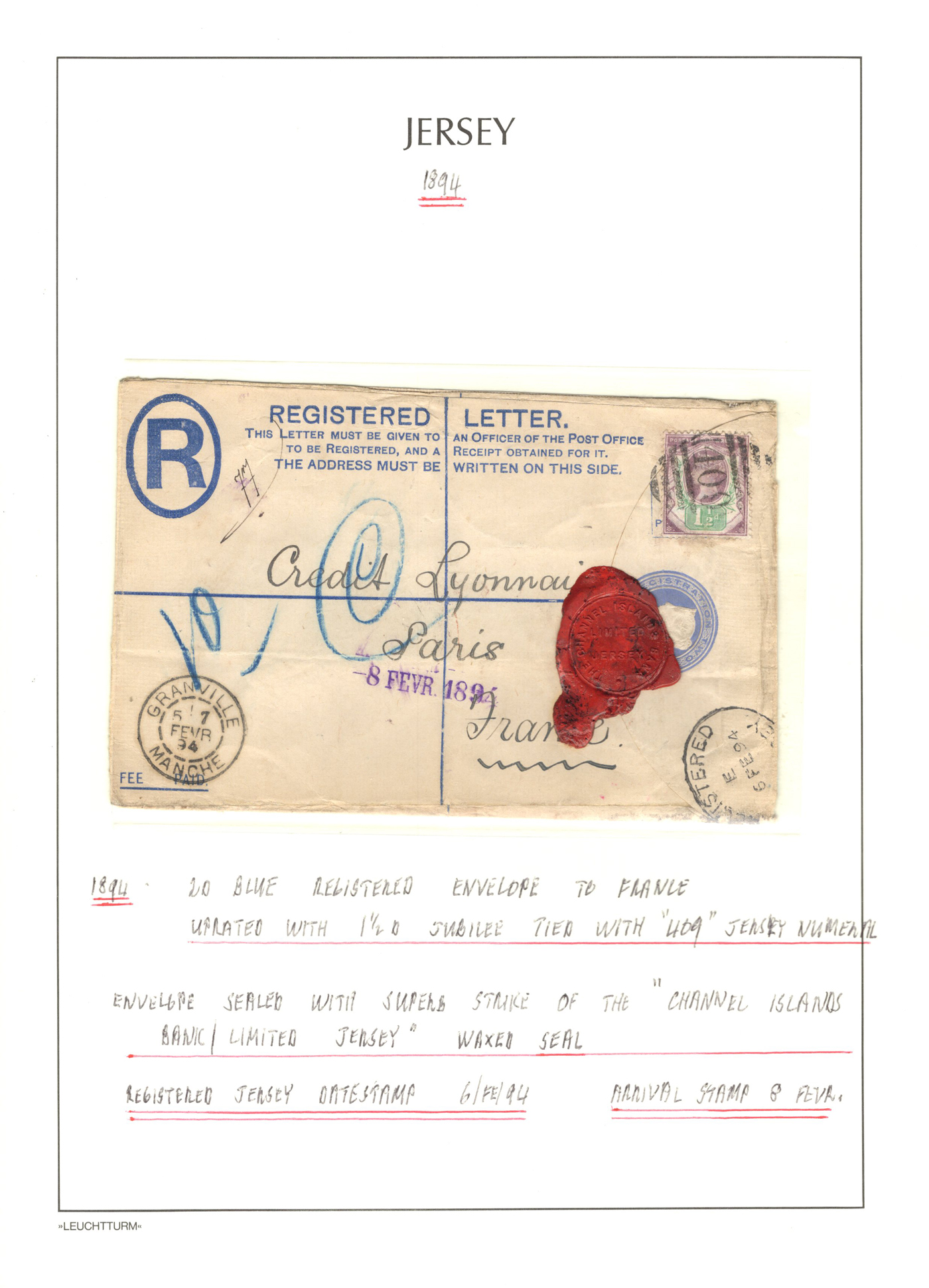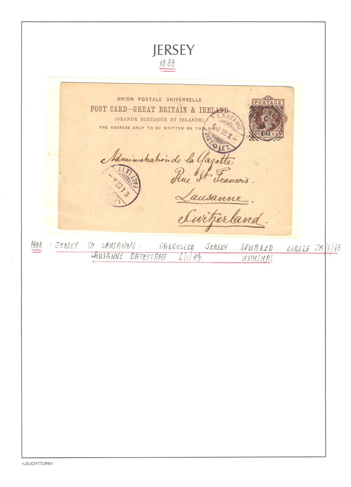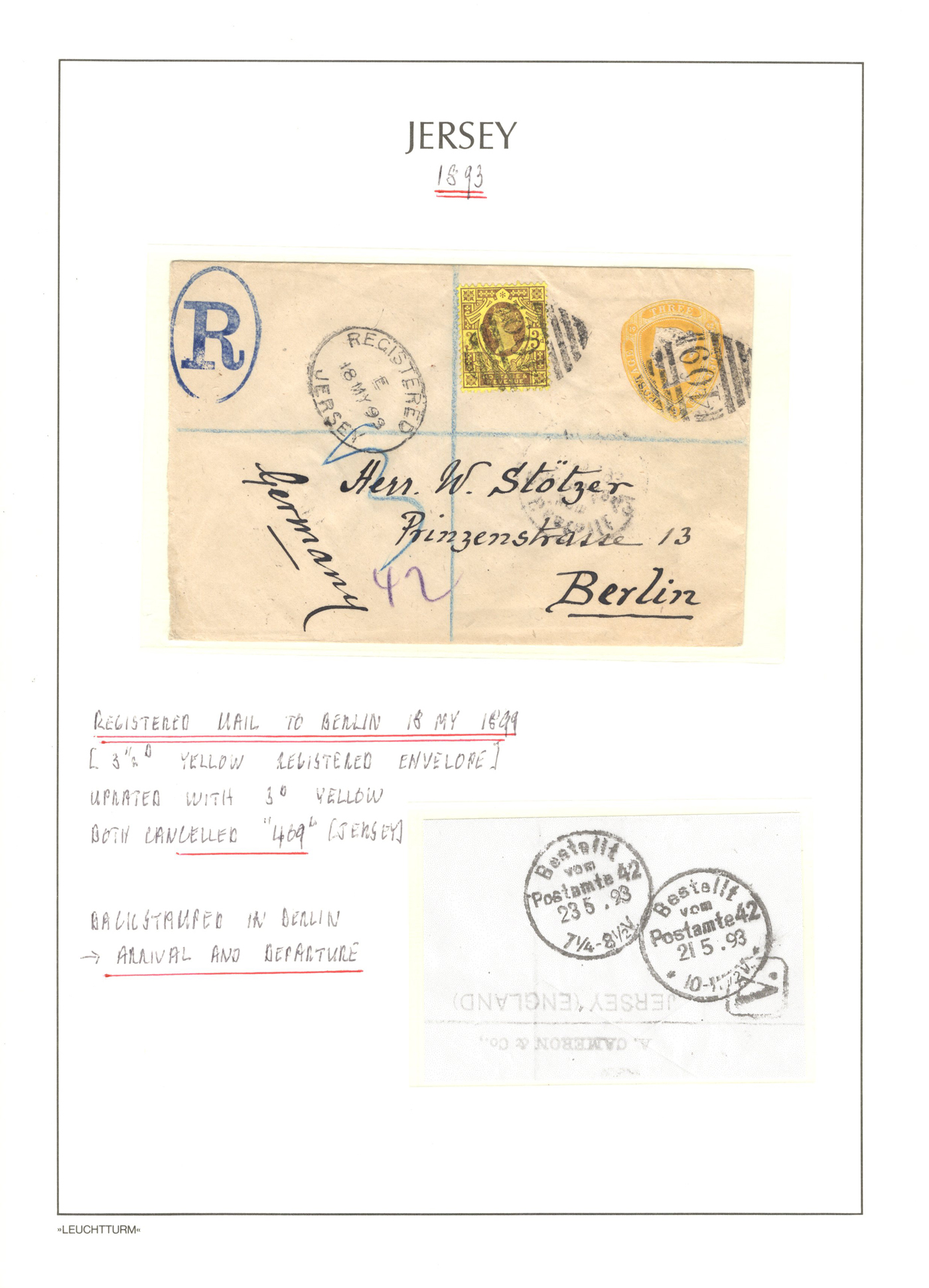 1316 CVR/PC   imageGroup of 13 Early Jersey Covers / Cards, 1867-1917, with 1867 folded cover to France (409 duplex ties pair of 2d blues), 1871 stampless cover to France, 1872 cover to London (duplex 409 ties Penny Red), 1883 folded letter to Cadiz, Spain (squared circle ties 2½d blue), 1888 UPU stationery card to Switzerland (squared circle), 1894 registered letter to France (409 grid cancel ties a 1½d stamp to stationery envelope), 1899 folded letter to Cadiz, Spain (squared circle ties 2½d blue), 1899 uprated stationery card to France (MC circular datestamp ties stamp), 1899 uprated registered stationery cover to Germany (409 grid cancels tie a 3d yellow stamp to a 3½d yellow envelope), 1899 uprated stationery cover to France (MC datestamps tie 1d purple stamp), 1901 picture postcard to France (lovely Jersey illustration, with Grand Hotel cachet), 1902 uprated stationery envelope to France (a 3½d yellow + 3d compound franking envelope uprated with a ½d, all tied by squared circle cancels, with Columbia Consul backstamp) and a 1917 cover mailed from Manchester to Jersey with a 1d purple Postal Fiscal, GB 2d Postage Due tied by Jersey datestamp). All have appropriate breceivers, etc. A mostly very fine group, all written-up on album pages. (Scan 1) (Scan 2) (Scan 3) (Scan 4) (Scan 5) (Scan 6) (Scan 7) (Scan 8) (Scan 9) (Scan 10) (Scan 11) (Scan 12) (All Scans)