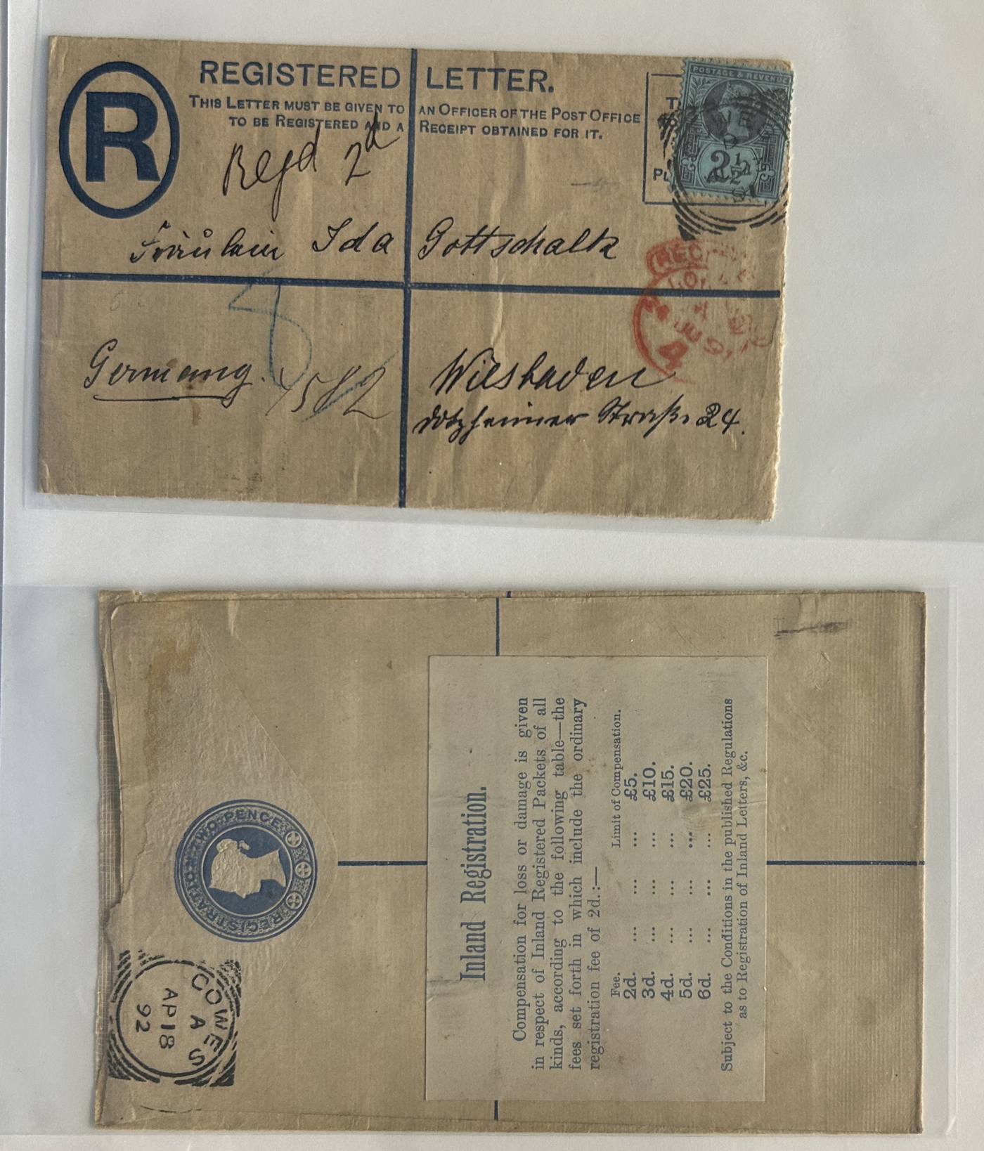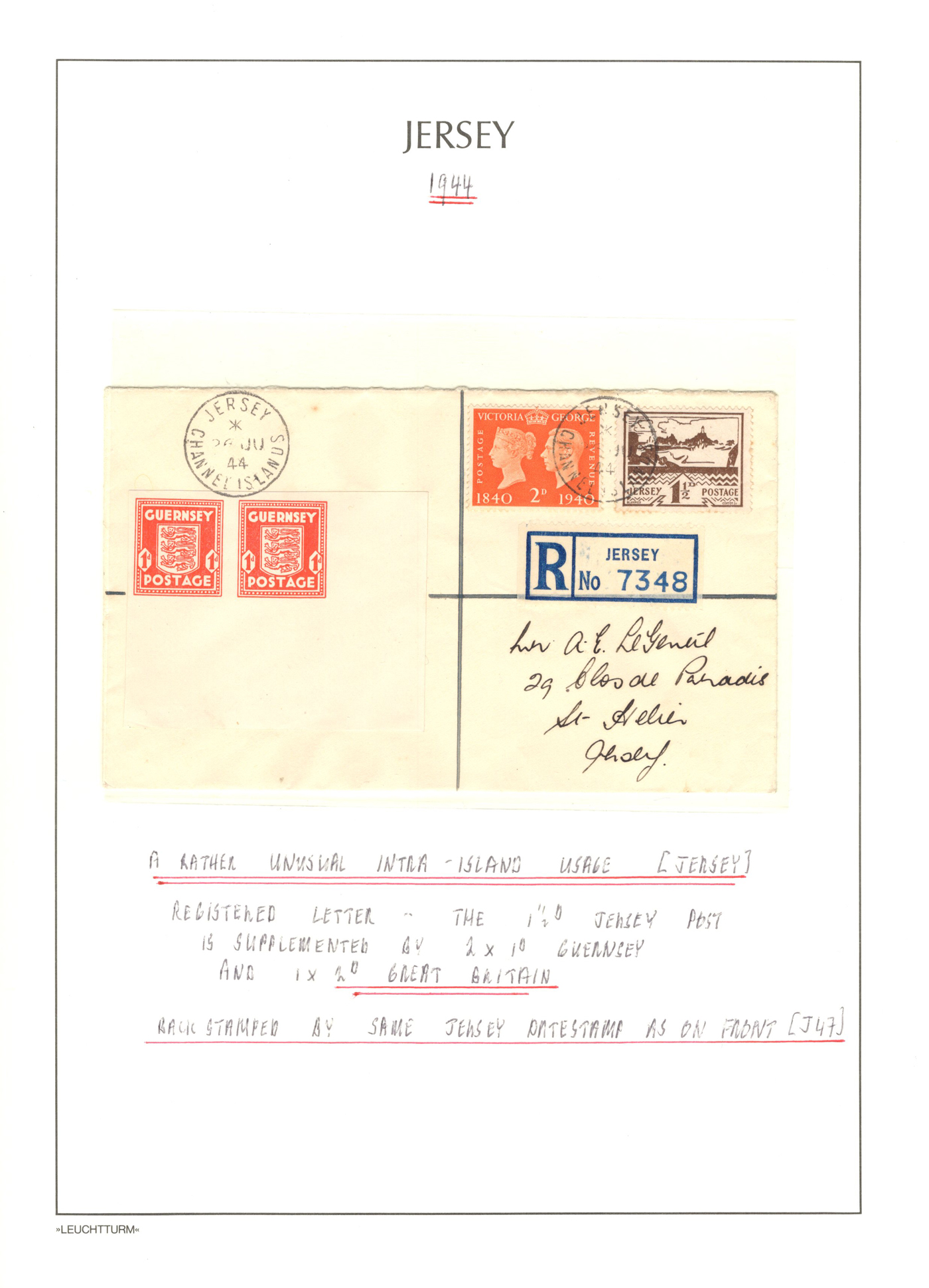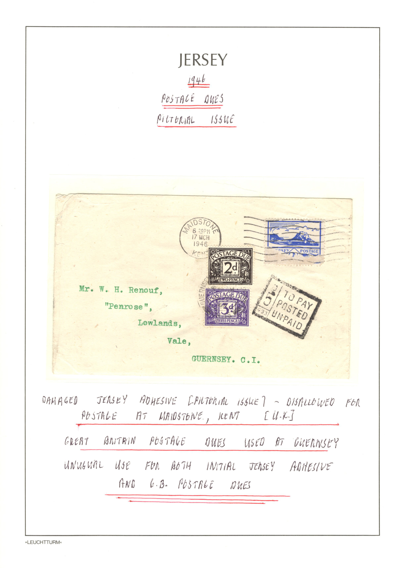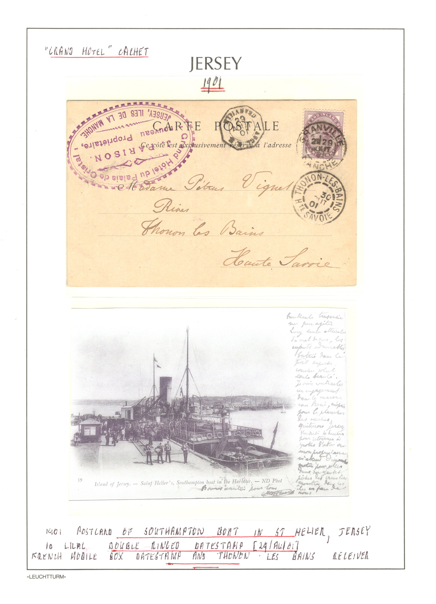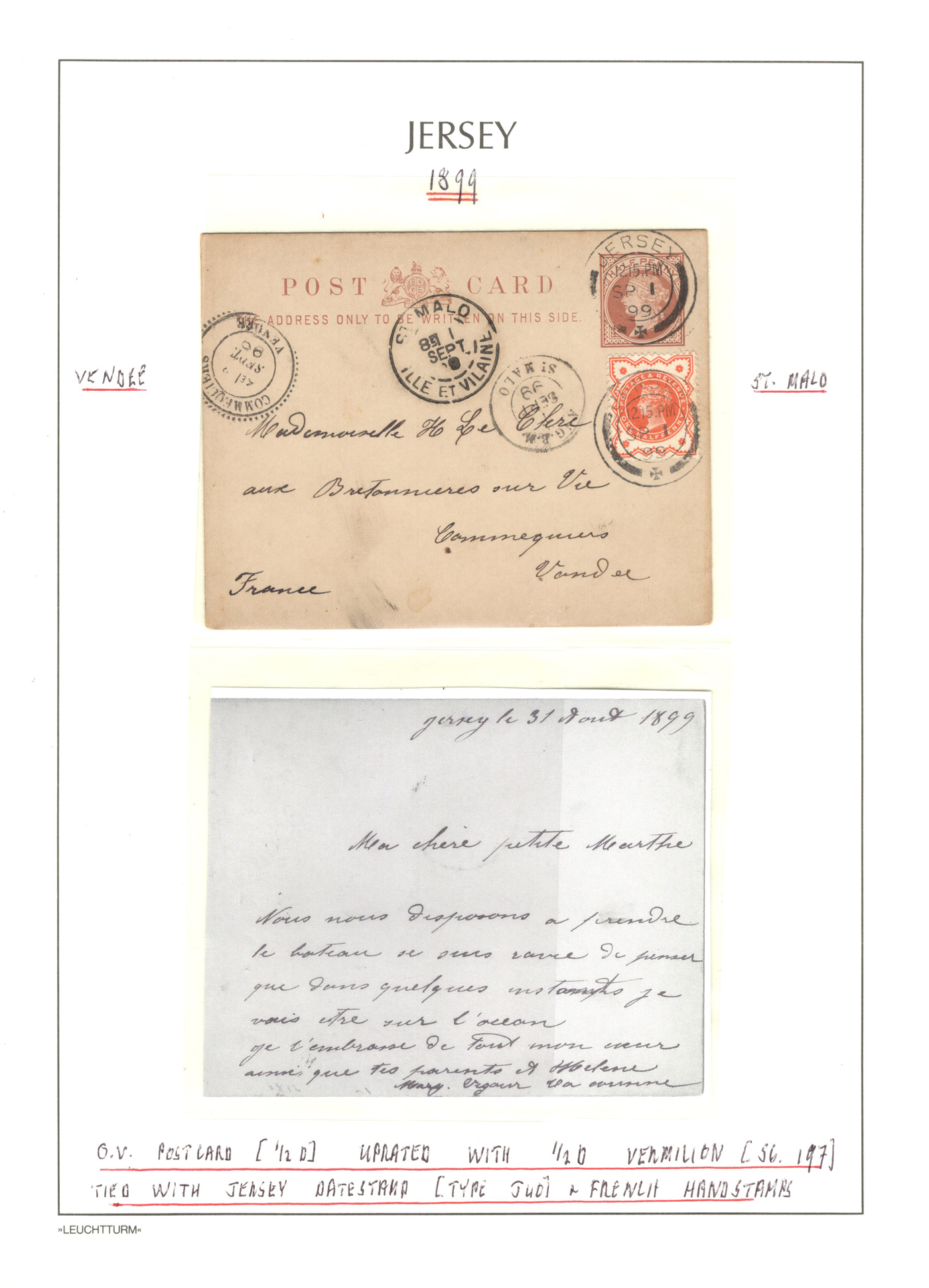 1316 CVR/PC   imageGroup of 13 Early Jersey Covers / Cards, 1867-1917, with 1867 folded cover to France (409 duplex ties pair of 2d blues), 1871 stampless cover to France, 1872 cover to London (duplex 409 ties Penny Red), 1883 folded letter to Cadiz, Spain (squared circle ties 2½d blue), 1888 UPU stationery card to Switzerland (squared circle), 1894 registered letter to France (409 grid cancel ties a 1½d stamp to stationery envelope), 1899 folded letter to Cadiz, Spain (squared circle ties 2½d blue), 1899 uprated stationery card to France (MC circular datestamp ties stamp), 1899 uprated registered stationery cover to Germany (409 grid cancels tie a 3d yellow stamp to a 3½d yellow envelope), 1899 uprated stationery cover to France (MC datestamps tie 1d purple stamp), 1901 picture postcard to France (lovely Jersey illustration, with Grand Hotel cachet), 1902 uprated stationery envelope to France (a 3½d yellow + 3d compound franking envelope uprated with a ½d, all tied by squared circle cancels, with Columbia Consul backstamp) and a 1917 cover mailed from Manchester to Jersey with a 1d purple Postal Fiscal, GB 2d Postage Due tied by Jersey datestamp). All have appropriate breceivers, etc. A mostly very fine group, all written-up on album pages. (Scan 1) (Scan 2) (Scan 3) (Scan 4) (Scan 5) (Scan 6) (Scan 7) (Scan 8) (Scan 9) (Scan 10) (Scan 11) (Scan 12) (All Scans)