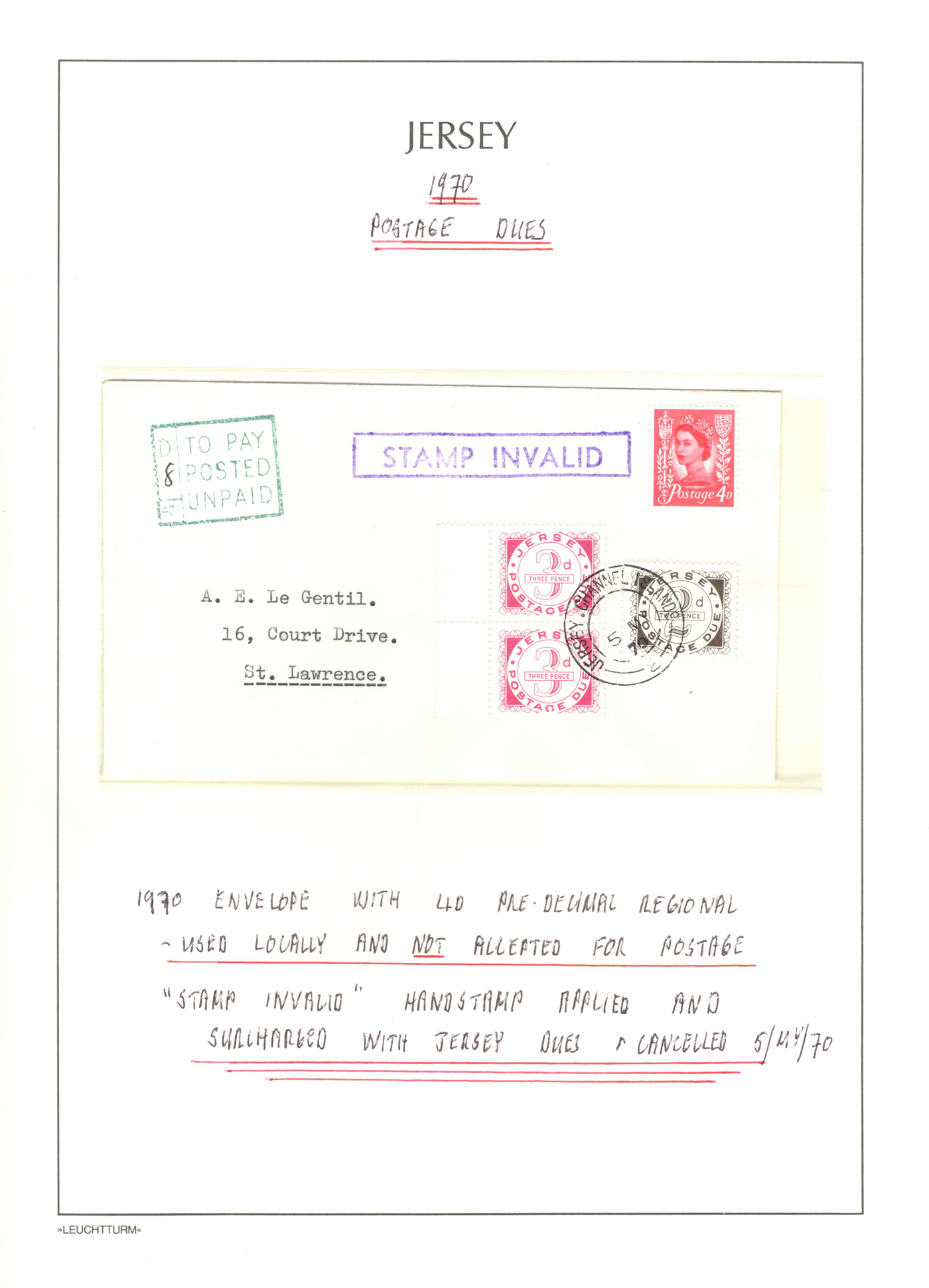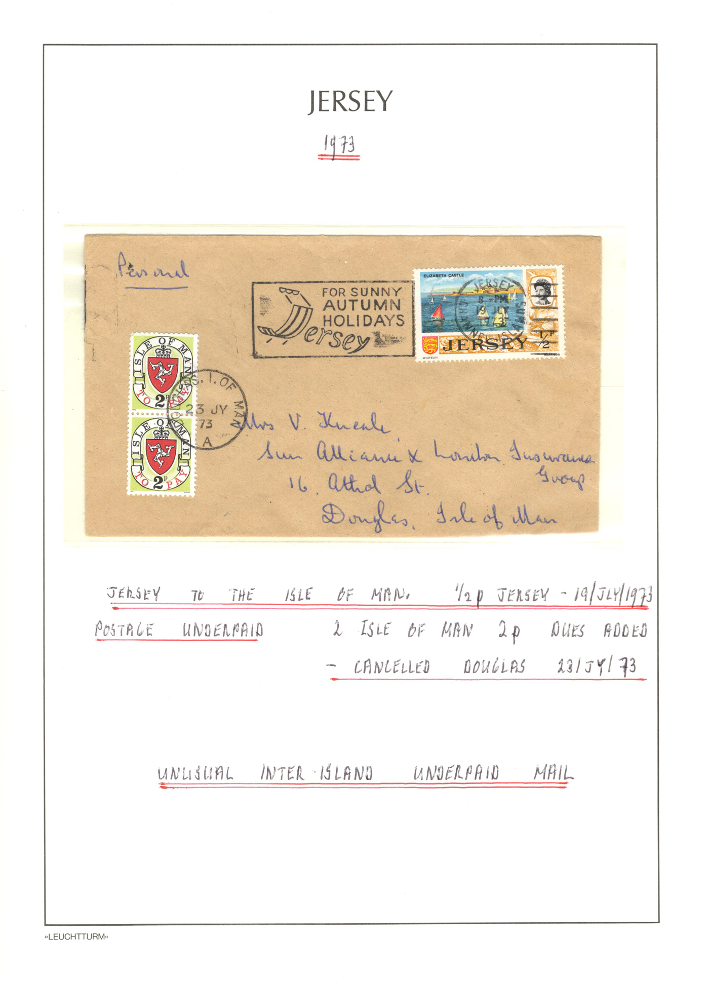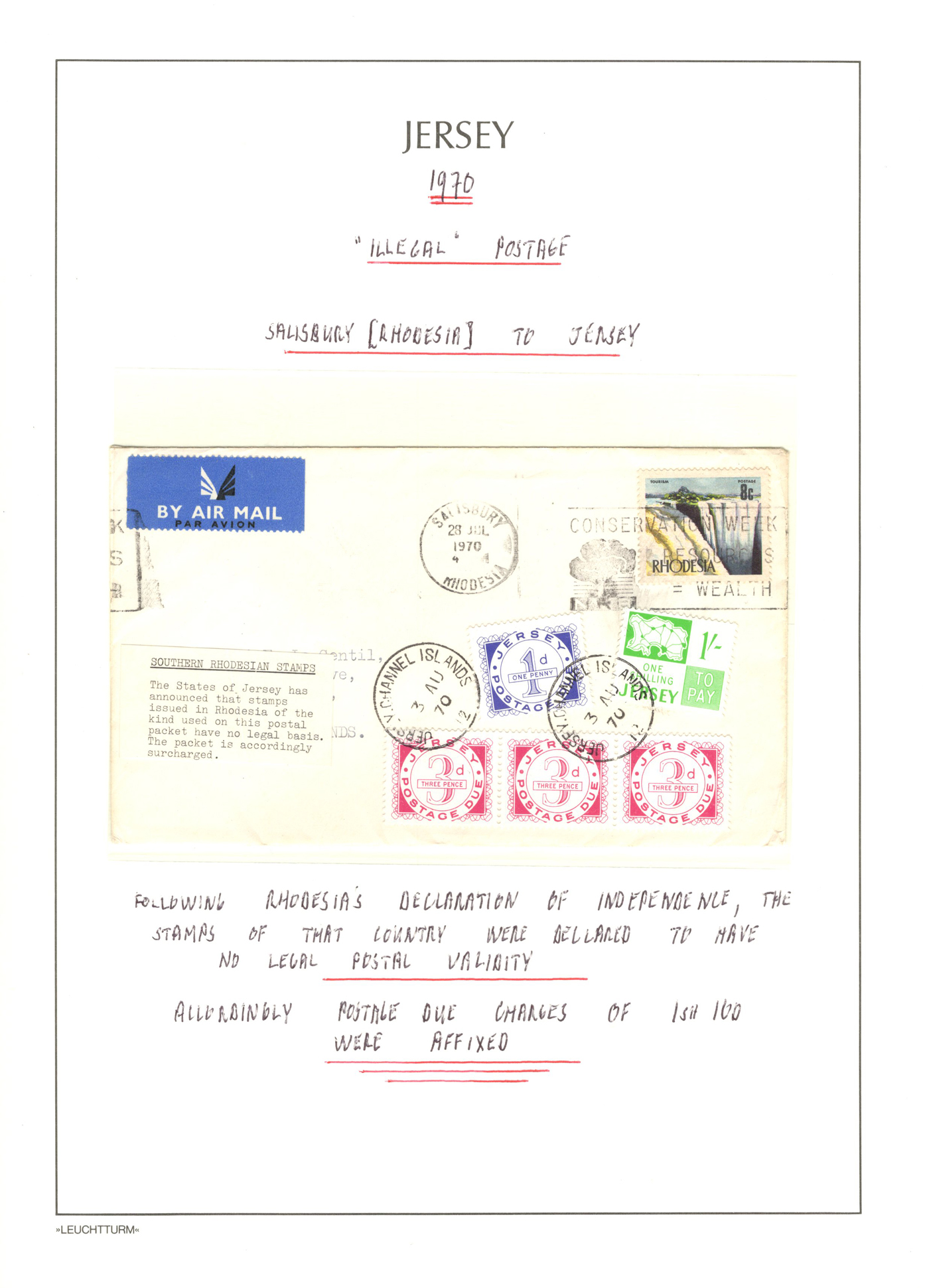 1318 CVR   imageGroup of 5 Interesting Jersey Postage Due, etc. Covers,1944-1973, 1944 intra-island registered cover franked with a trio of different issues; 1946 cover mailed to Guernsey with a 2½d Occupation issue (faulty), taxed double the deficiency with GB due stamps; 1970 local cover franked with a 4d pre-decimal Regional, refused and taxed with 8d in Jersey dues (double deficiency); 1970 cover mailed from Rhodesia during the Unilateral Declaration of Independence, stamp refused with explanatory label and taxed 1sh10d in Jersey dues; and 1973 cover to Isle of Man, franked with a ½p issue, with 4p worth of Isle of Man dues. An interesting and very fine group. (Scan 1) (Scan 2) (Scan 3) (Scan 4) (Scan 5) (All Scans)