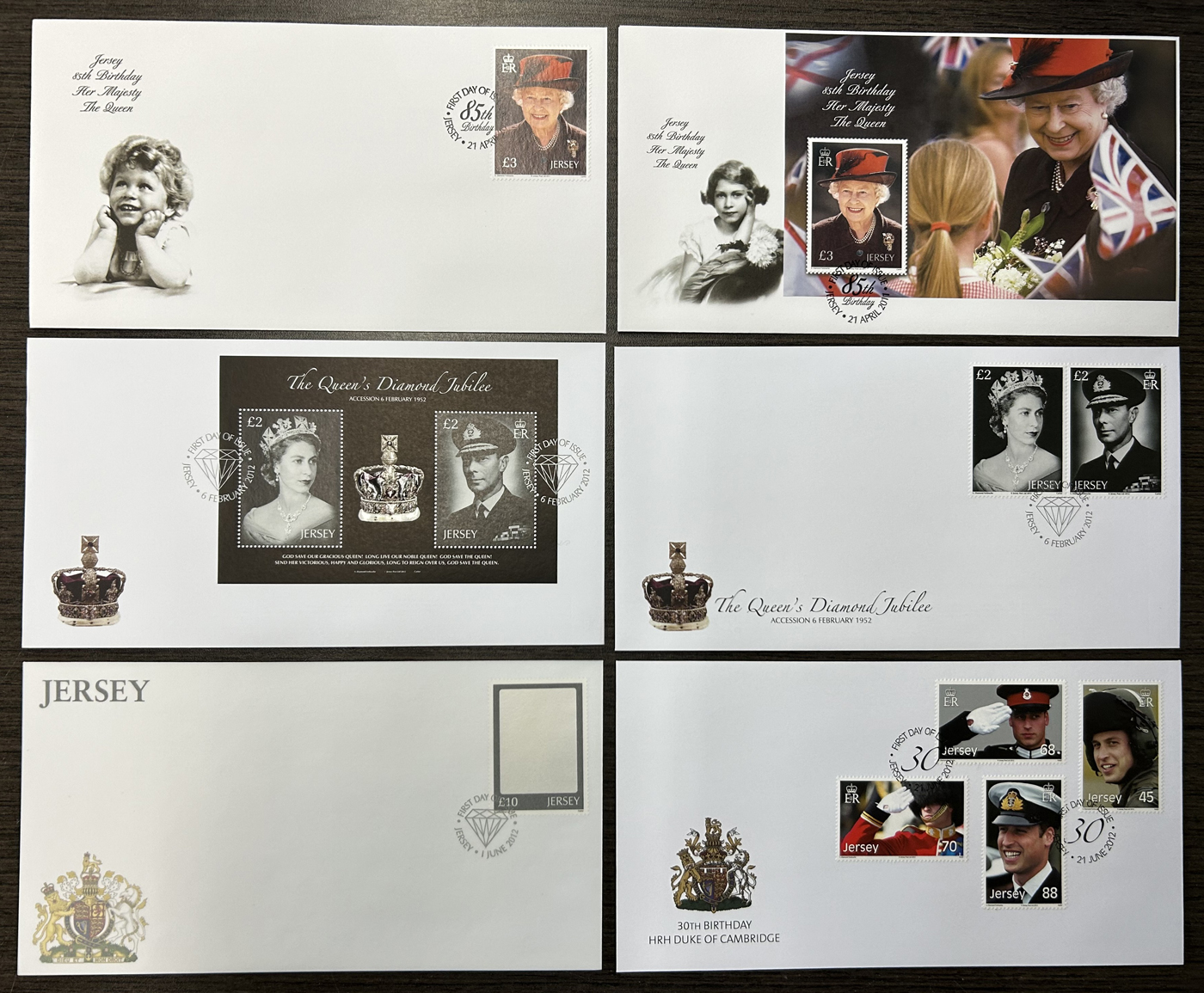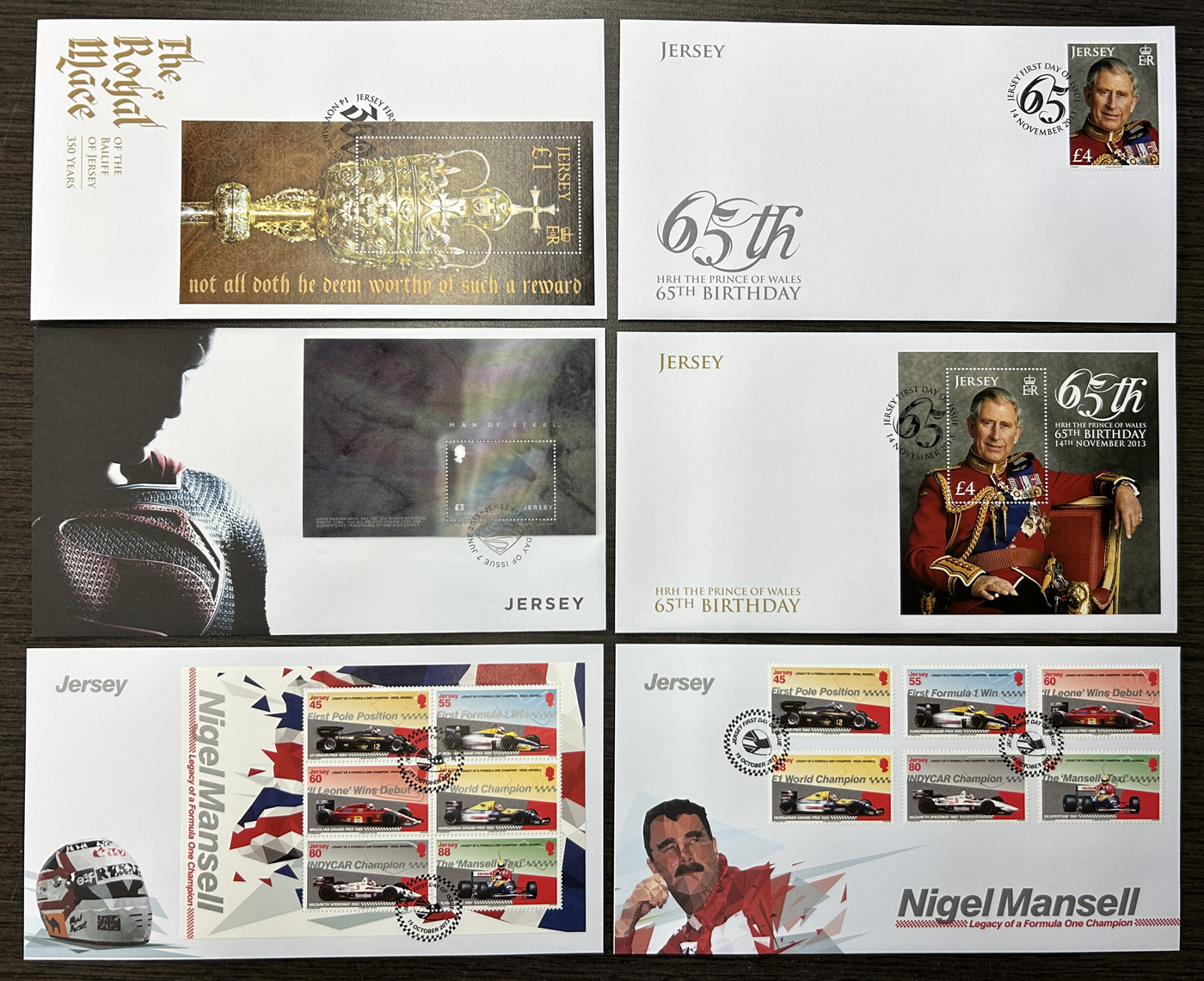 1319 CVR   imageCollection of 463 Different Jersey Unaddressed First Day Covers, 1976 to 2013, includes singles, complete sets, souvenir sheets, se-tenant multiples, etc. Appears quite complete for a long run, as these were purchased directly from the New Issue service. Also includes 5 oversize FDC and two dozen or so different aerogrames. A very fine and seldom offered collection. (Scan 1) (Scan 2) (All Scans)