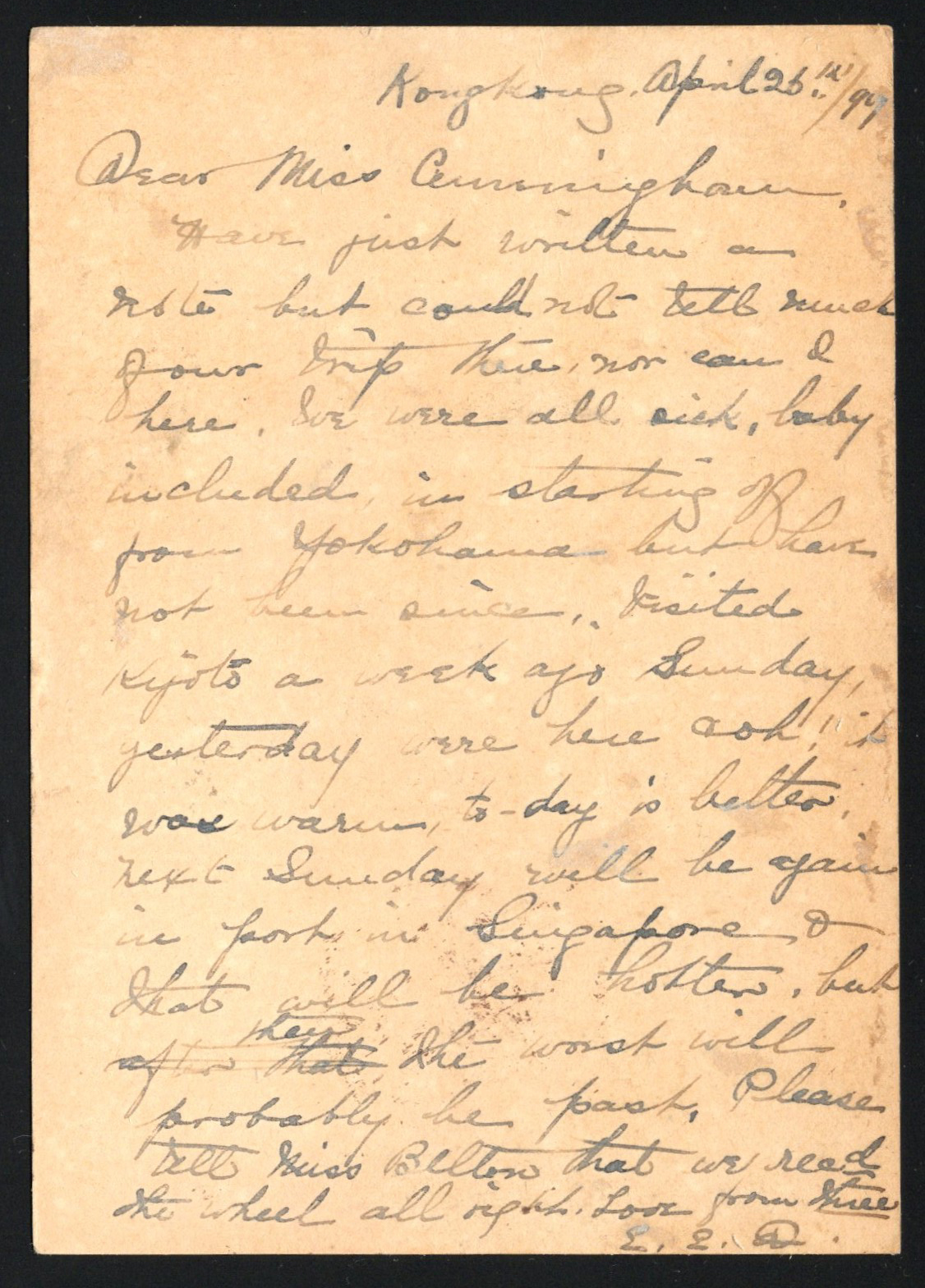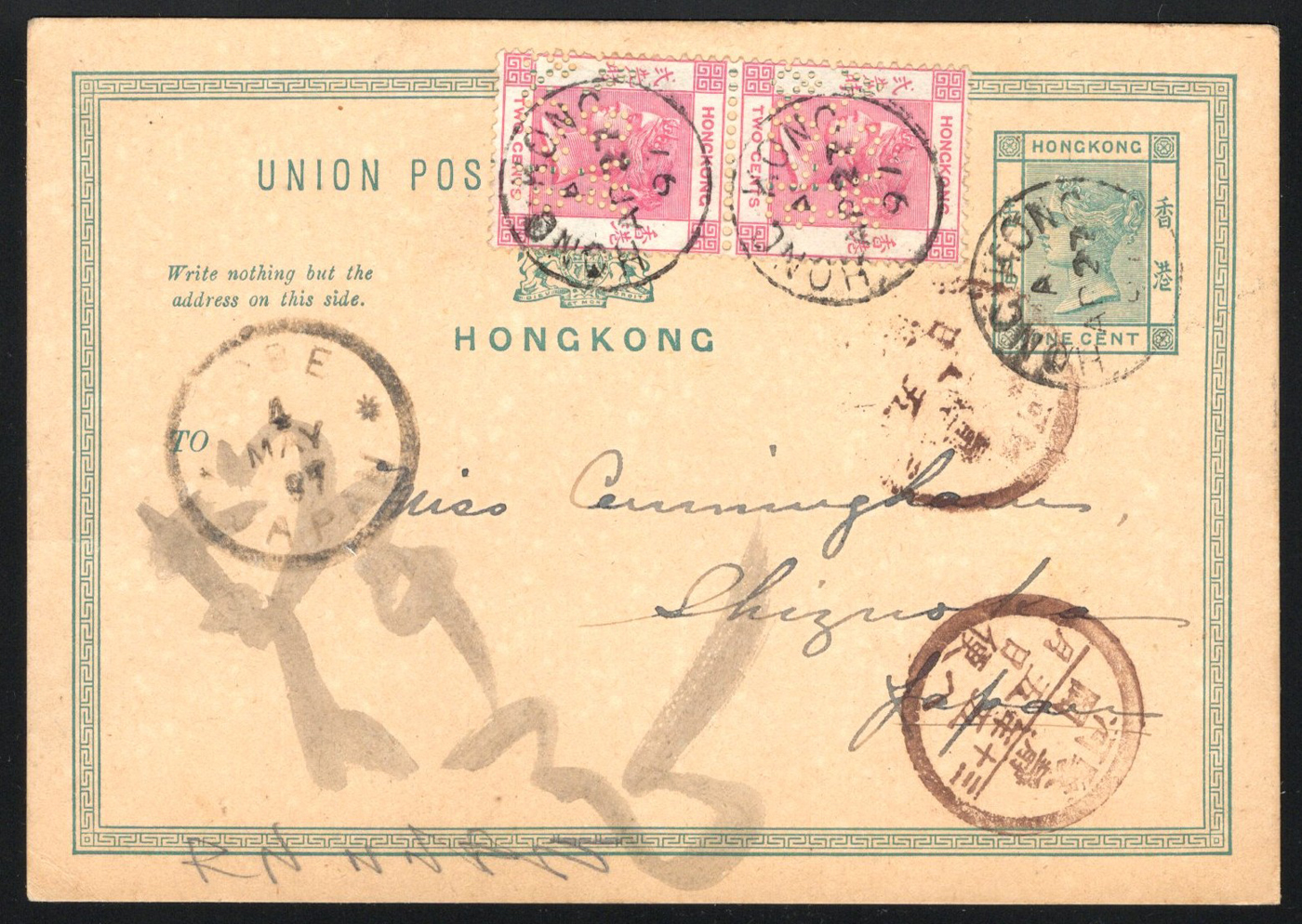 1320 PC   image1897 Perfin-Uprated Postal Card to Japan, a 1c green U.P.U. postal card mailed from Hong Kong on APR.27.1897 to Shizuoka, Japan, with MAY.4 Kobe transit and other markings. The card is uprated with a pair of 2c rose issues, each with "ASW & Co." perfin (A.S. Watson & Co. Ltd), each tied by a c.d.s., very fine. (Scan 1) (Scan 2) (All Scans)