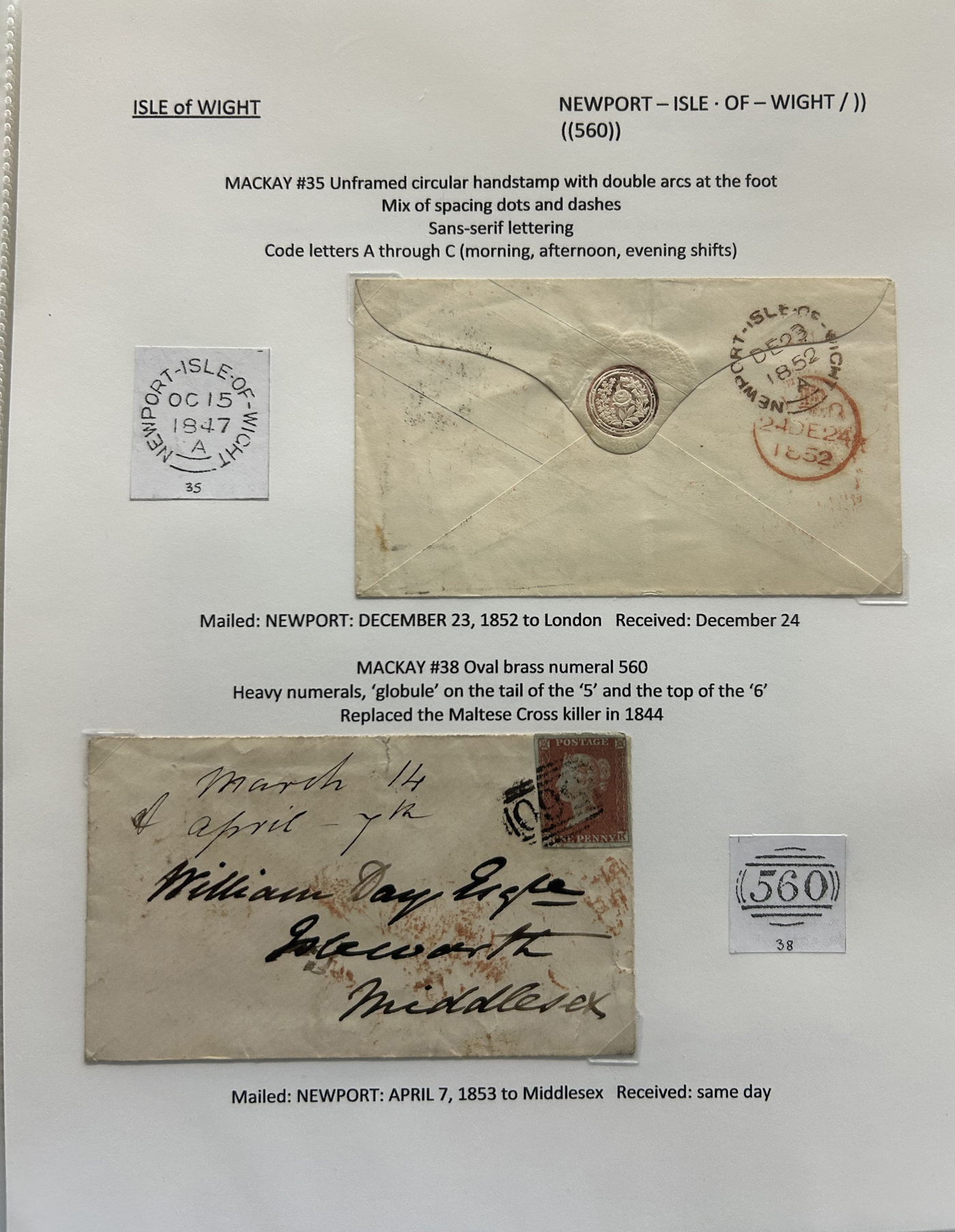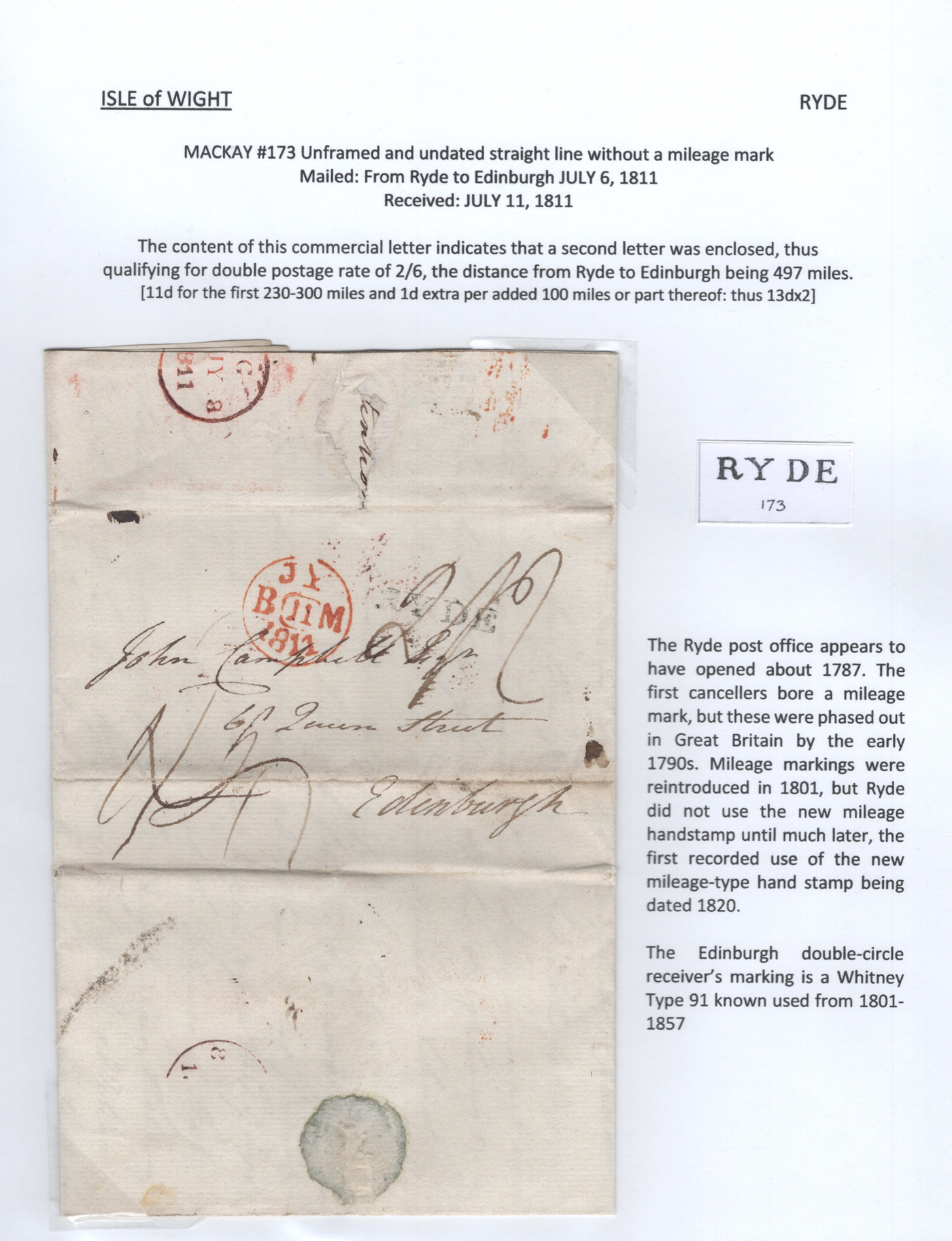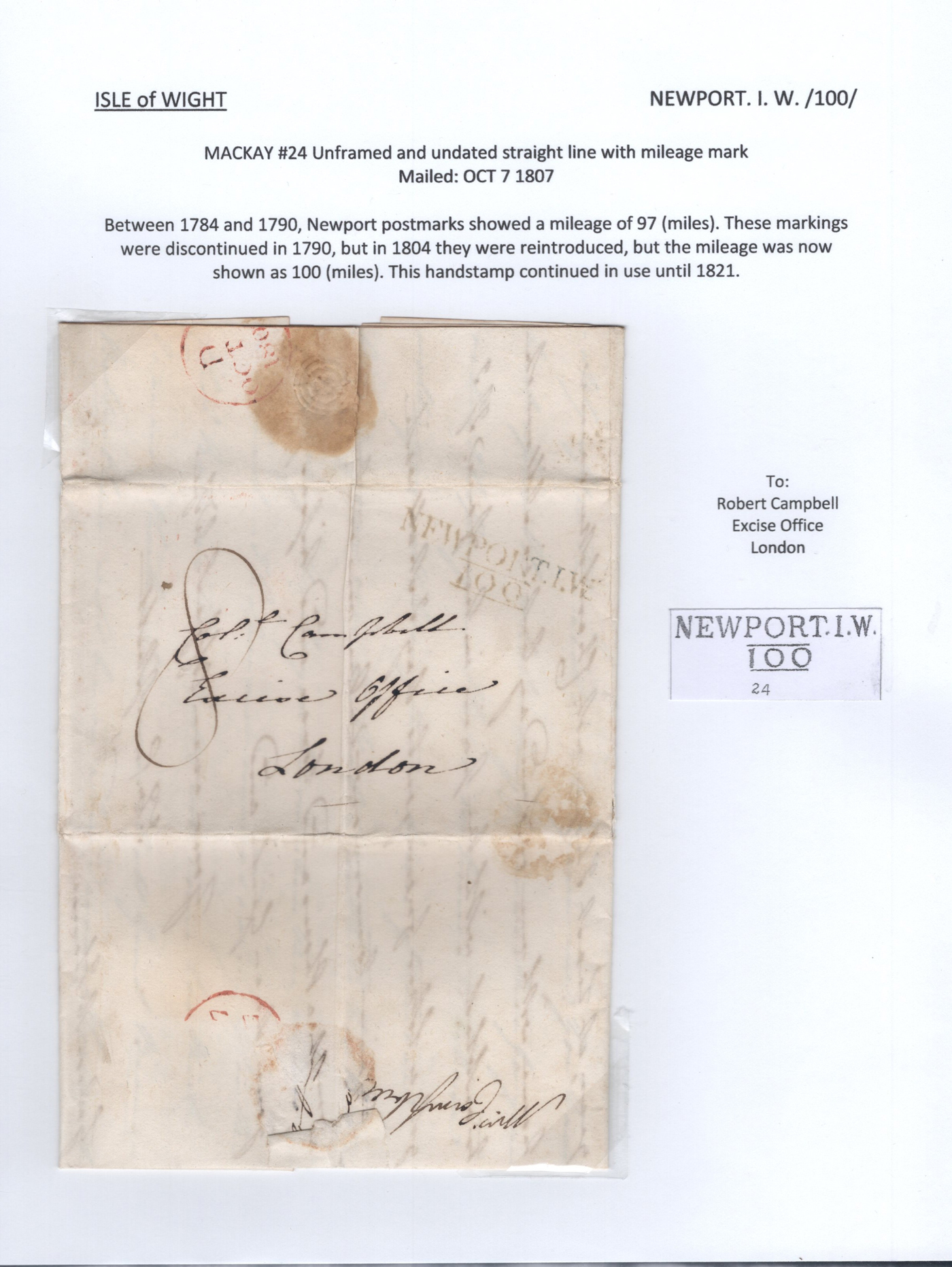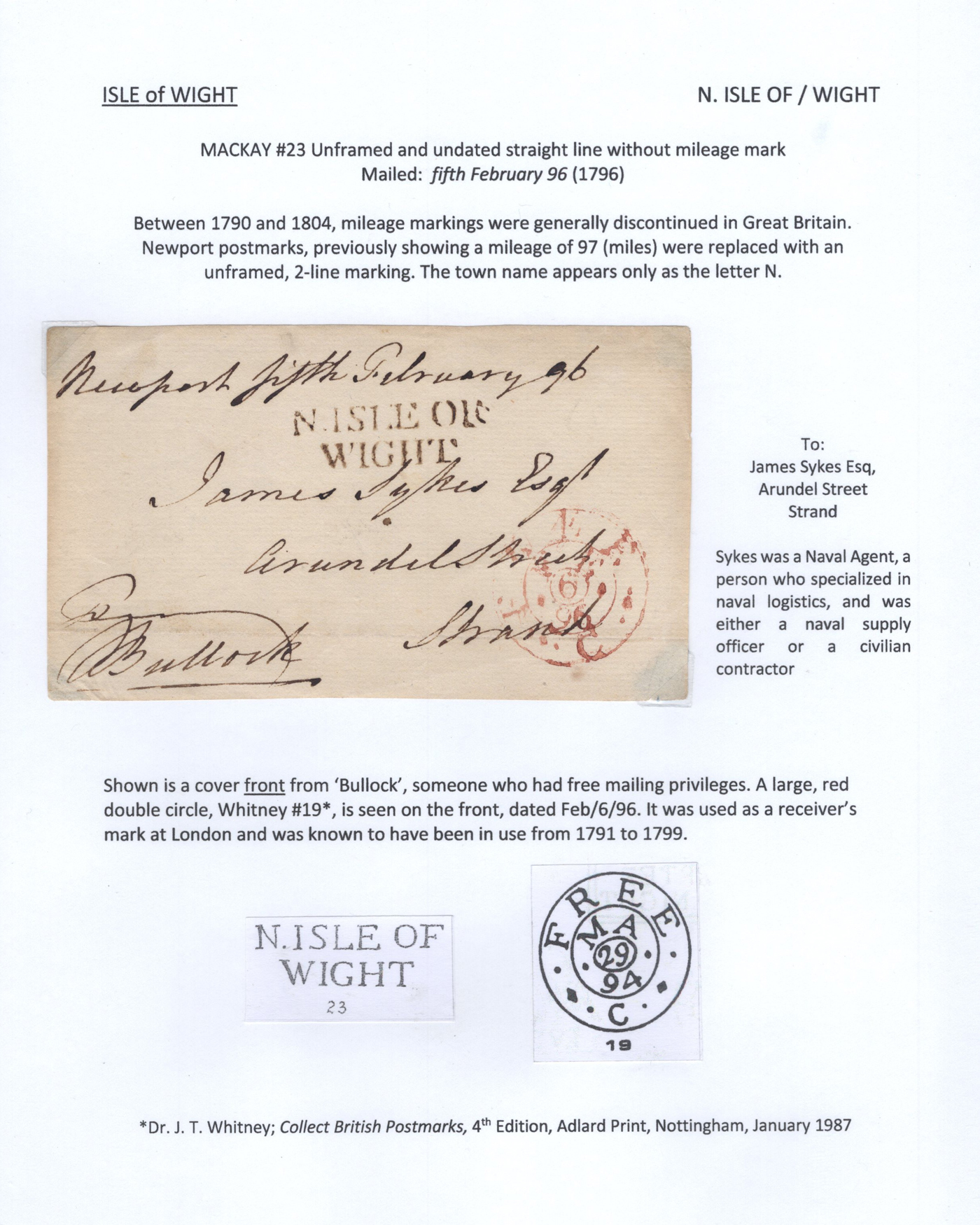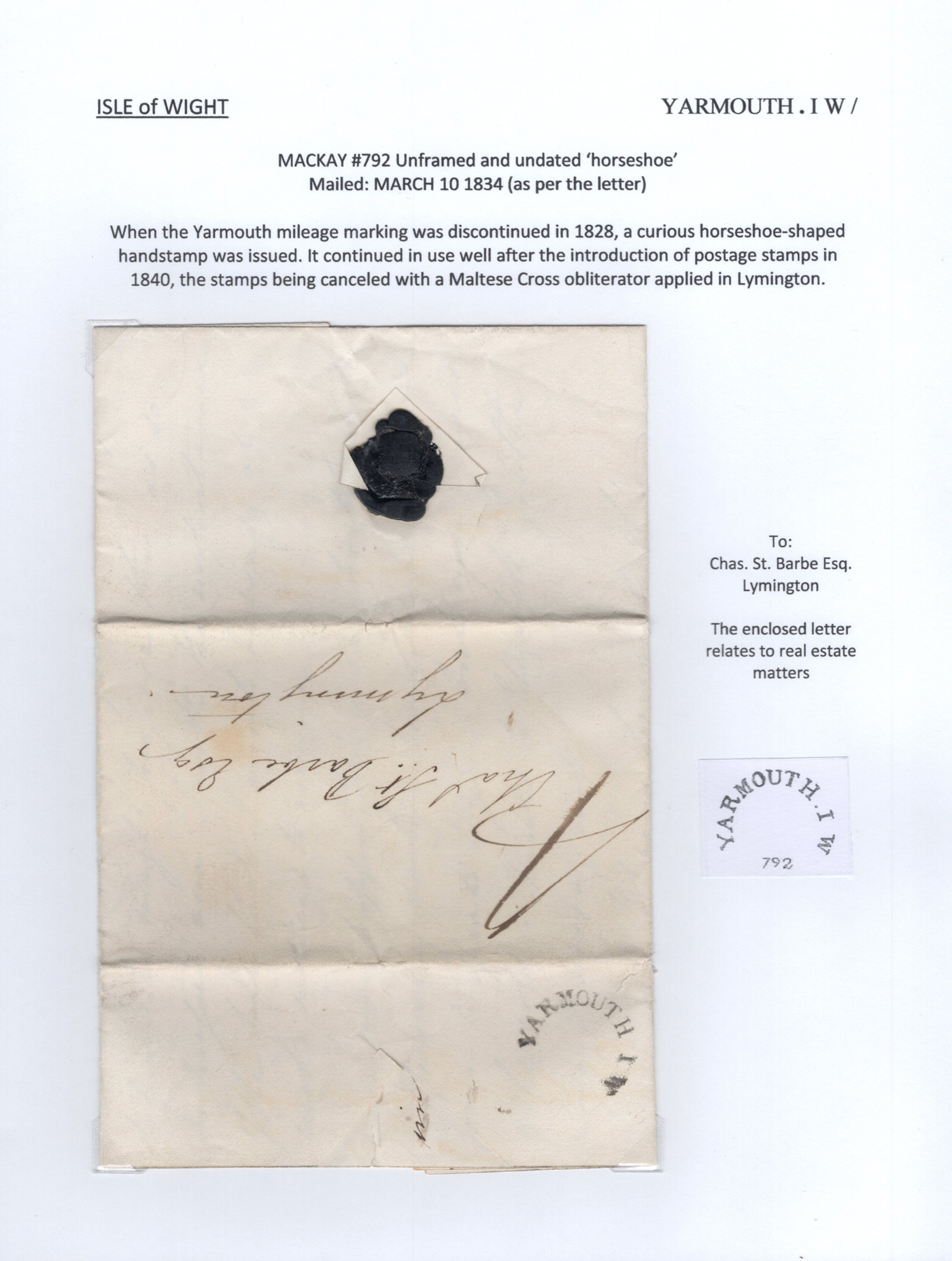 1301 CVR   imageCollection of 9 Isle of Wight Early Stampless Folded Letters, 1796 to 1837, all neatly written-up on pages, listed here with Mackay catalogue #s, 1821 "Cowes" straightline handstamp (#348), 1832 "Ship Letter / Cowes" boxed handstamp (#353), 1837 "Cowes" serifed double arc datestamp (#370), a 1796 front "N. Isle of / Wight" two-line handstamp (with large double circle FREE datestamp in red, #23)), 1807 "Newport / 100" 2-line handstamp (#24), 1831 Newport / Isle of Wight" serifed circular datestamp (#31), 1811 "Ryde" straightline handstamp (#173), 1807 "Yarmouth I.W. / 100" 2-line handstamp (#791), 1834 Yarmouth I.W" horseshoe handstamp (#792). A lovely collection of these scarce early markings, see photos as all items are scanned. Comes with the 1981 Isle of Wight 112-page handbook on the subject by James A. Mackay. (Scan 1) (Scan 2) (Scan 3) (Scan 4) (Scan 5) (Scan 6) (Scan 7) (Scan 8) (Scan 9) (Scan 10) (All Scans)