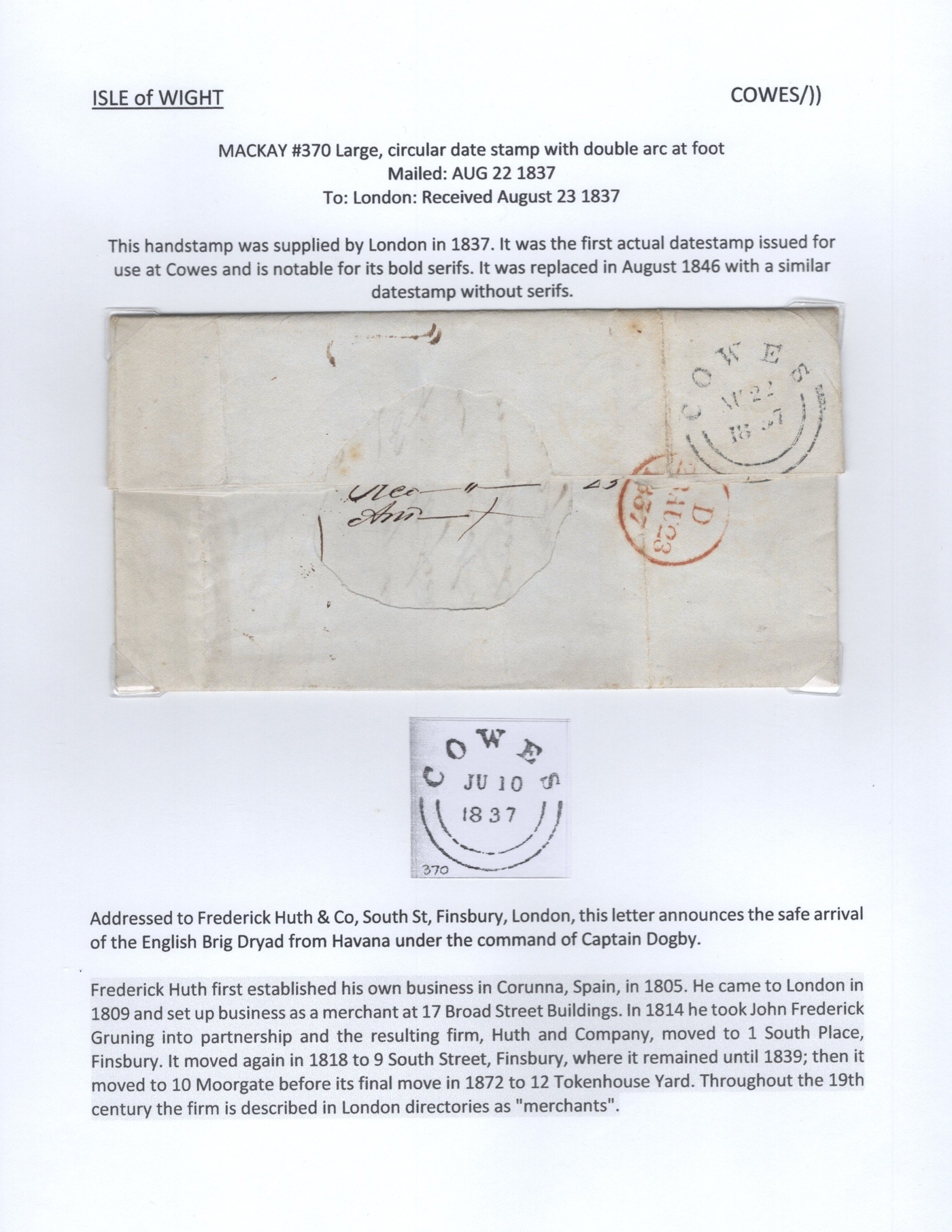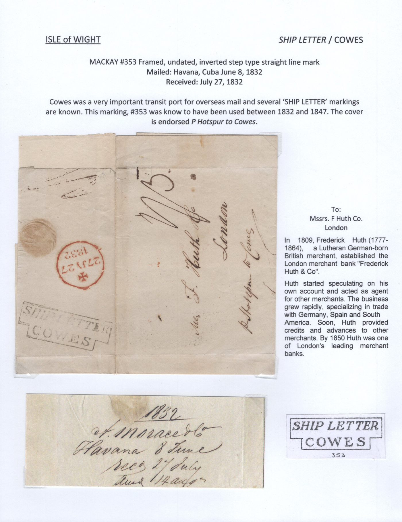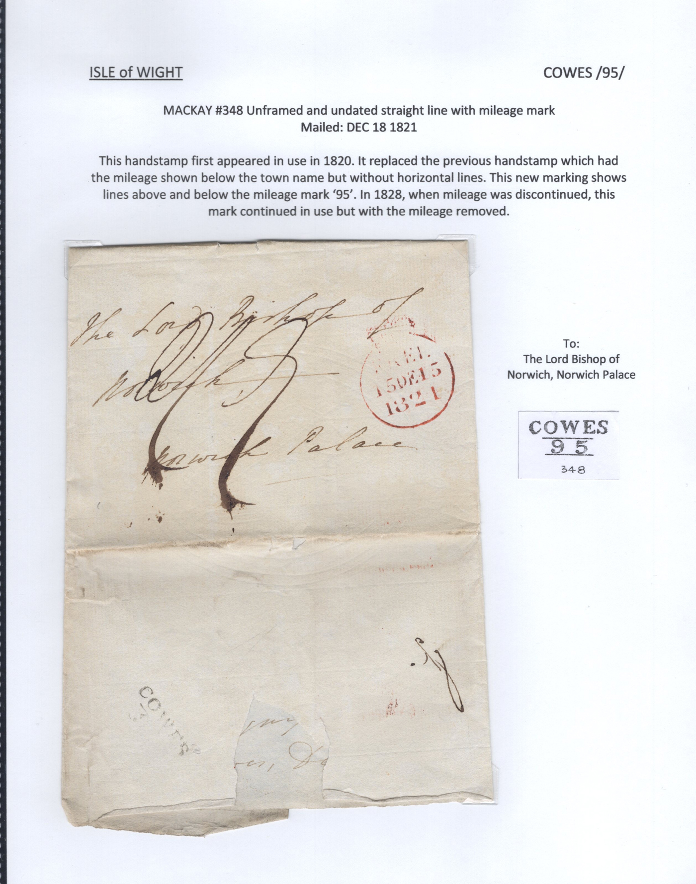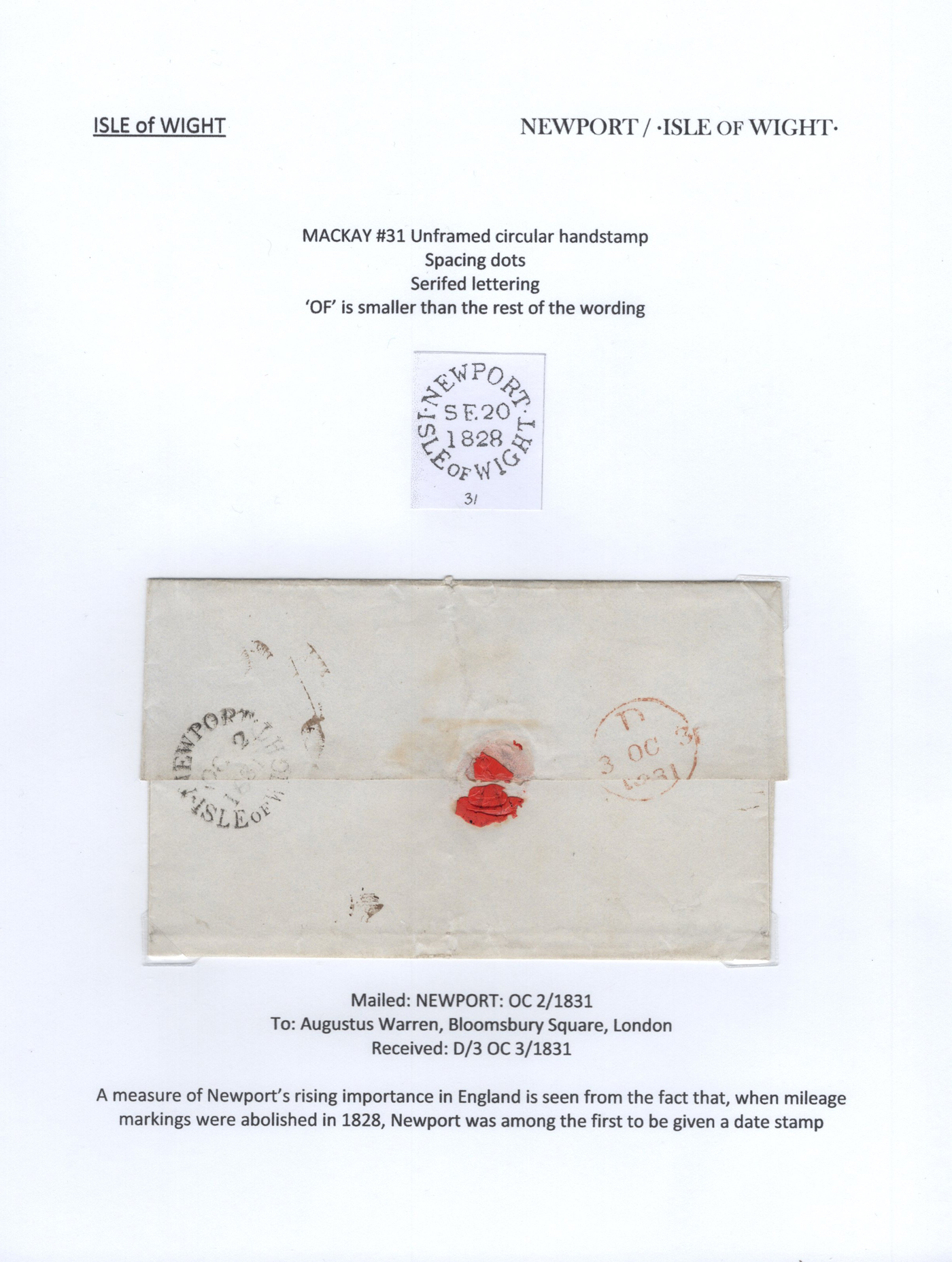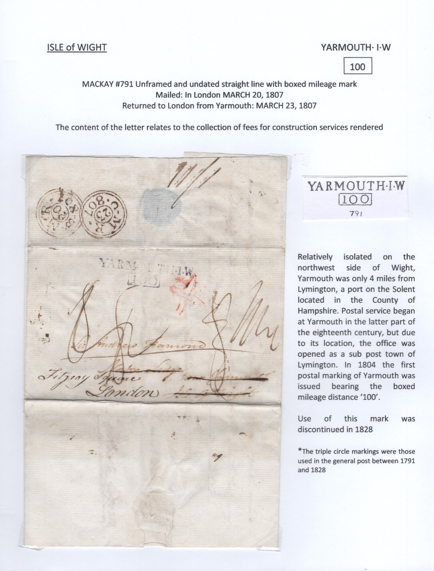 1301 CVR   imageCollection of 9 Isle of Wight Early Stampless Folded Letters, 1796 to 1837, all neatly written-up on pages, listed here with Mackay catalogue #s, 1821 "Cowes" straightline handstamp (#348), 1832 "Ship Letter / Cowes" boxed handstamp (#353), 1837 "Cowes" serifed double arc datestamp (#370), a 1796 front "N. Isle of / Wight" two-line handstamp (with large double circle FREE datestamp in red, #23)), 1807 "Newport / 100" 2-line handstamp (#24), 1831 Newport / Isle of Wight" serifed circular datestamp (#31), 1811 "Ryde" straightline handstamp (#173), 1807 "Yarmouth I.W. / 100" 2-line handstamp (#791), 1834 Yarmouth I.W" horseshoe handstamp (#792). A lovely collection of these scarce early markings, see photos as all items are scanned. Comes with the 1981 Isle of Wight 112-page handbook on the subject by James A. Mackay. (Scan 1) (Scan 2) (Scan 3) (Scan 4) (Scan 5) (Scan 6) (Scan 7) (Scan 8) (Scan 9) (Scan 10) (All Scans)