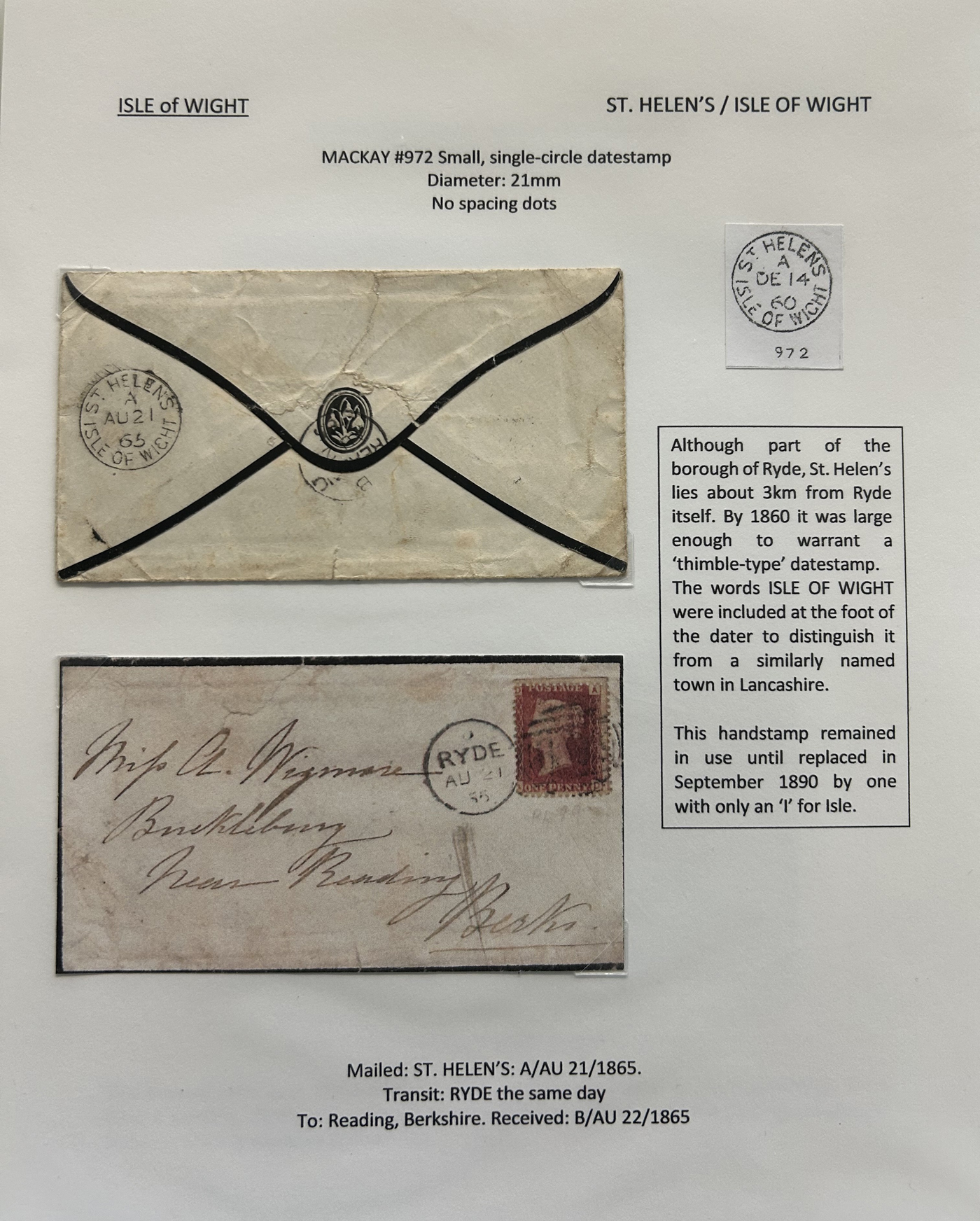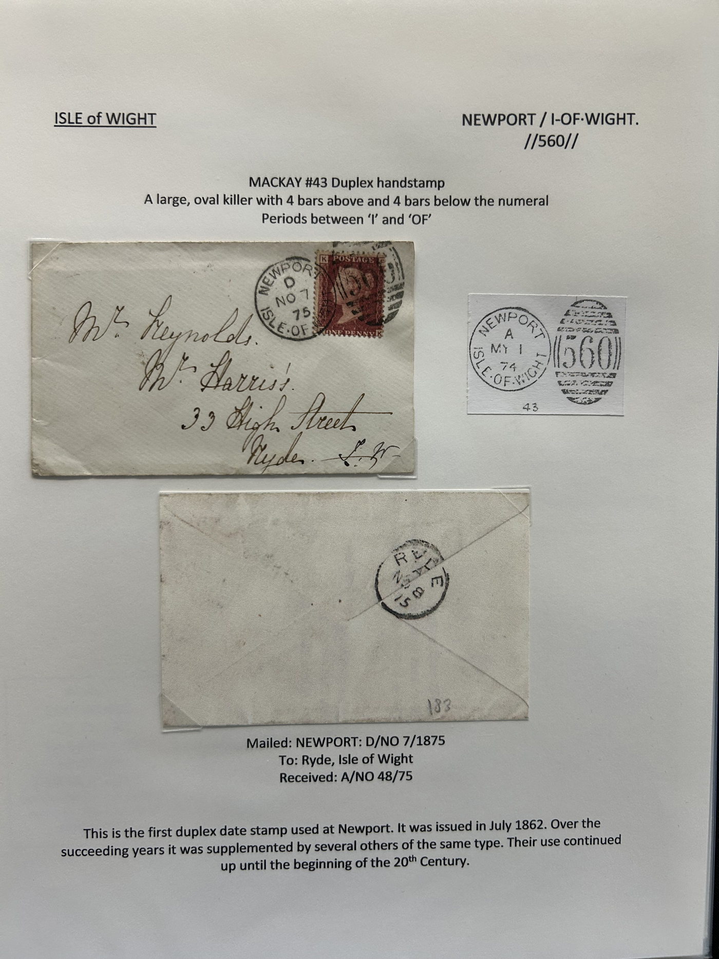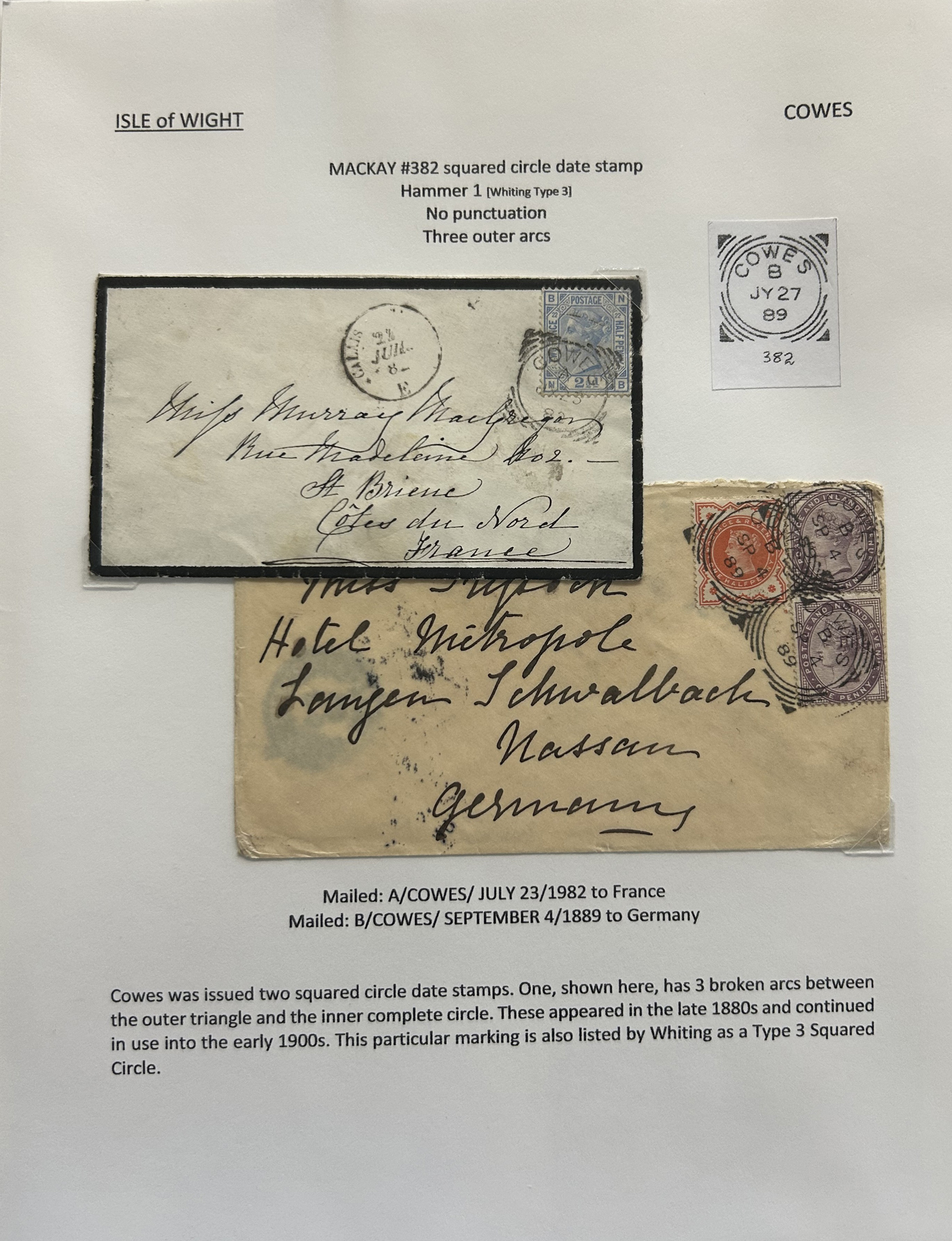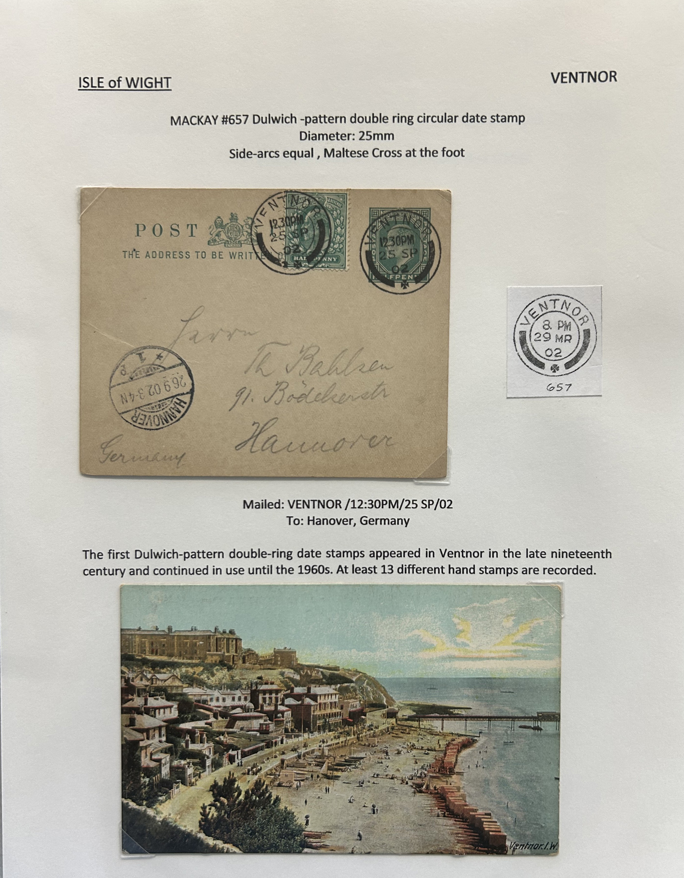 1302 CVR/PC   imageCollection of Isle of Wight Postal History, 1854 to 1971, with 77 items (62 written-up and 15 loose) all neatly and extensively written-up on pages, sorted alphabetically. All write-ups include Mackay catalogue numbers for the postmarks (book is offered in the previous lot), description of postmarks and much more. Starts with two postcards showing a map of the island, followed by various postmarks from Bembridge, Brading, Brightstone, Cowes, East Cowes, Freshwater Station (and variants), Gurnard, Newport, Niton, Niton-Undercliff, Osborne, Ryde, St Helen's, Sandown, Seaview, Shanklin, Shorewell, Strand, Totland Bay, Vectis Postal Service, Ventnor, Wooton Bridge, Wroxall and Yarmouth R.S.O. We note a good variety of postmark types, with duplex (incl. numeral), c.d.s., grid numerals, double-circles, machines, , oval registration, etc. on a variety of material, including mourning covers, registered covers, destinations (Germany, Argentina, Canada, USA, France, etc.), and much more. Nice quality throughout, including the postmarks. See our many photos to get a good idea of the contents of this lot. (Scan 1) (Scan 2) (Scan 3) (Scan 4) (Scan 5) (Scan 6) (Scan 7) (Scan 8) (Scan 9) (Scan 10) (Scan 11) (Scan 12) (Scan 13) (Scan 14) (Scan 15) (All Scans)