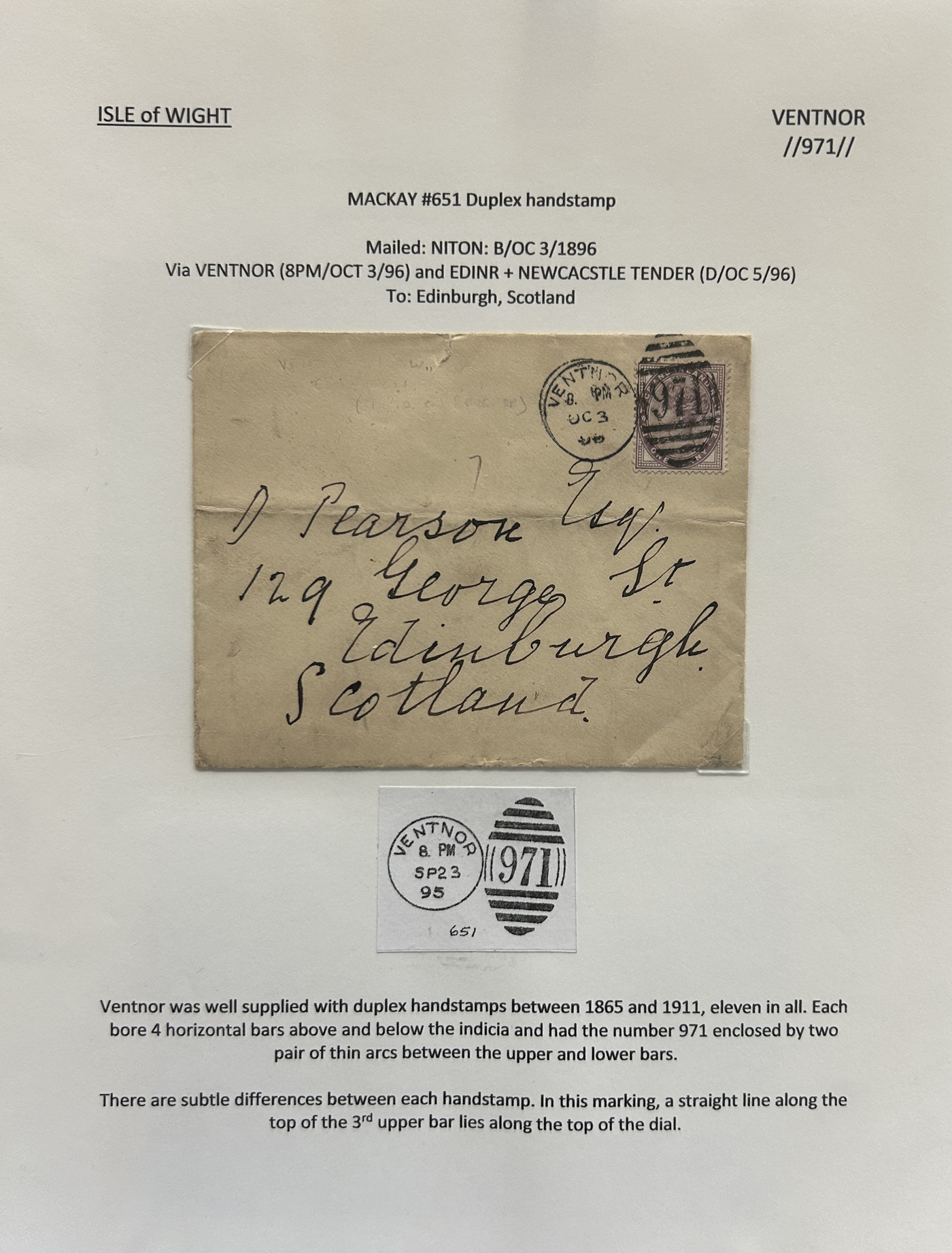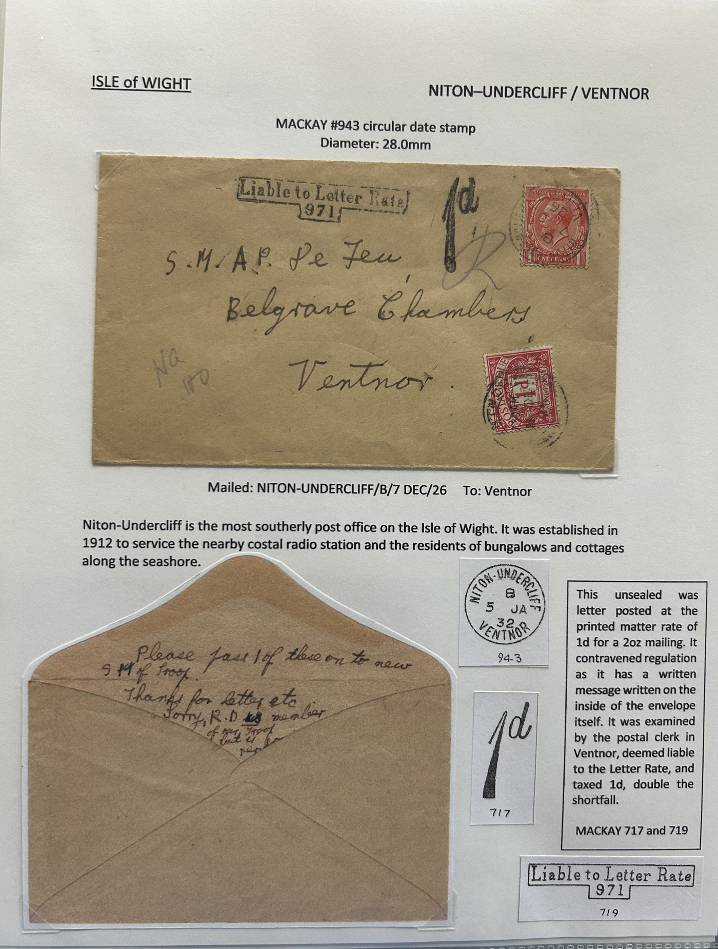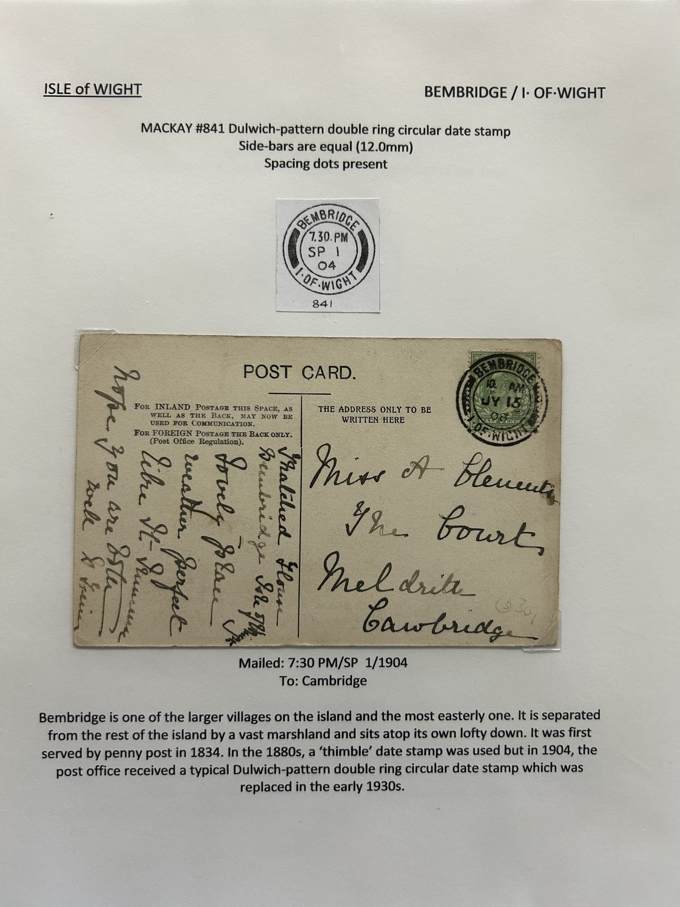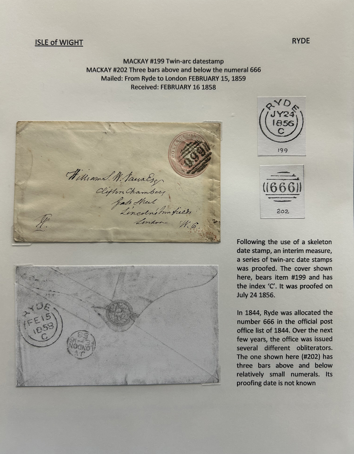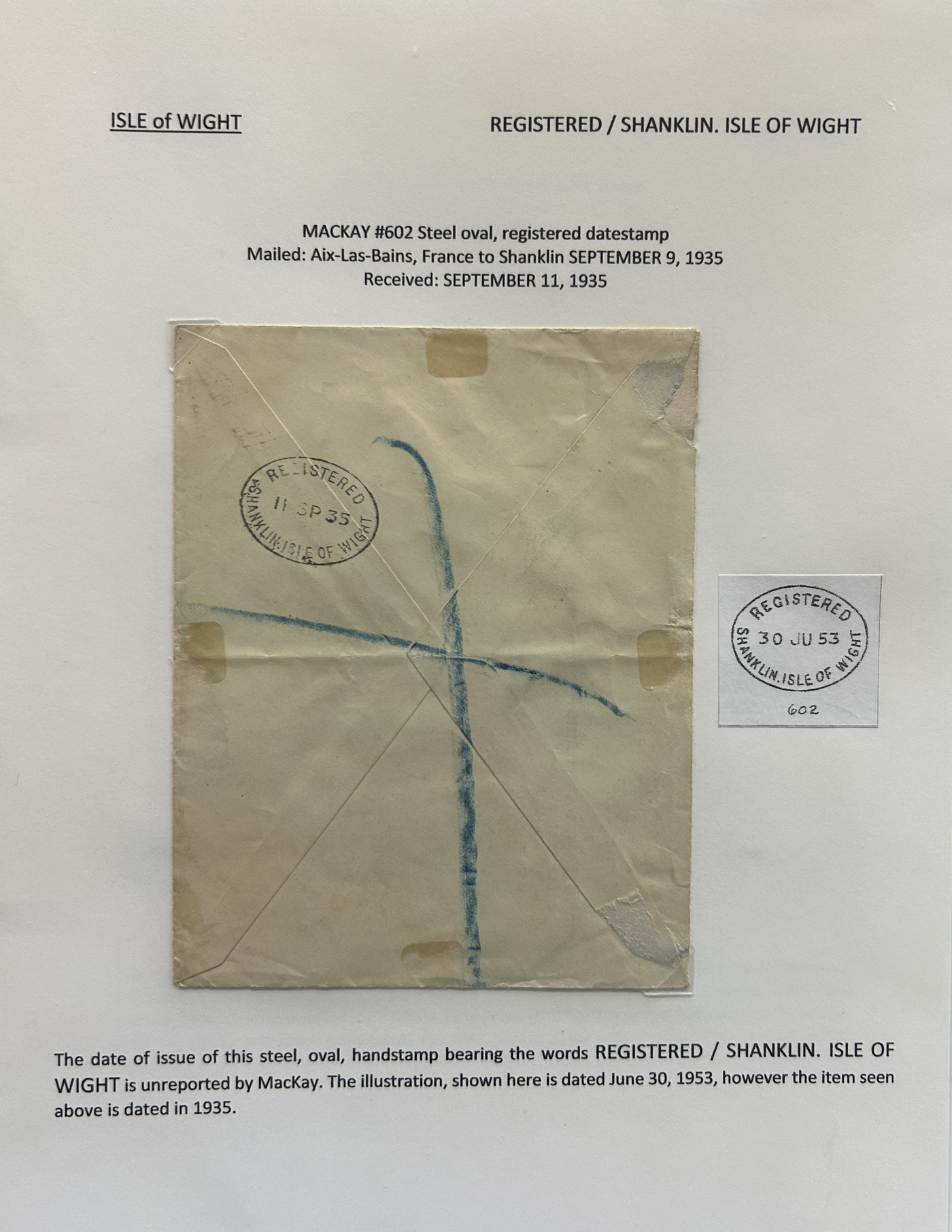 1302 CVR/PC   imageCollection of Isle of Wight Postal History, 1854 to 1971, with 77 items (62 written-up and 15 loose) all neatly and extensively written-up on pages, sorted alphabetically. All write-ups include Mackay catalogue numbers for the postmarks (book is offered in the previous lot), description of postmarks and much more. Starts with two postcards showing a map of the island, followed by various postmarks from Bembridge, Brading, Brightstone, Cowes, East Cowes, Freshwater Station (and variants), Gurnard, Newport, Niton, Niton-Undercliff, Osborne, Ryde, St Helen's, Sandown, Seaview, Shanklin, Shorewell, Strand, Totland Bay, Vectis Postal Service, Ventnor, Wooton Bridge, Wroxall and Yarmouth R.S.O. We note a good variety of postmark types, with duplex (incl. numeral), c.d.s., grid numerals, double-circles, machines, , oval registration, etc. on a variety of material, including mourning covers, registered covers, destinations (Germany, Argentina, Canada, USA, France, etc.), and much more. Nice quality throughout, including the postmarks. See our many photos to get a good idea of the contents of this lot. (Scan 1) (Scan 2) (Scan 3) (Scan 4) (Scan 5) (Scan 6) (Scan 7) (Scan 8) (Scan 9) (Scan 10) (Scan 11) (Scan 12) (Scan 13) (Scan 14) (Scan 15) (All Scans)