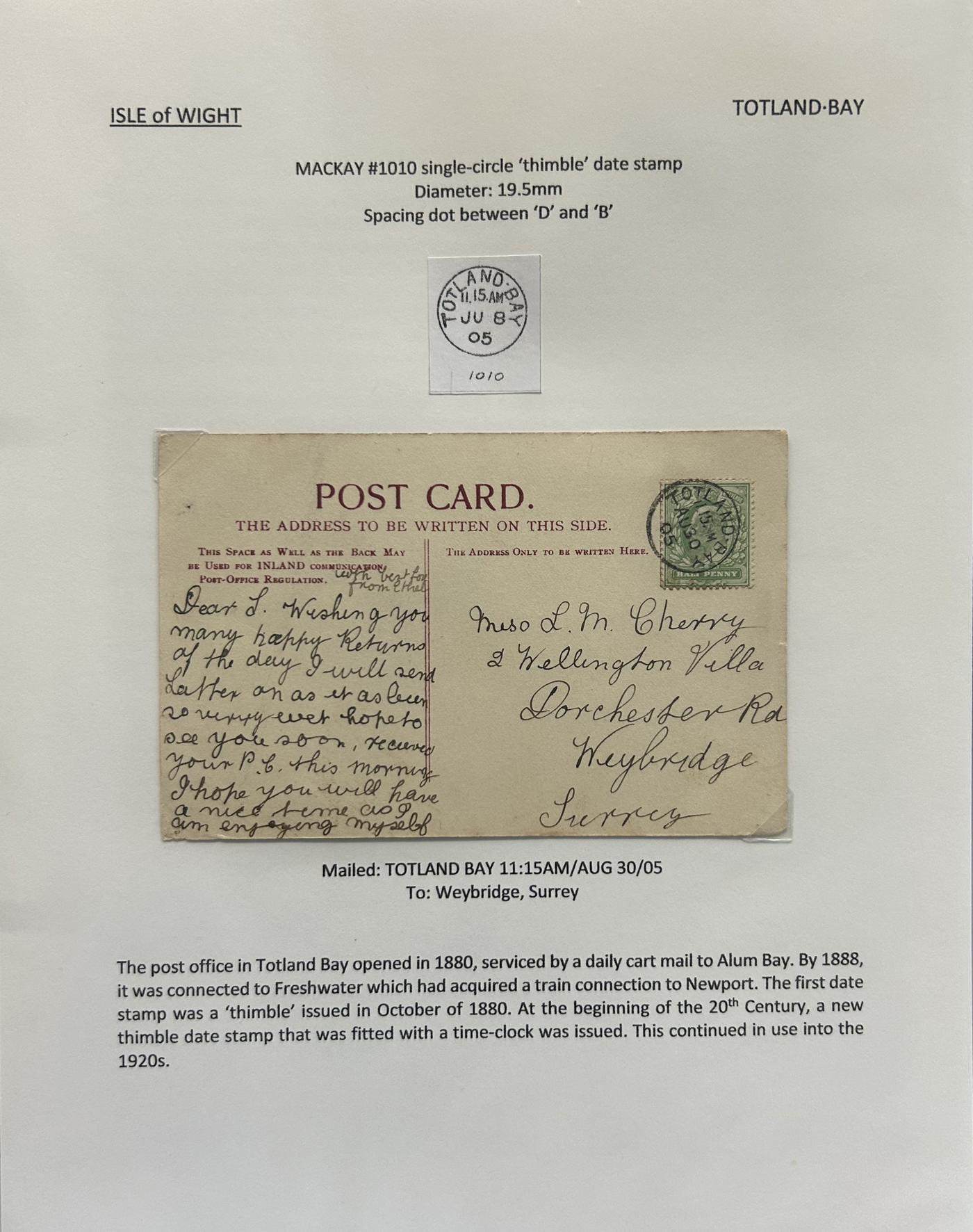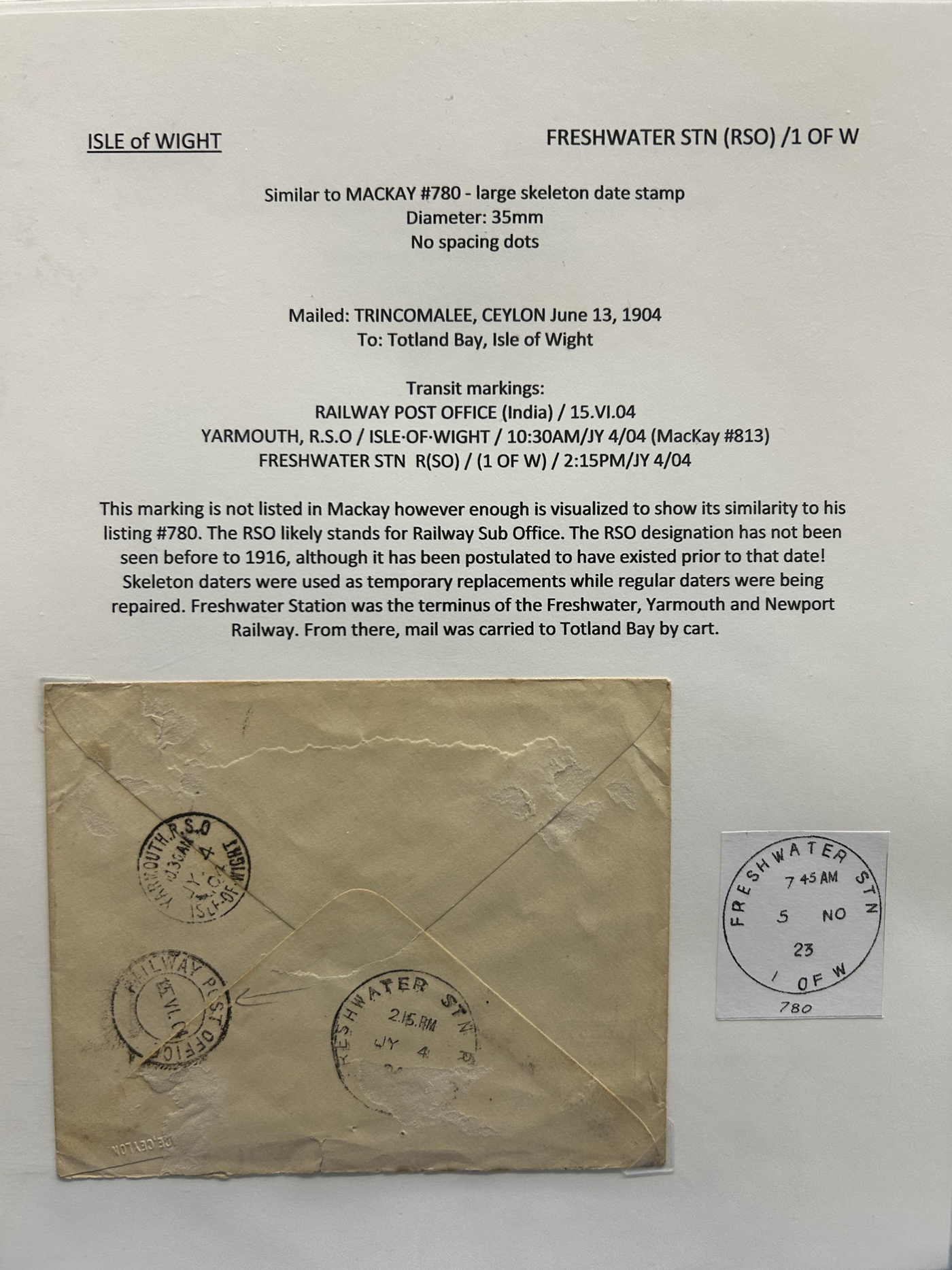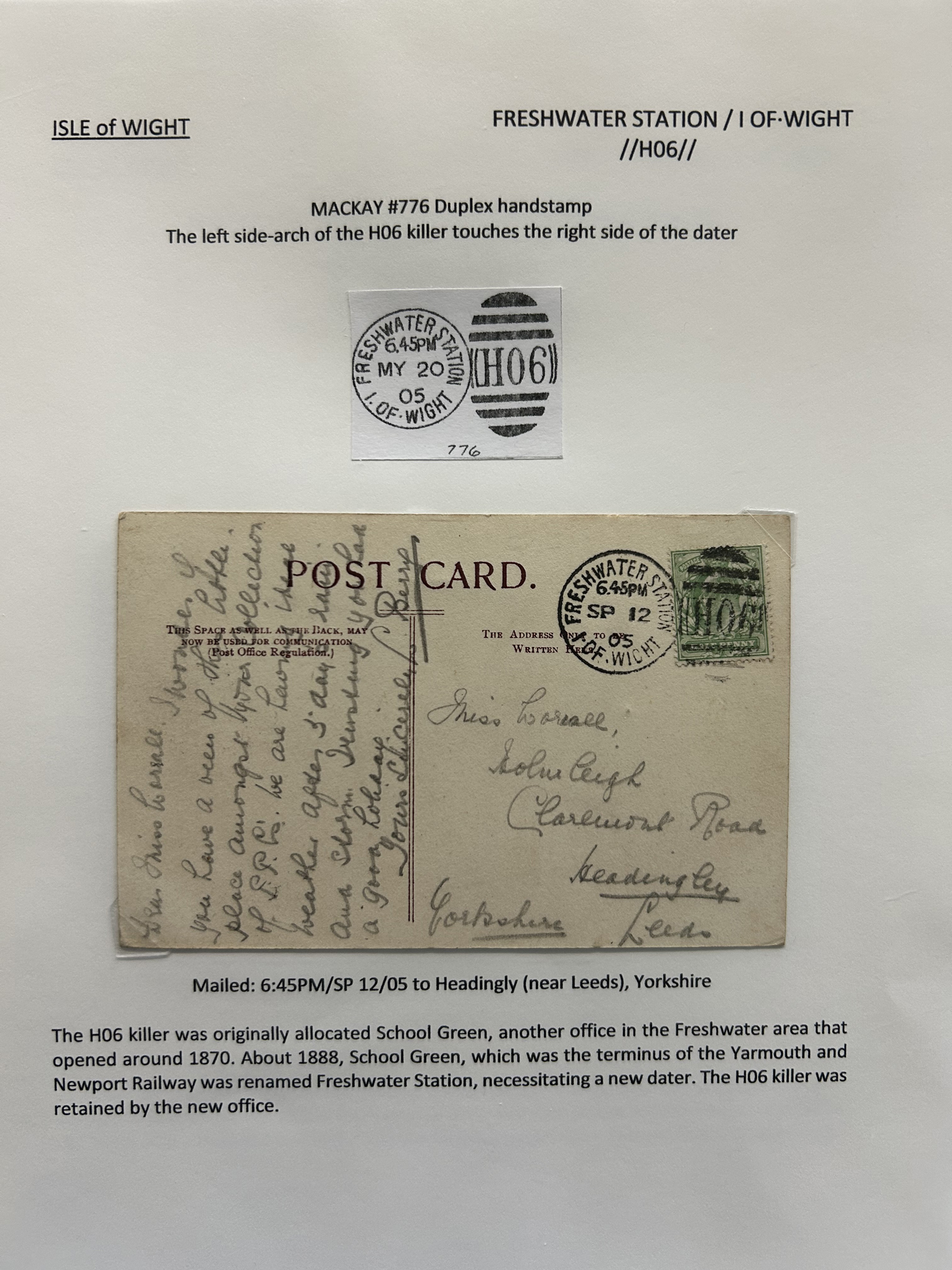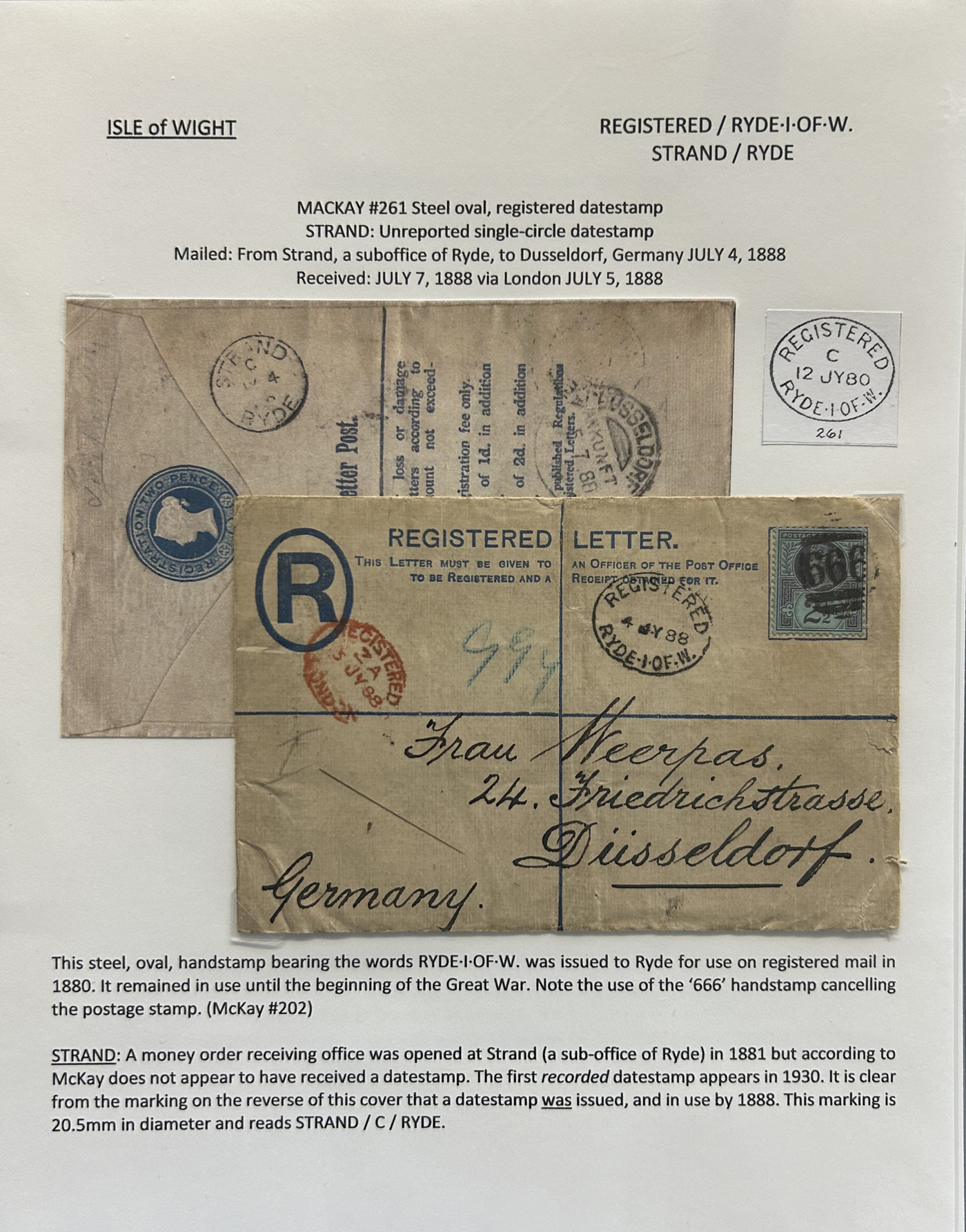 1302 CVR/PC   imageCollection of Isle of Wight Postal History, 1854 to 1971, with 77 items (62 written-up and 15 loose) all neatly and extensively written-up on pages, sorted alphabetically. All write-ups include Mackay catalogue numbers for the postmarks (book is offered in the previous lot), description of postmarks and much more. Starts with two postcards showing a map of the island, followed by various postmarks from Bembridge, Brading, Brightstone, Cowes, East Cowes, Freshwater Station (and variants), Gurnard, Newport, Niton, Niton-Undercliff, Osborne, Ryde, St Helen's, Sandown, Seaview, Shanklin, Shorewell, Strand, Totland Bay, Vectis Postal Service, Ventnor, Wooton Bridge, Wroxall and Yarmouth R.S.O. We note a good variety of postmark types, with duplex (incl. numeral), c.d.s., grid numerals, double-circles, machines, , oval registration, etc. on a variety of material, including mourning covers, registered covers, destinations (Germany, Argentina, Canada, USA, France, etc.), and much more. Nice quality throughout, including the postmarks. See our many photos to get a good idea of the contents of this lot. (Scan 1) (Scan 2) (Scan 3) (Scan 4) (Scan 5) (Scan 6) (Scan 7) (Scan 8) (Scan 9) (Scan 10) (Scan 11) (Scan 12) (Scan 13) (Scan 14) (Scan 15) (All Scans)