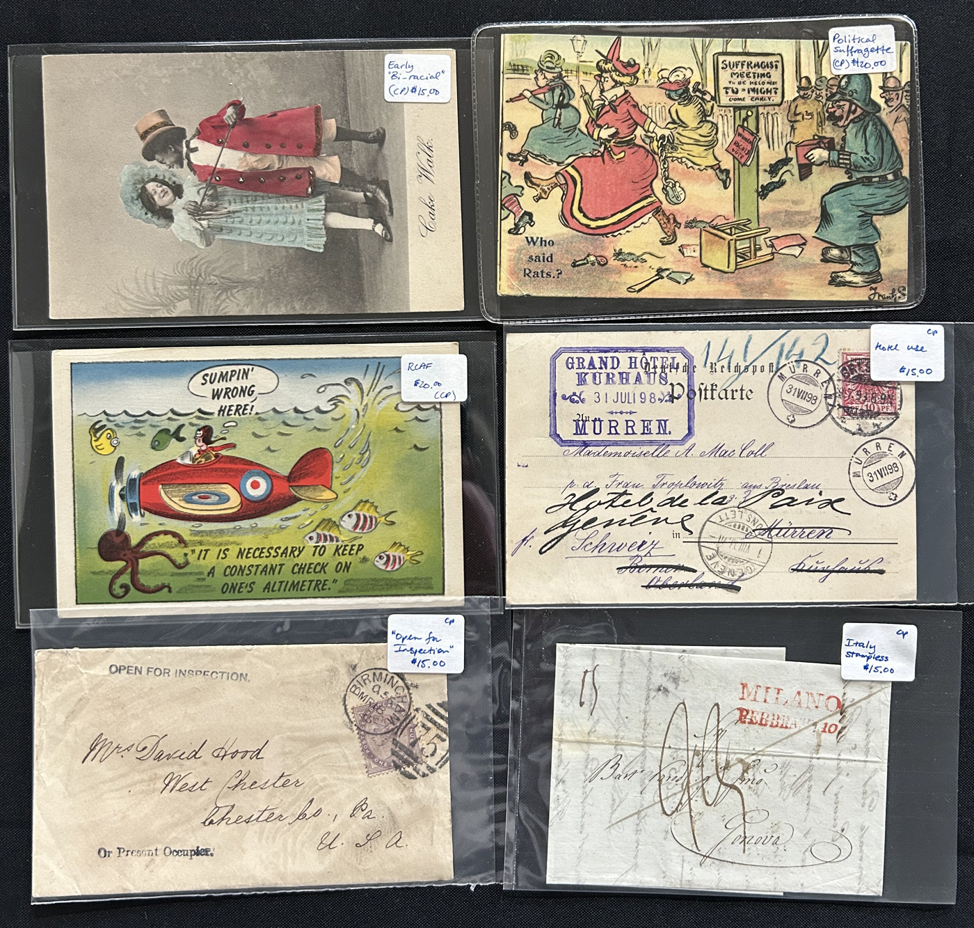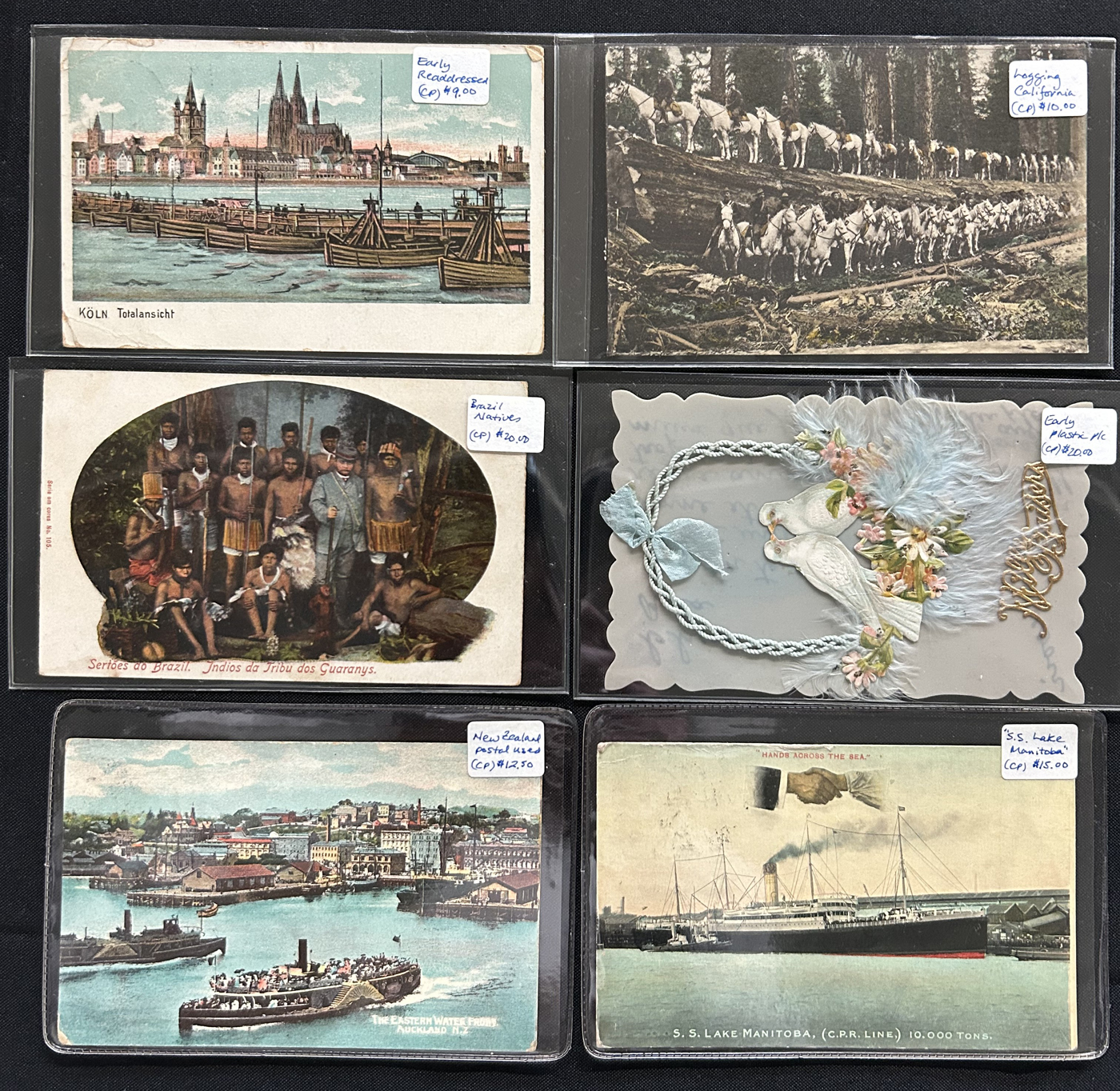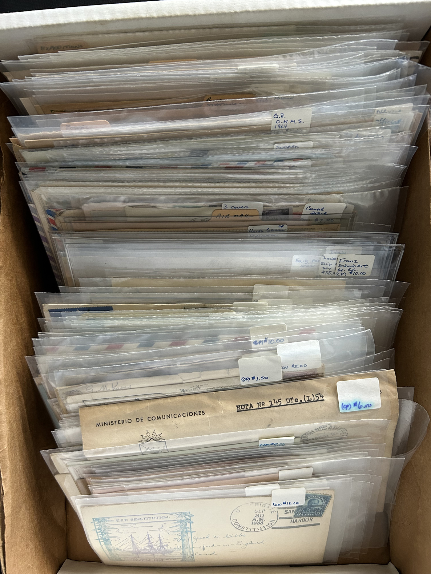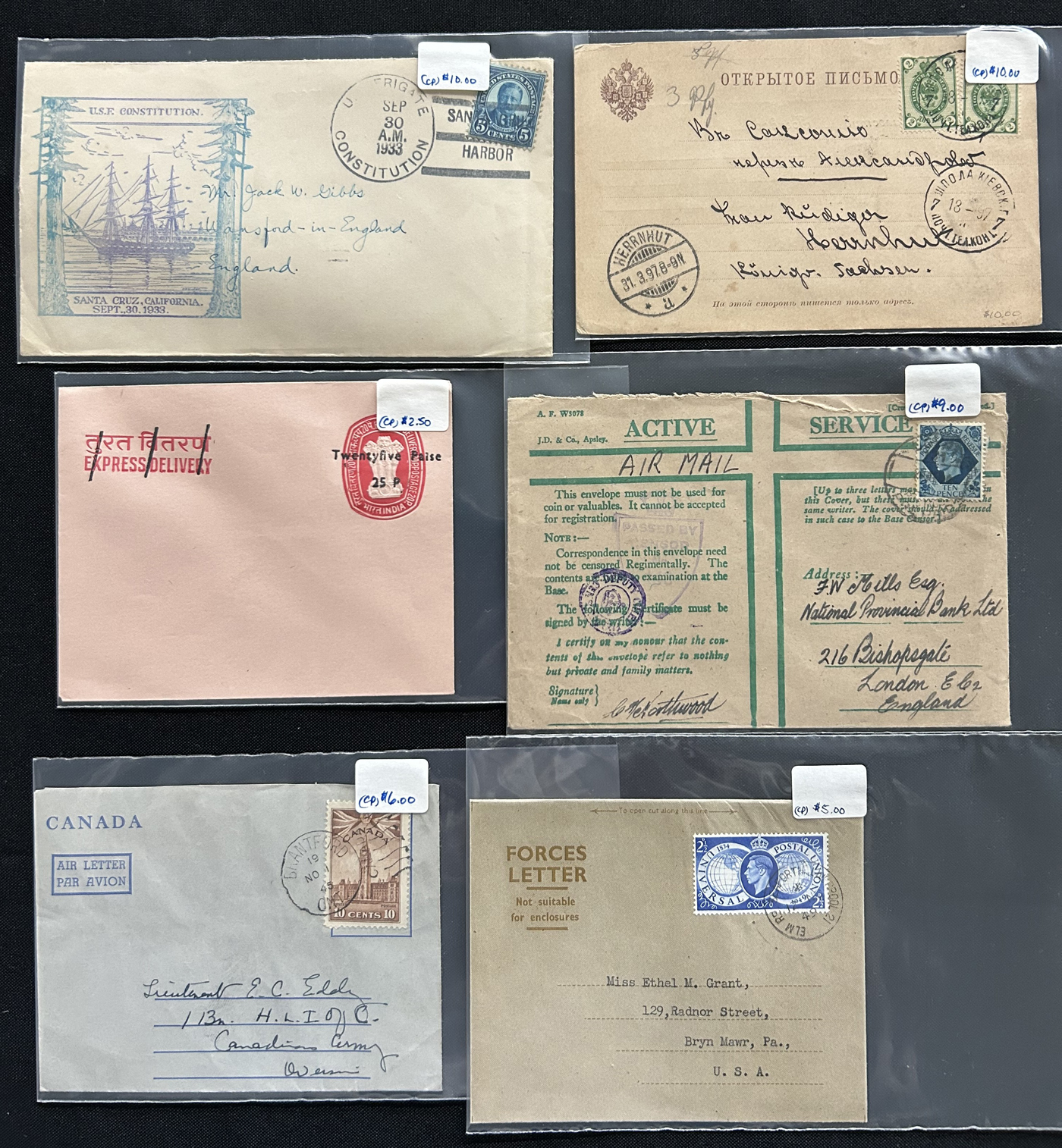 1352 CVR/PC   imageRetired Dealer Stock of Over 300 Worldwide Covers and Cards, all in sleeves with the vast majority priced from $5 to $10, with some below or above that. We note Airmail, stationery covers and cards, picture postcards, variety of countries, WWII military mail, ship mail, stampless, Official envelopes, and much more. Quality is overall fine, with some having faults (priced appropriately), see our online photos for a small sampling. From the estate of a dealer who closed his shop in the mid-1990s. (Scan 1) (Scan 2) (Scan 3) (Scan 4) (Scan 5) (Scan 6) (Scan 7) (Scan 8) (All Scans)