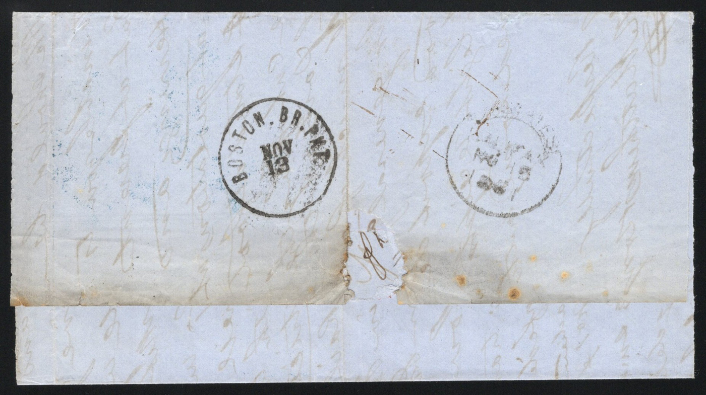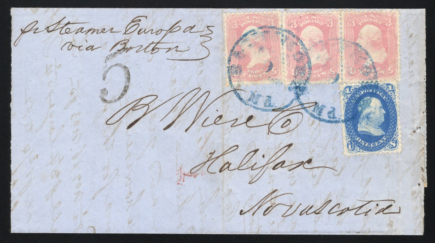 1345 CVR 63, 65 image1861 10c Rate Cover to Canada, a folded letter mailed from Baltimore MD on NOV.9.1861 to Halifax NS, endorsed "per Steamer Europa via Boston", with Boston Br. Pkt NOV.13 transit c.d.s. and Halifax NOV.15 receiver on back. The letter is franked with a single 1c Franklin and three 3c Washington issues paying the cross border 10c rate, with a "5" (due) rate handstamp as well. Missing part of the letter, still fine, with well centered stamps. (Scan 1) (Scan 2) (All Scans)