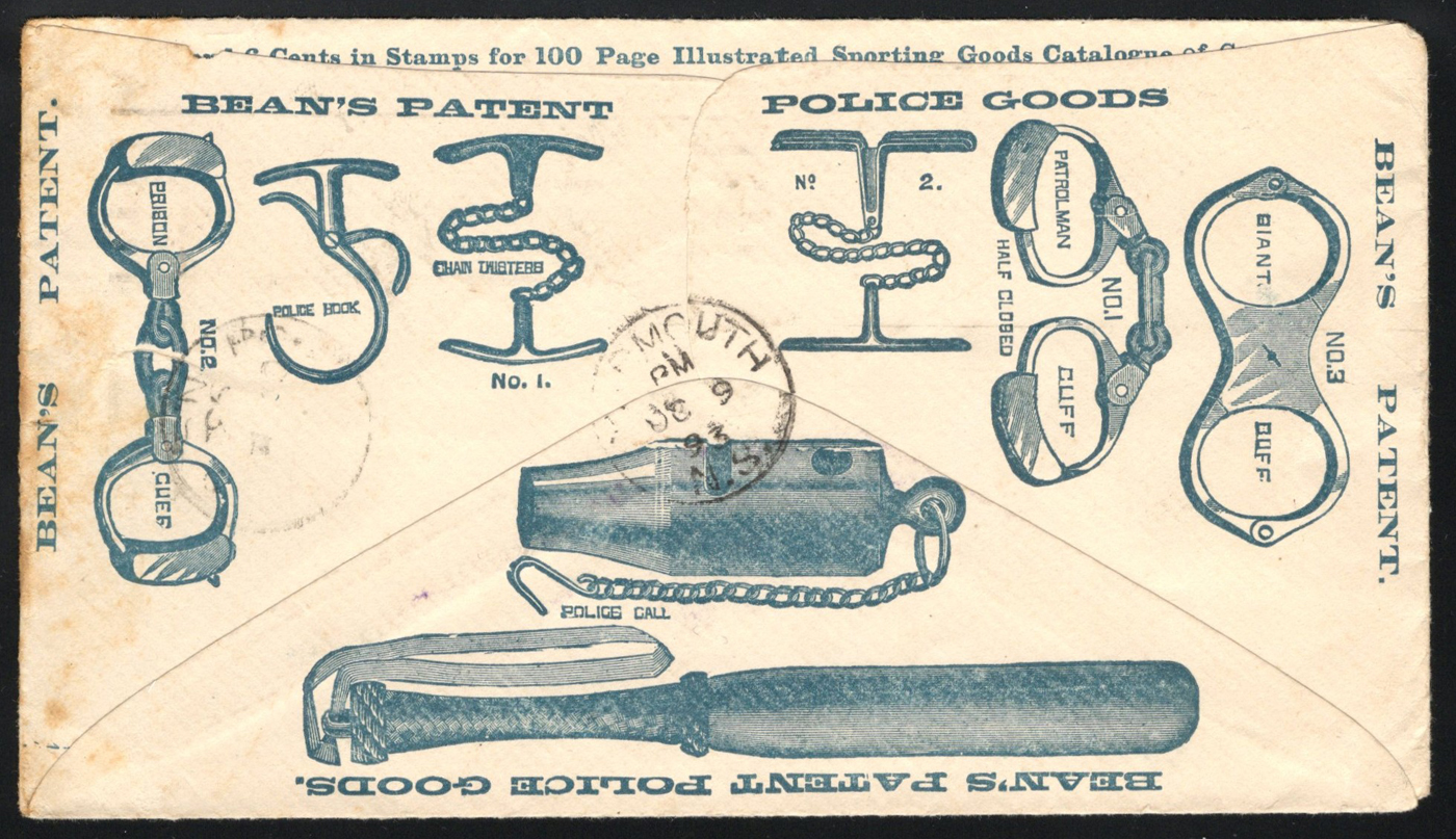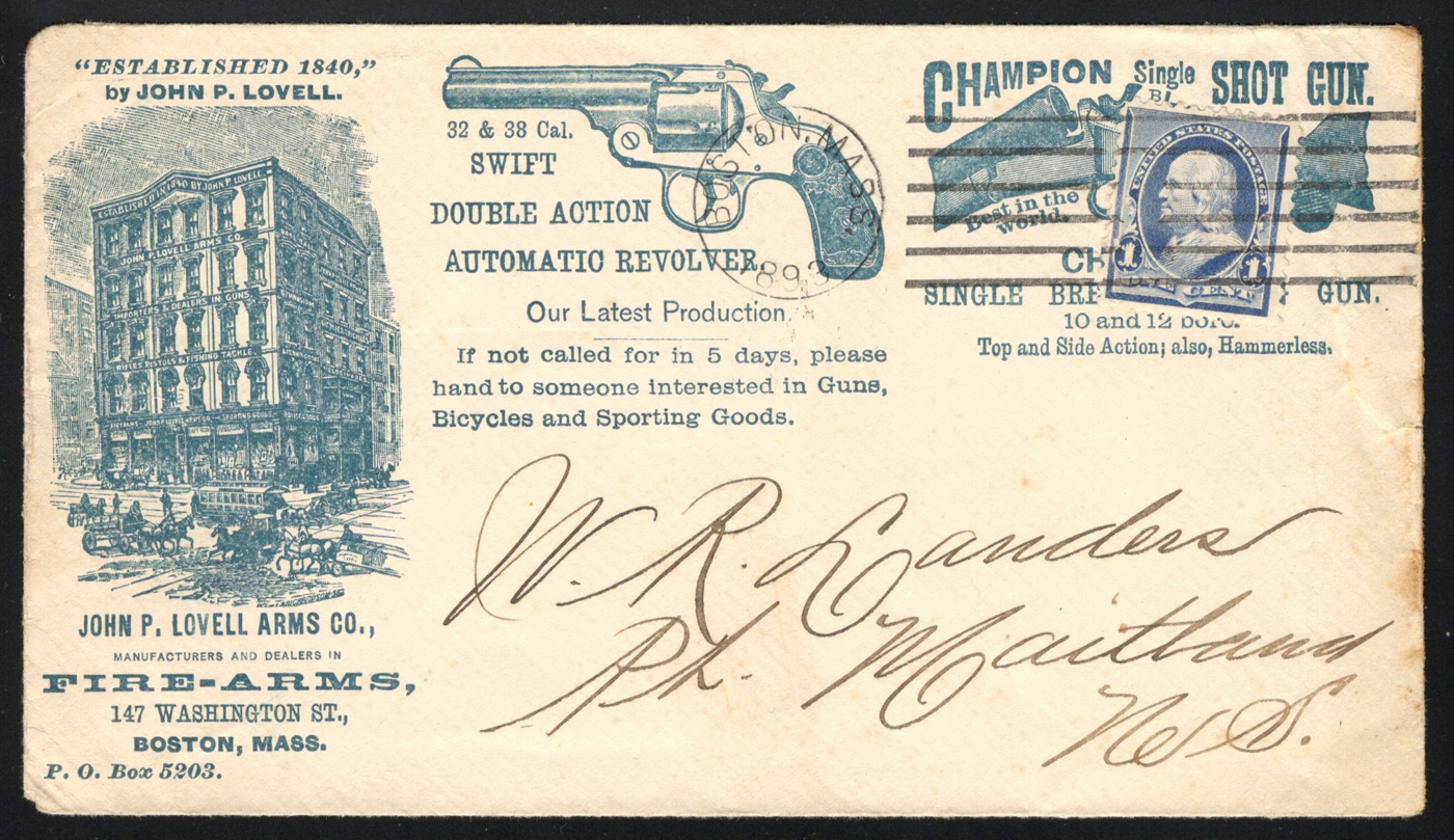 1347 CVR 219 image1893 1c Printed Matter Rate Illustrated Advertising Cover to Canada, an unsealed envelope mailed Boston in 1893 (dateless machine cancel) to Yarmouth, Nova Scotia, with OCT.9.1893 receiver on back. The cover is illustrated on both sides for fire arms and police goods (handcuffs, whistles and the "Swift double action revolver"), and is franked with a 1c blue Franklin. Tiny bit of foxing on one edge, else a very fine and attractive cover. (Scan 1) (Scan 2) (All Scans)